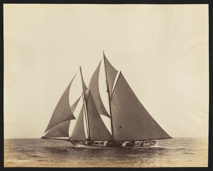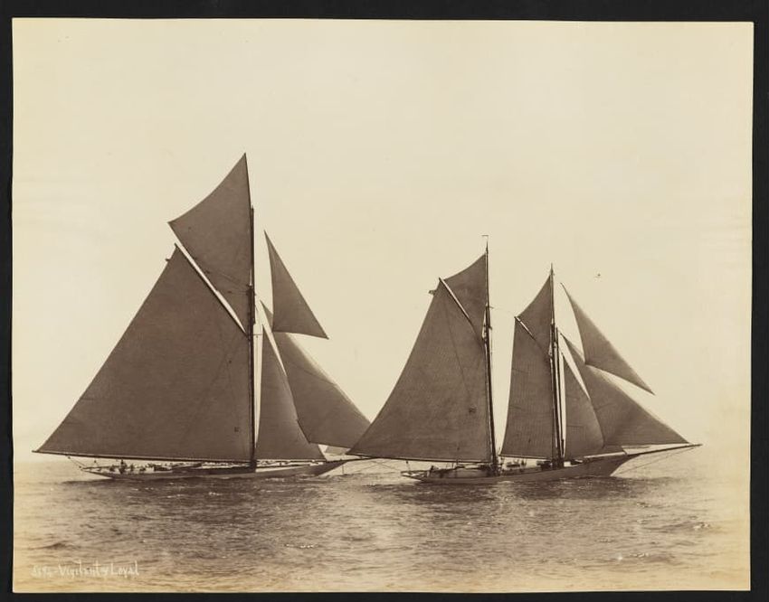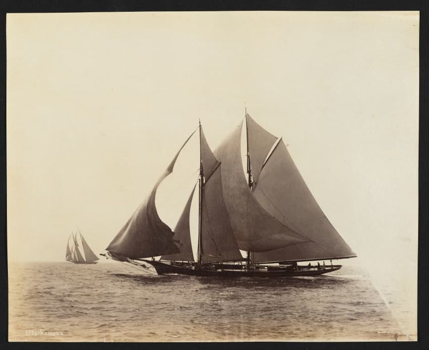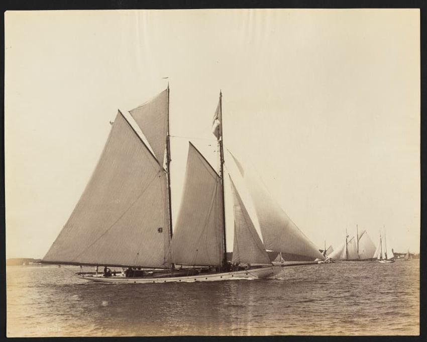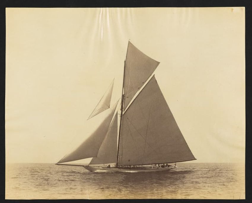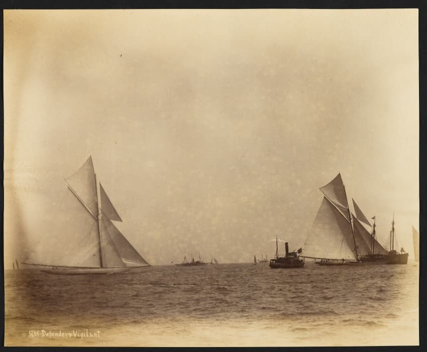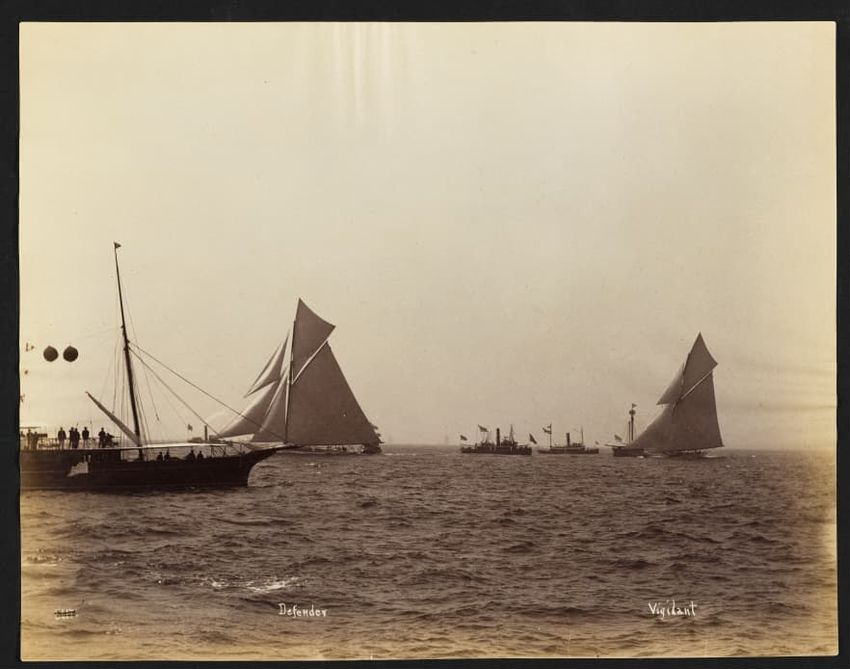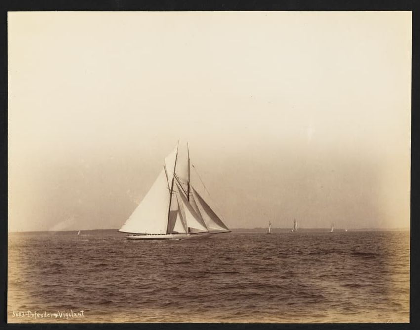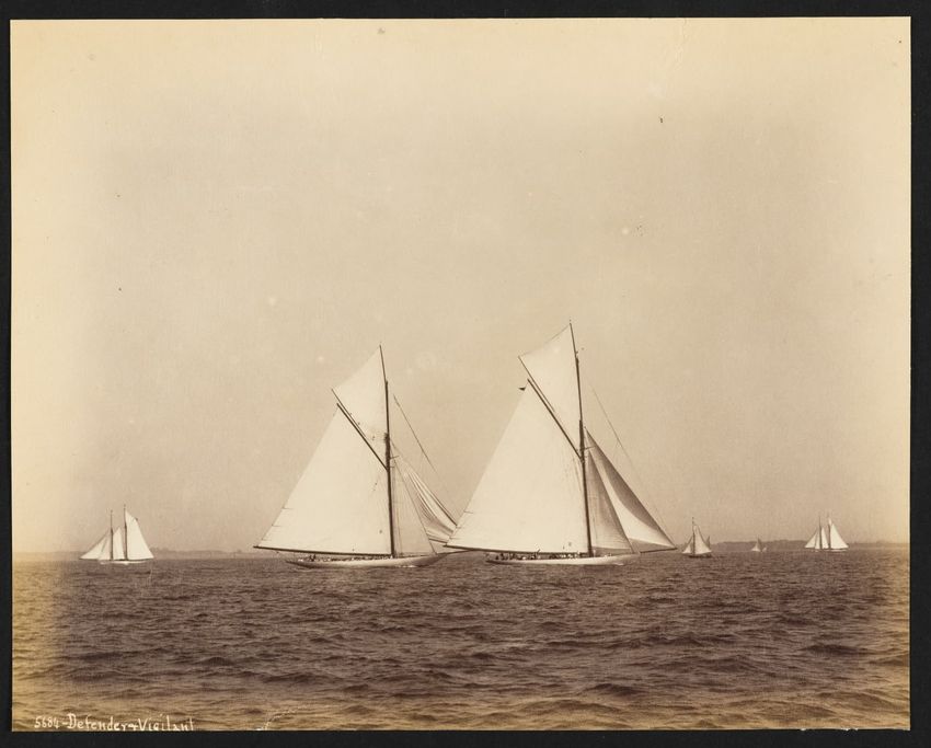 Goelet Cup, Newport; N. L. Stebbins took photos from the Amadis (Boston Globe, Aug. 3, 1895, p. 1-2). Volunteer won the slop class (after Defender had been disabled by a broken gaff); Emerald the schooner class.Defender, designed and built in 1895 by N. G. Herreshoff to defend the America's Cup agai...