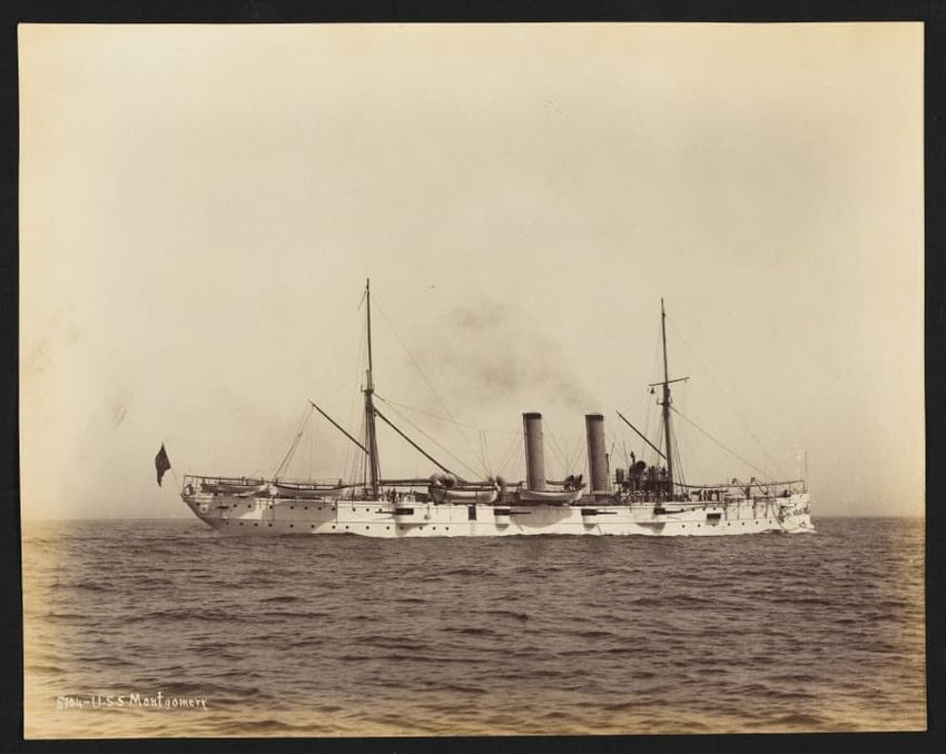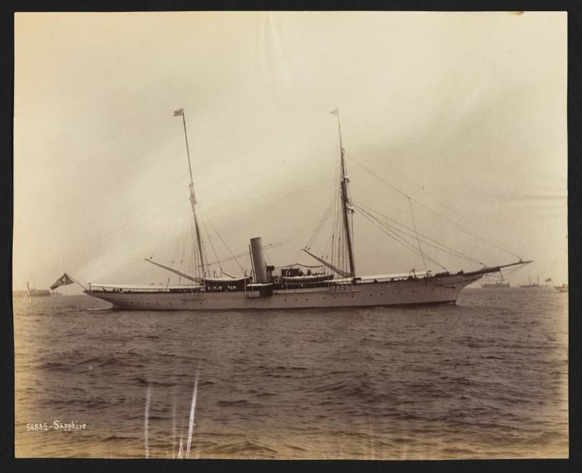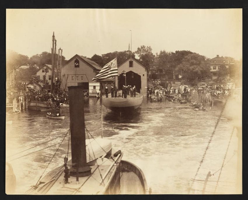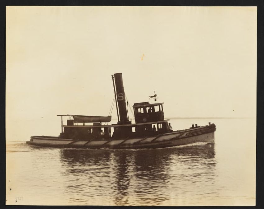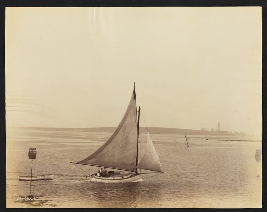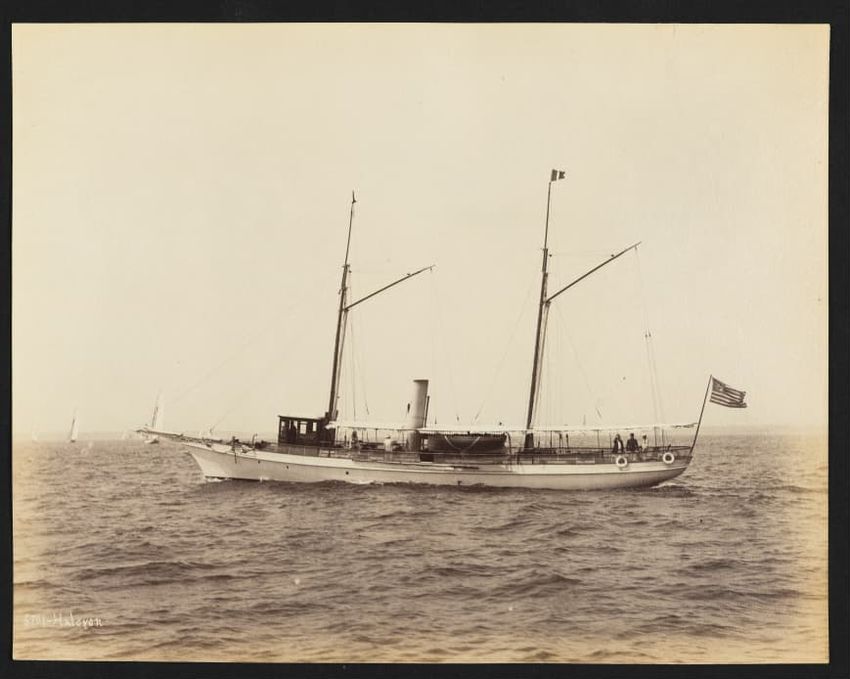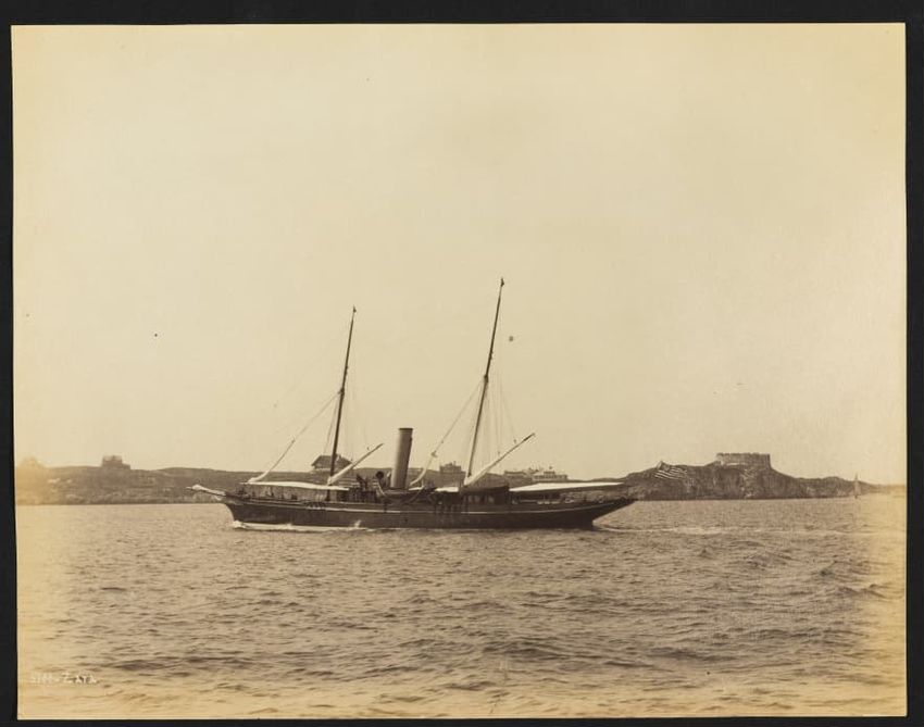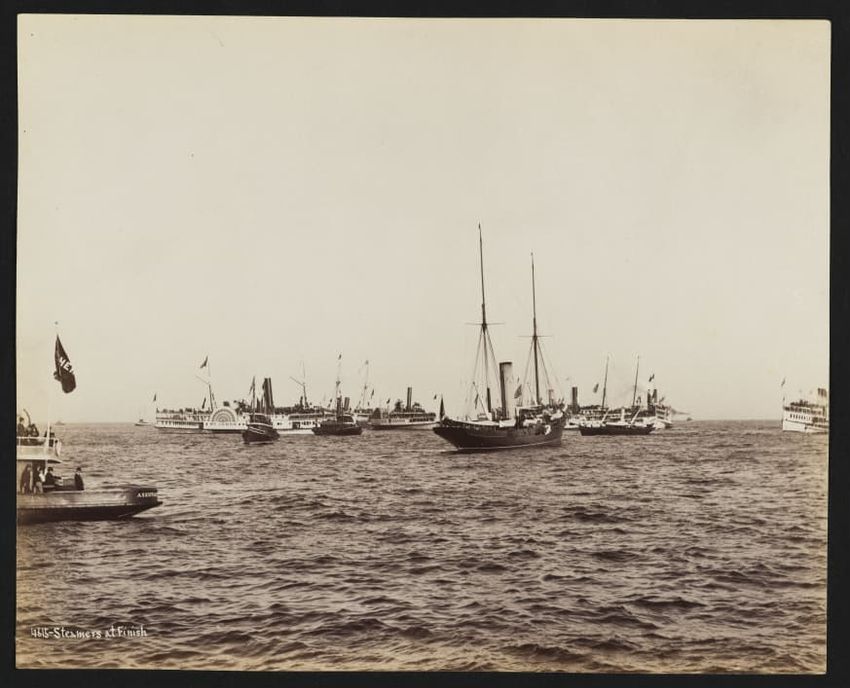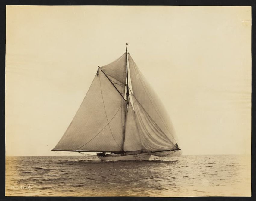 Goelet Cup, Newport; N. L. Stebbins took photos from the Amadis (Boston Globe, Aug. 3, 1895, p. 1-2). Volunteer won the slop class (after Defender had been disabled by a broken gaff); Emerald the schooner class.Defender, designed and built in 1895 by N. G. Herreshoff to defend the America's Cup agai...