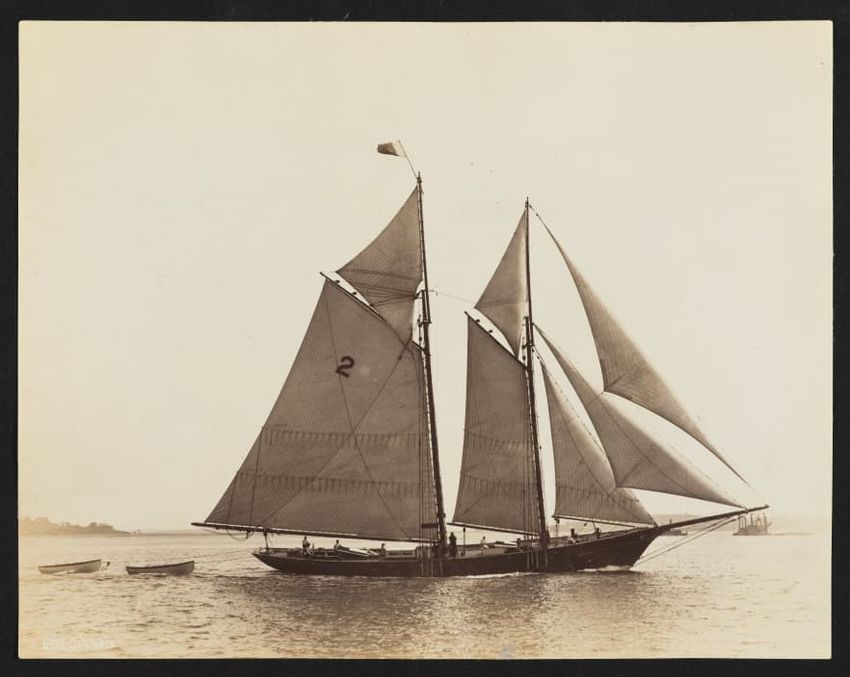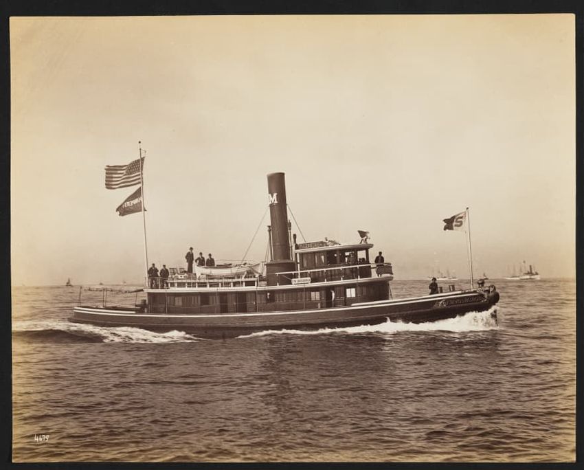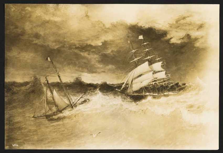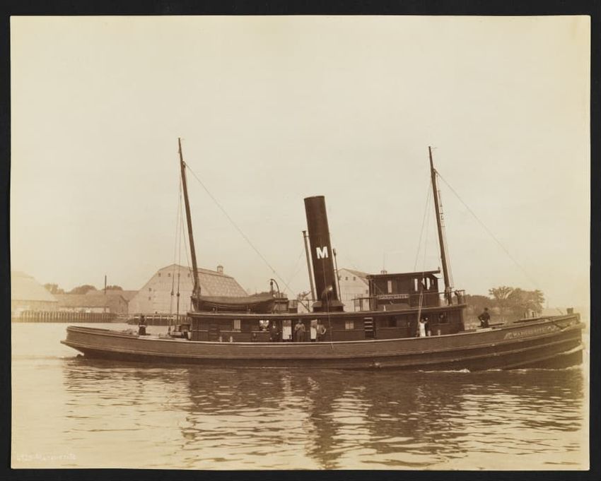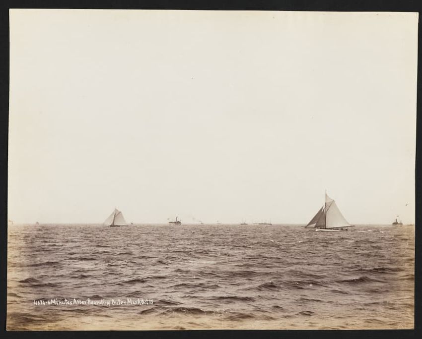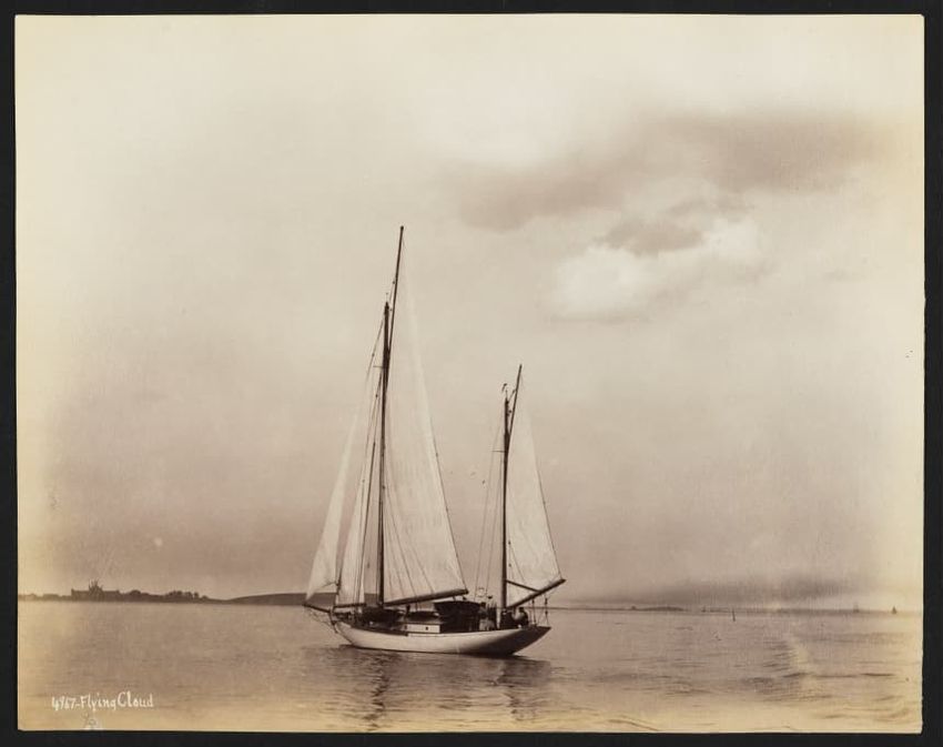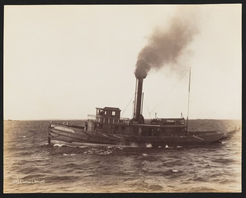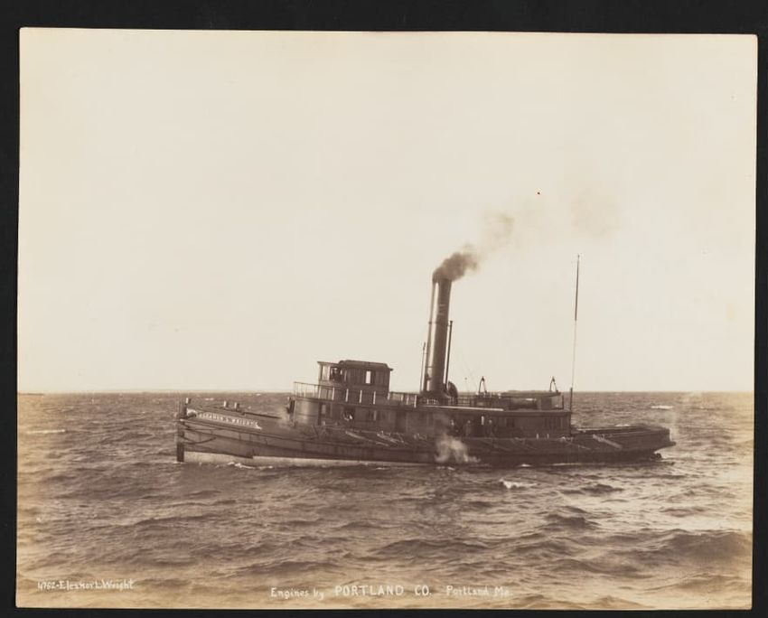 Handwritten entry; apparently exposed at time of collision with sch. John S. Ames, Oct. 25, 1893 in Channel near Bay [sp?] Light, Boston Harbor, Info supplied by William Quinn, Orleans [sp?] [rest unreadable]Neg. no. 4684 is listed twice, once as U.S. Baker dated 10/13/93, and also as a handwritten ...