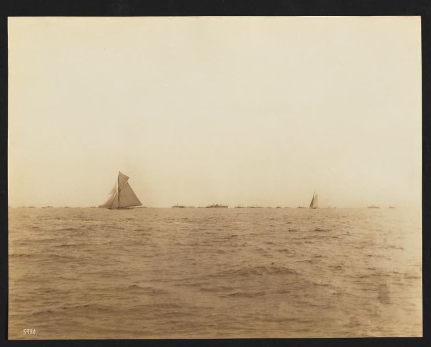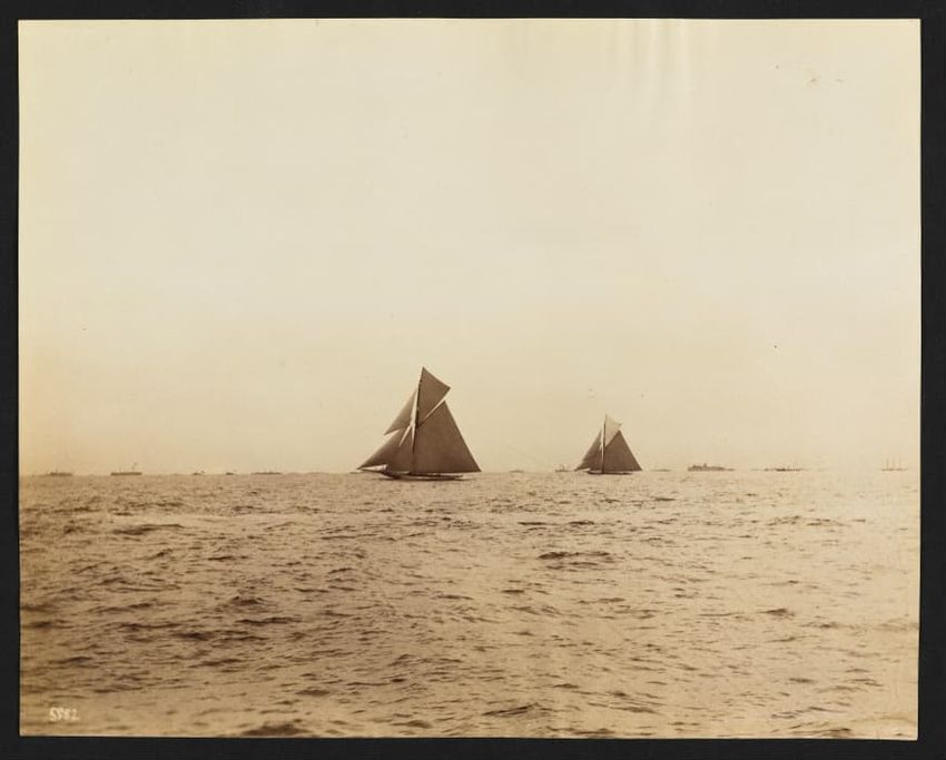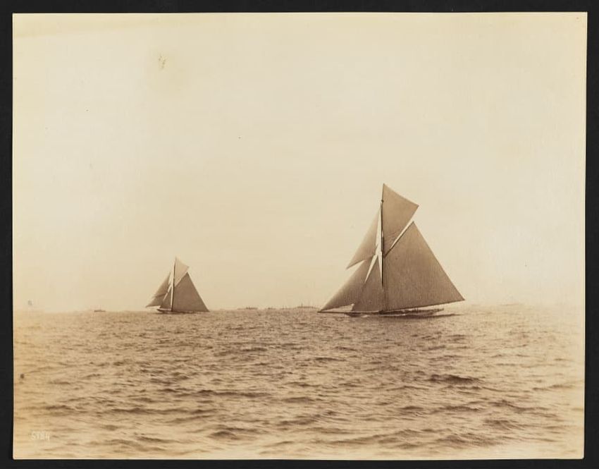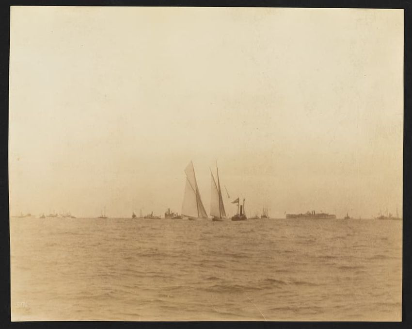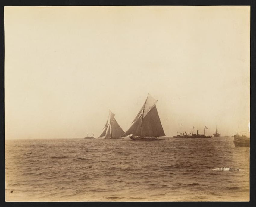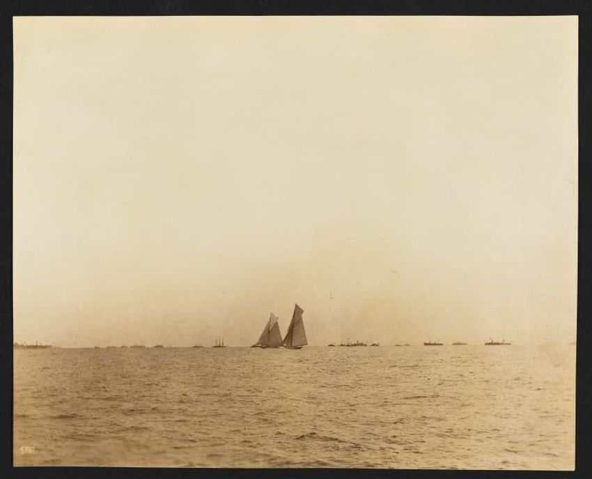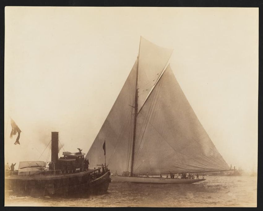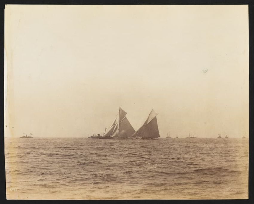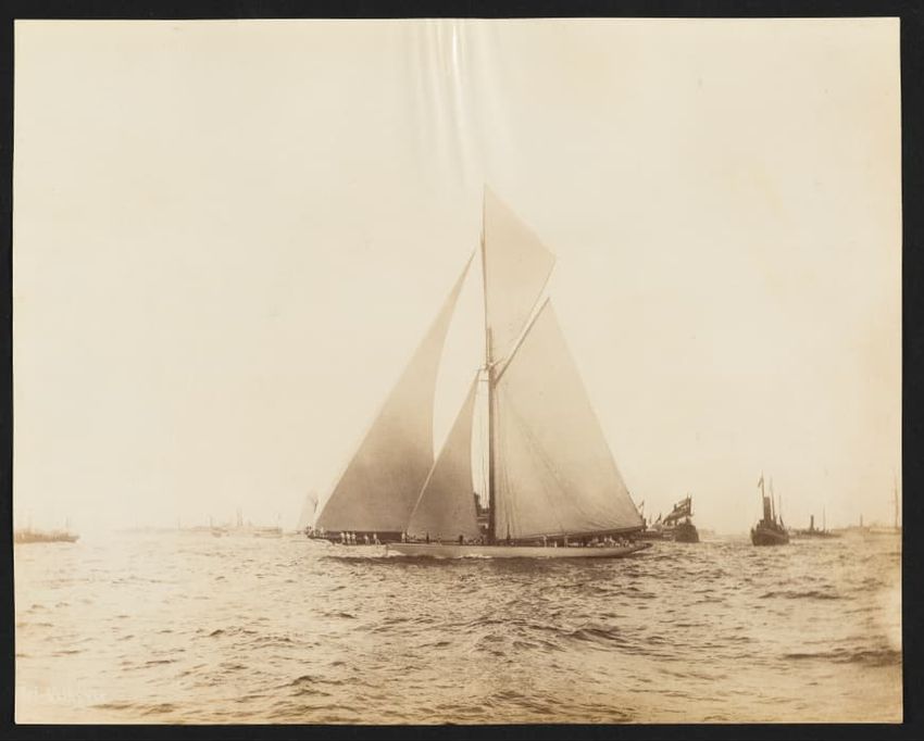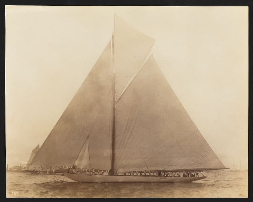 First America's Cup race between Defender & Valkyrie III, Defender wonDefender, designed and built in 1895 by N. G. Herreshoff to defend the America's Cup against Valkyrie III. Her bottom was polished bronze, but her topsides, deck beams, and some of her deck framing were aluminum (making her a gian...