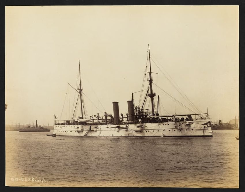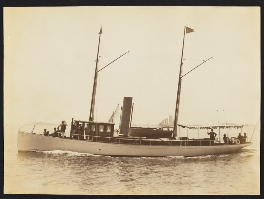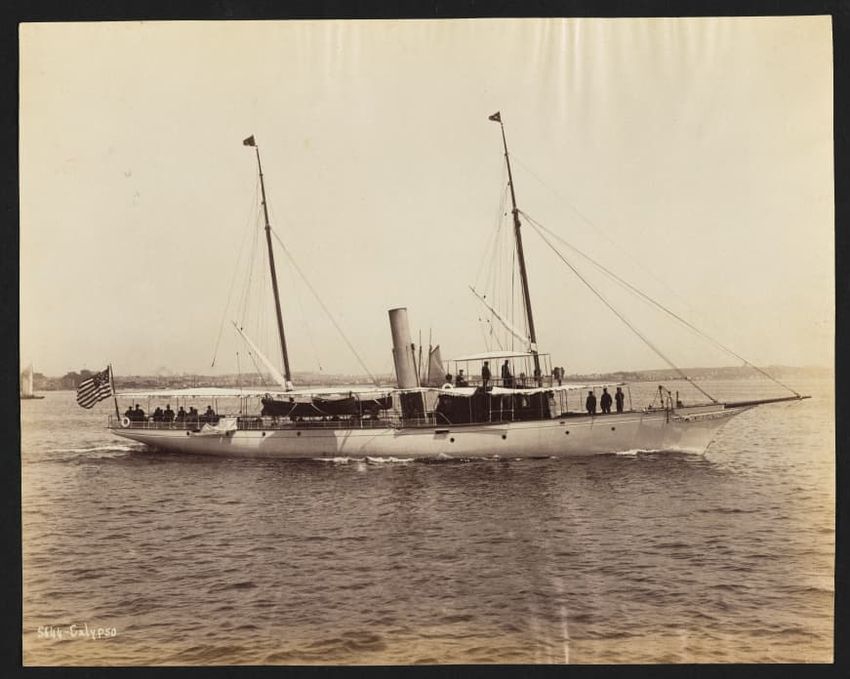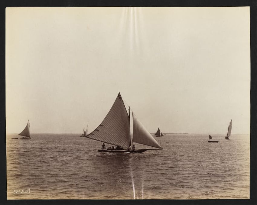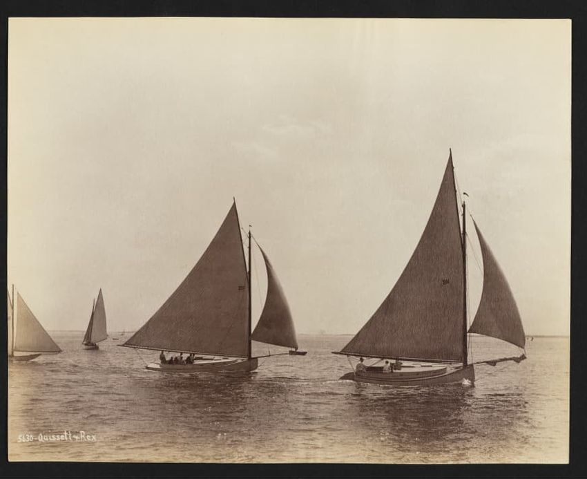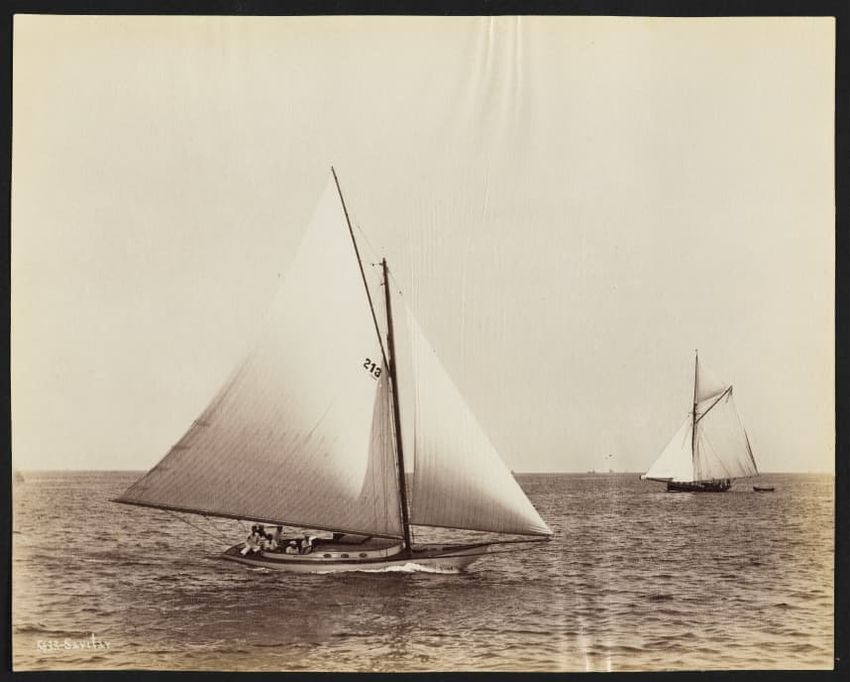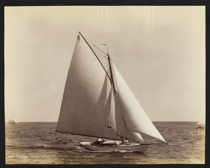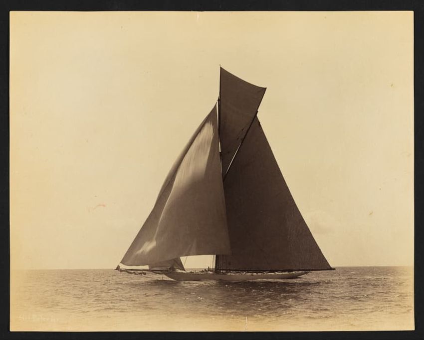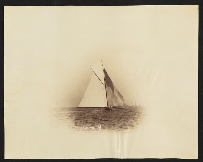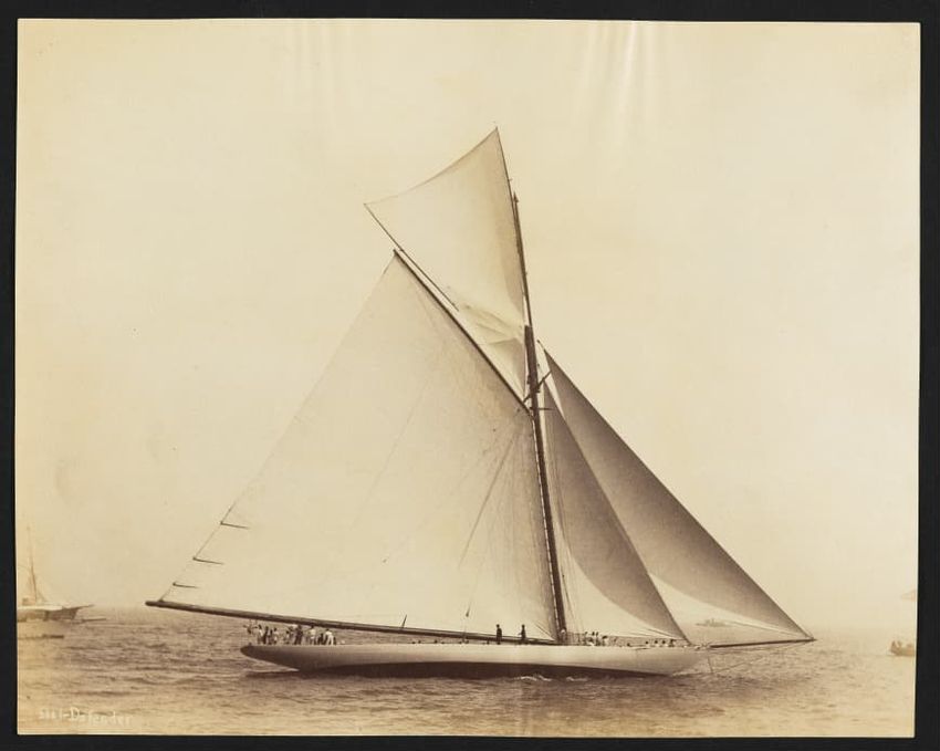 Goelet Cup, Newport; N. L. Stebbins took photos from the Amadis (Boston Globe, Aug. 3, 1895, p. 1-2). Volunteer won the slop class (after Defender had been disabled by a broken gaff); Emerald the schooner class.Defender, designed and built in 1895 by N. G. Herreshoff to defend the America's Cup agai...