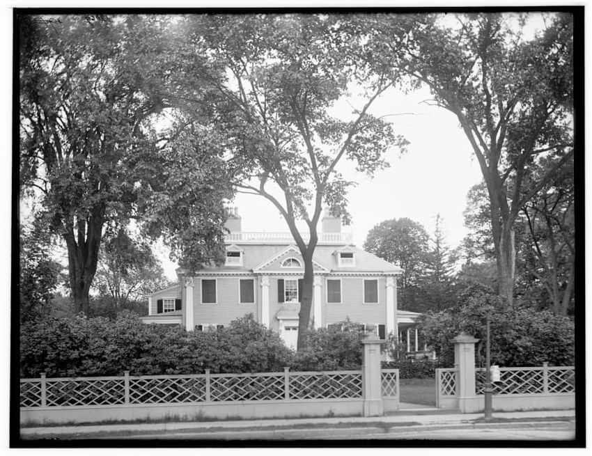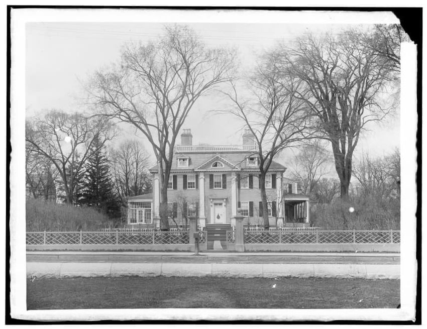 The image depicts a street scene in Cambridgeport, Cambridge, Massachusetts. On the left, there is a prominent multi-story building with a turret and arched windows, identified as a bank that offers interest, savings, and trust services. Further down the street, other businesses are visible, includi...