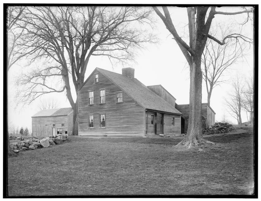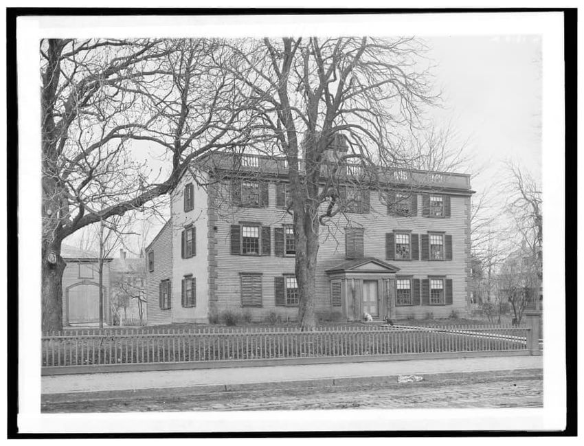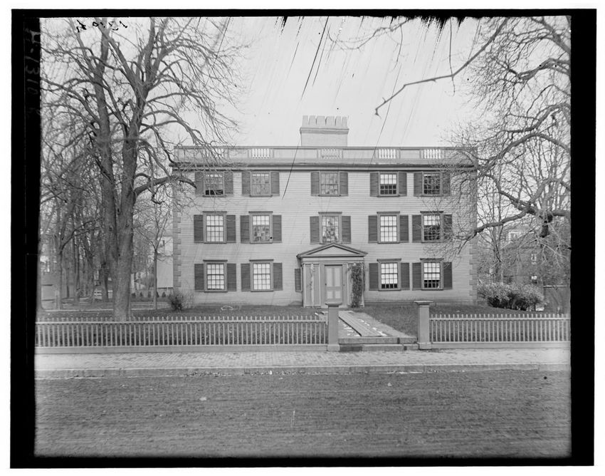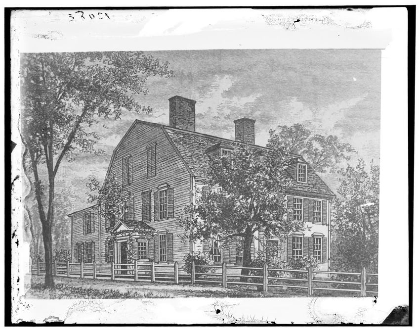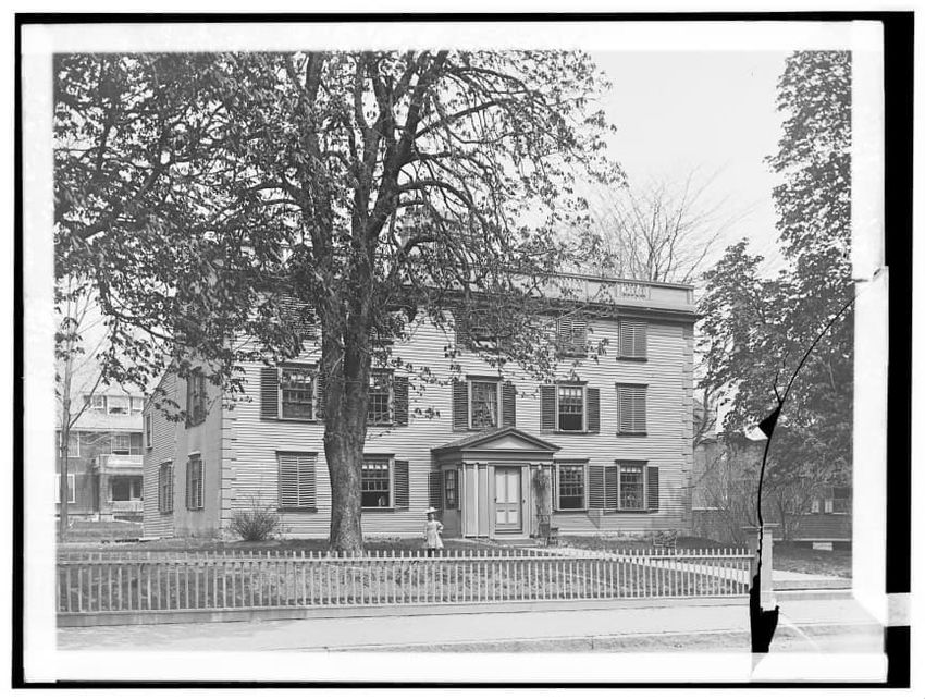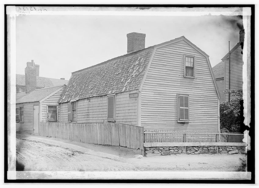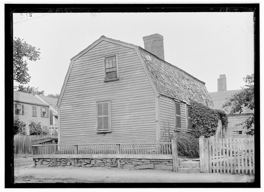 The image shows the Minot House in Concord, Massachusetts. It consists of a small, shingled structure with a gabled roof and dormer windows. The house is situated on a slight rise, surrounded by trees, with a white picket fence in front and a stone wall bordering the foreground. An arched, open stru...