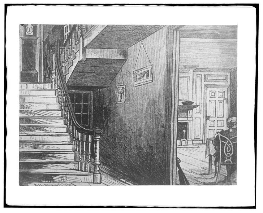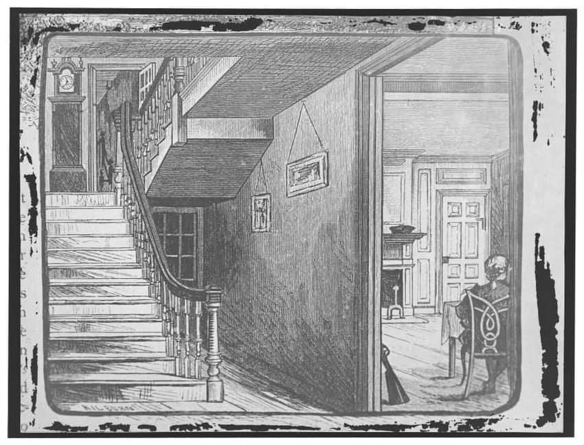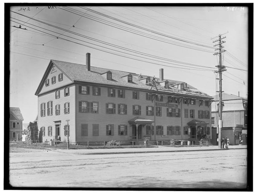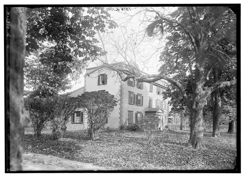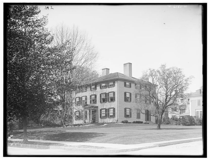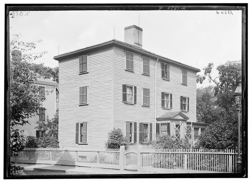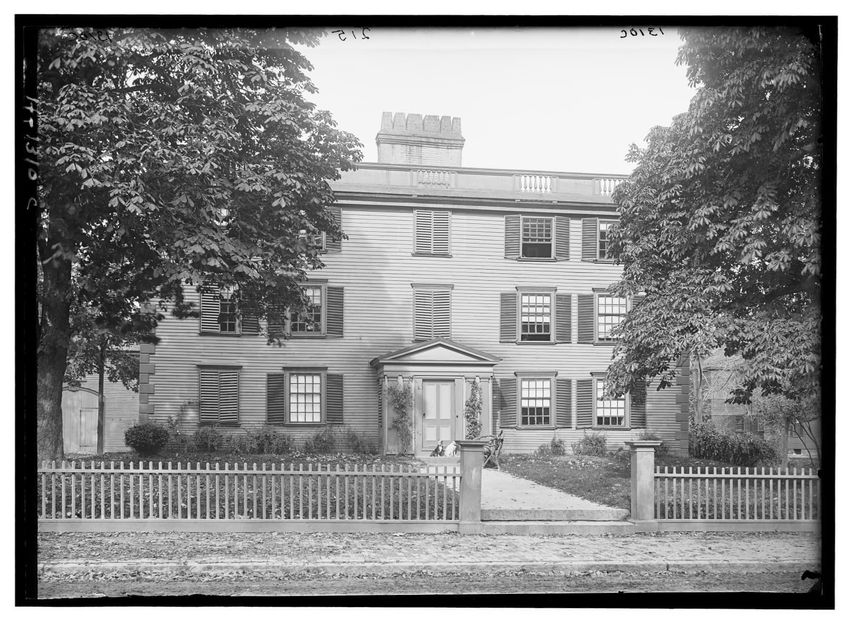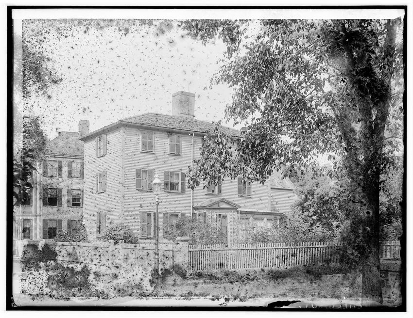 The image shows the Minot House in Concord, Massachusetts. It consists of a small, shingled structure with a gabled roof and dormer windows. The house is situated on a slight rise, surrounded by trees, with a white picket fence in front and a stone wall bordering the foreground. An arched, open stru...