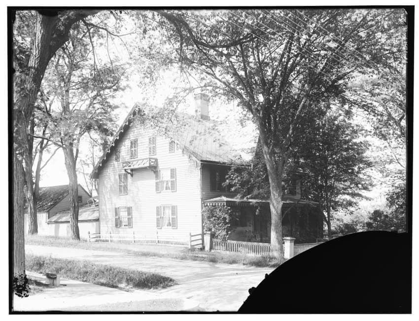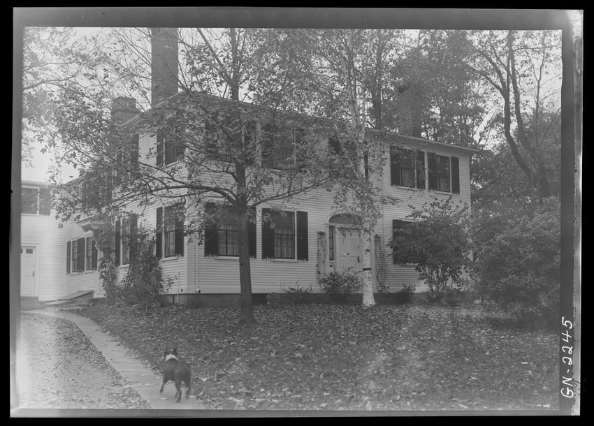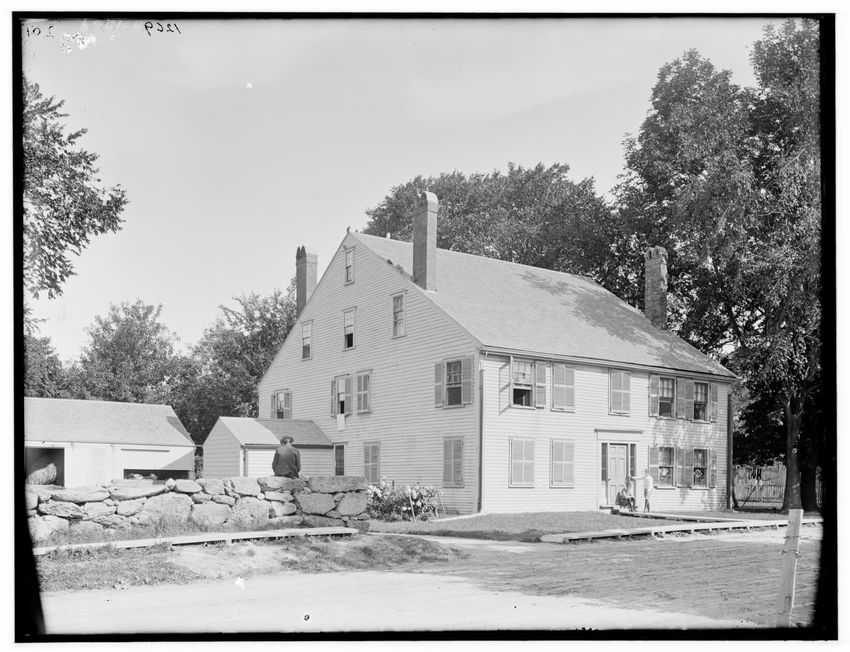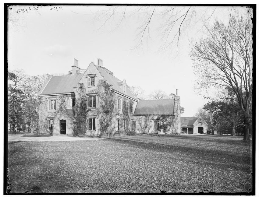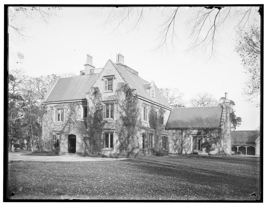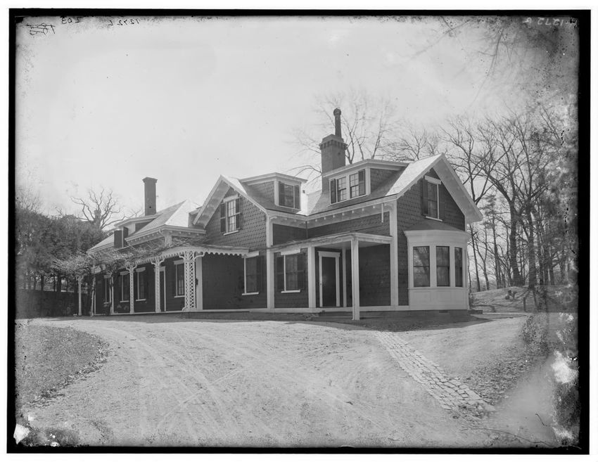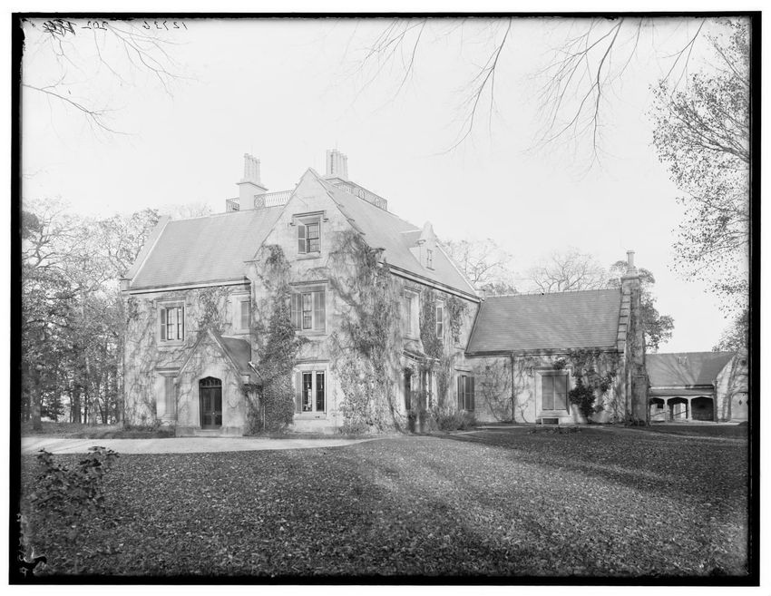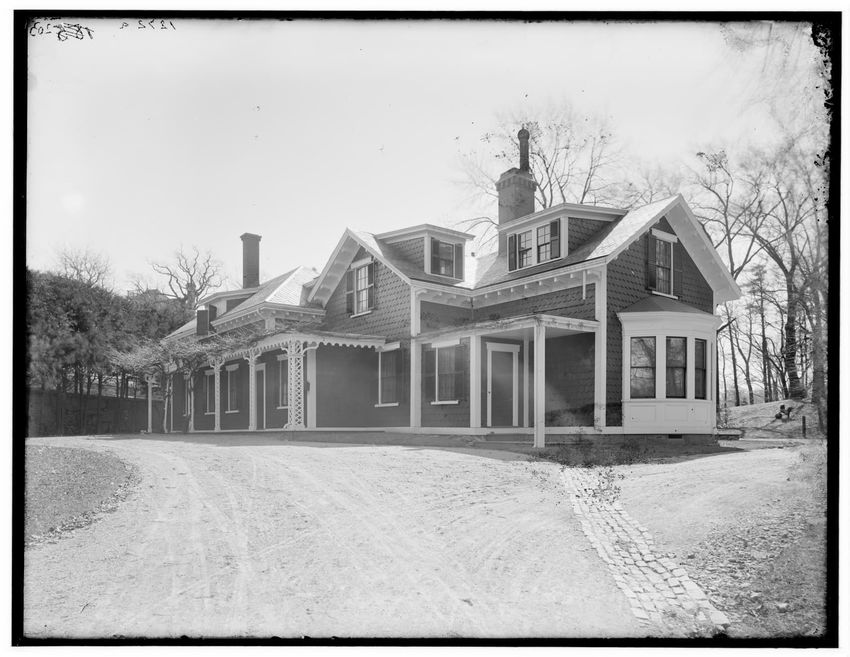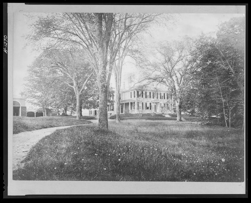 The image shows a large house known as the Weld House, located on Goddard Avenue in Brookline, Massachusetts. The house features multiple dormer windows, decorative woodwork, and a prominent chimney. A dirt driveway curves towards the front entrance, and the surrounding area includes trees and a gra...