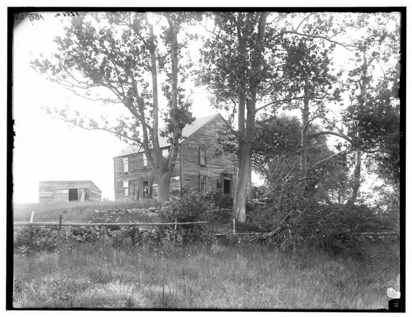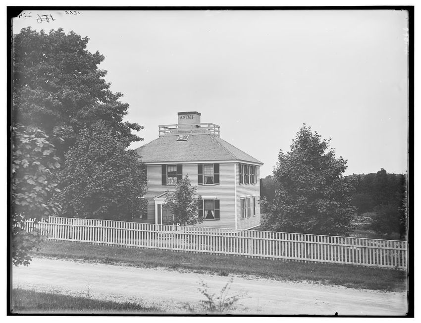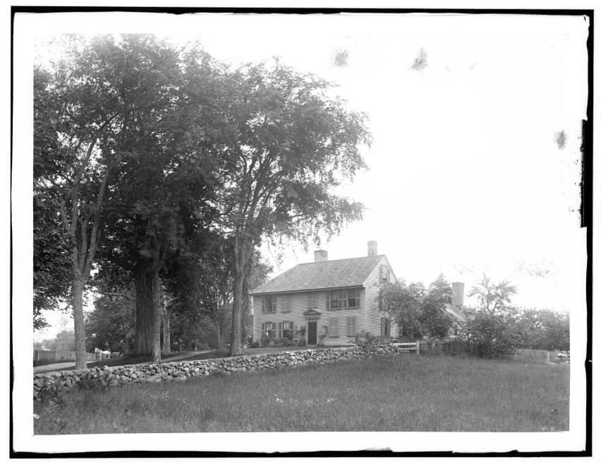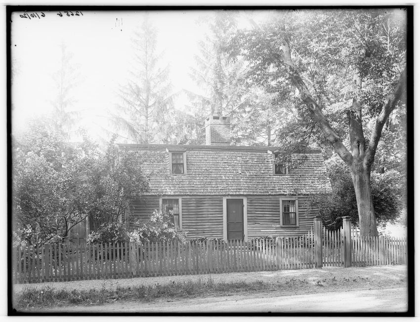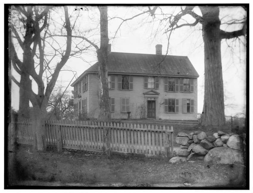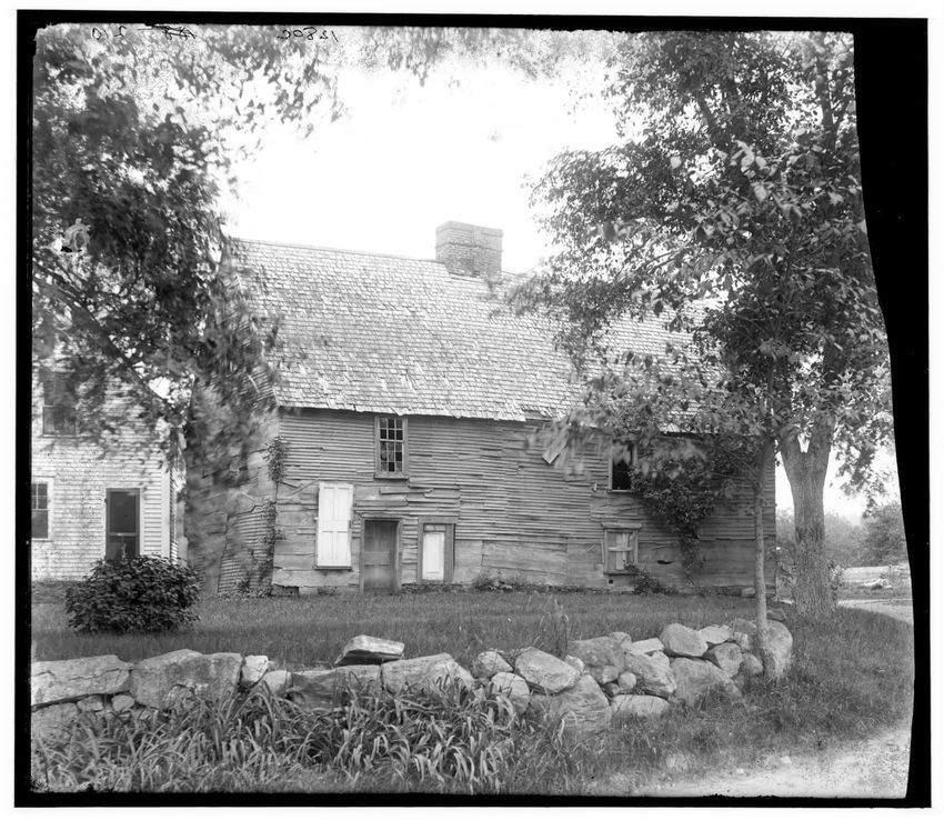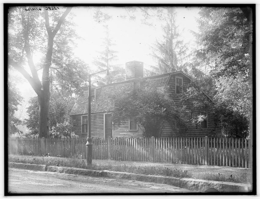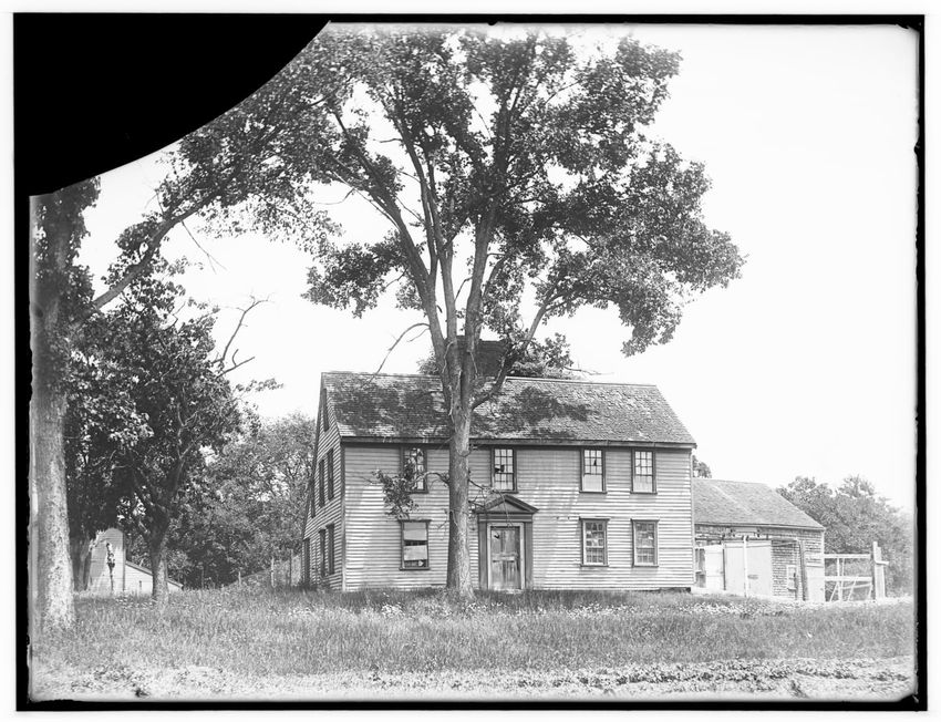 The image shows a large house known as the Weld House, located on Goddard Avenue in Brookline, Massachusetts. The house features multiple dormer windows, decorative woodwork, and a prominent chimney. A dirt driveway curves towards the front entrance, and the surrounding area includes trees and a gra...