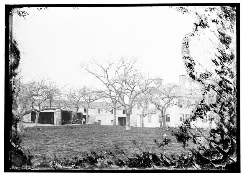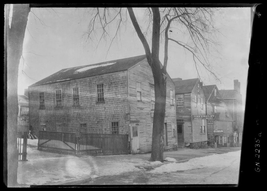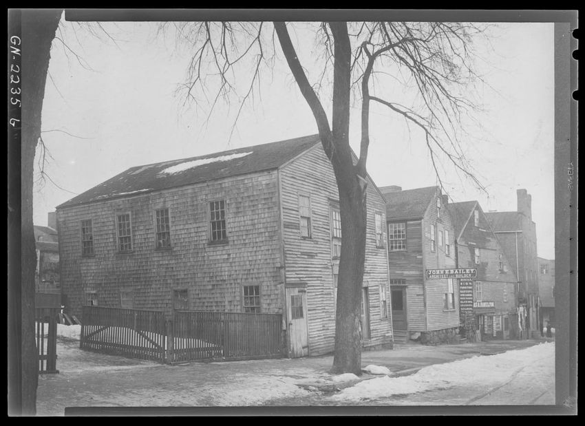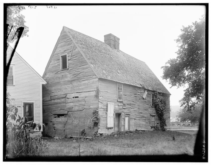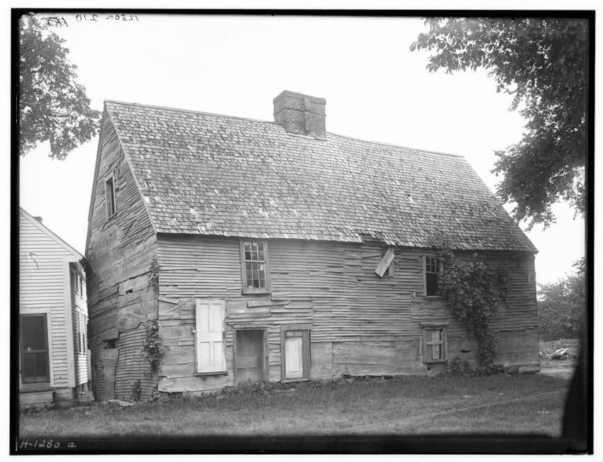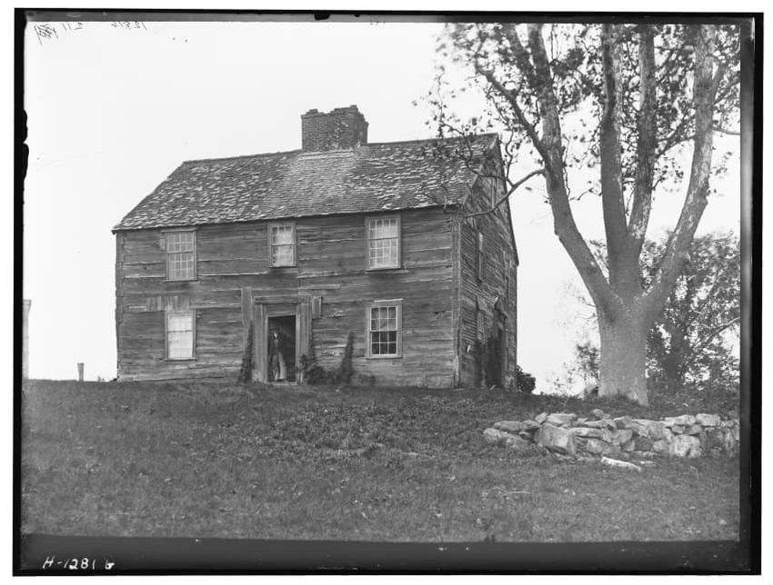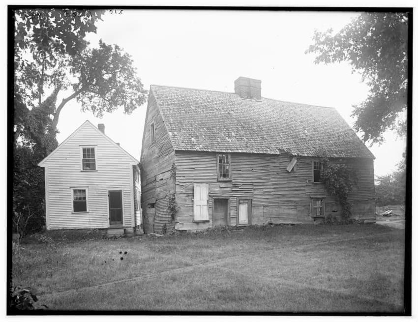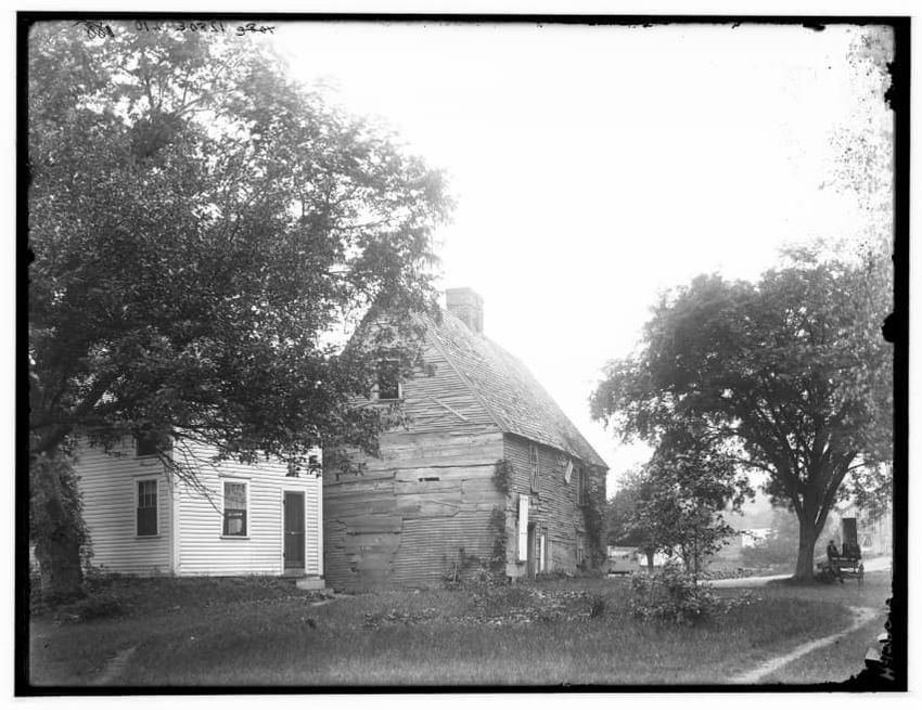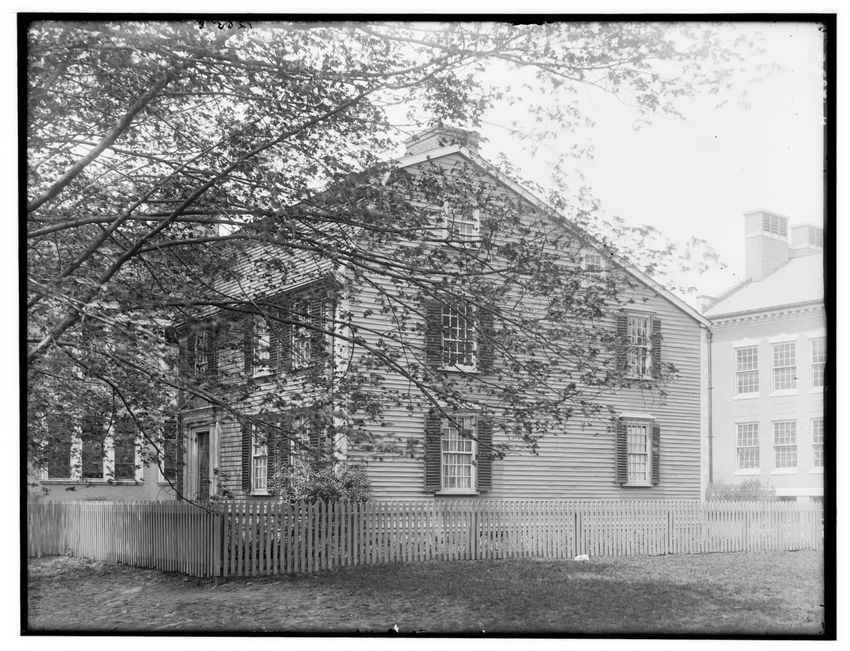 The image shows a large house known as the Weld House, located on Goddard Avenue in Brookline, Massachusetts. The house features multiple dormer windows, decorative woodwork, and a prominent chimney. A dirt driveway curves towards the front entrance, and the surrounding area includes trees and a gra...