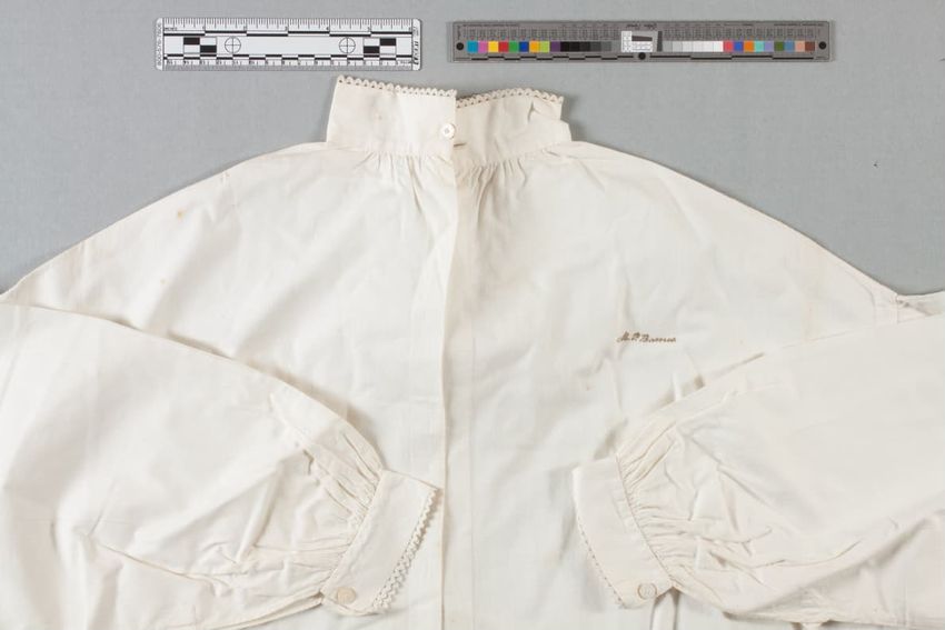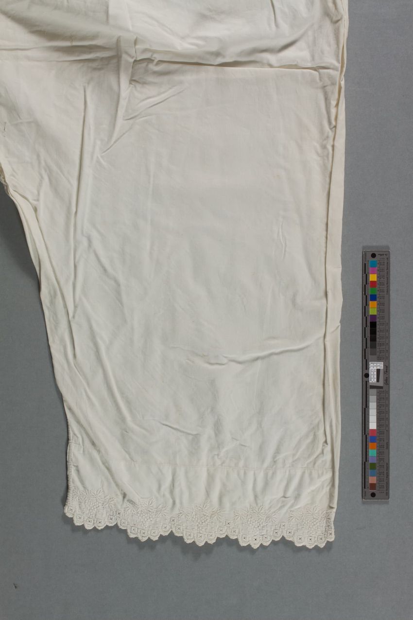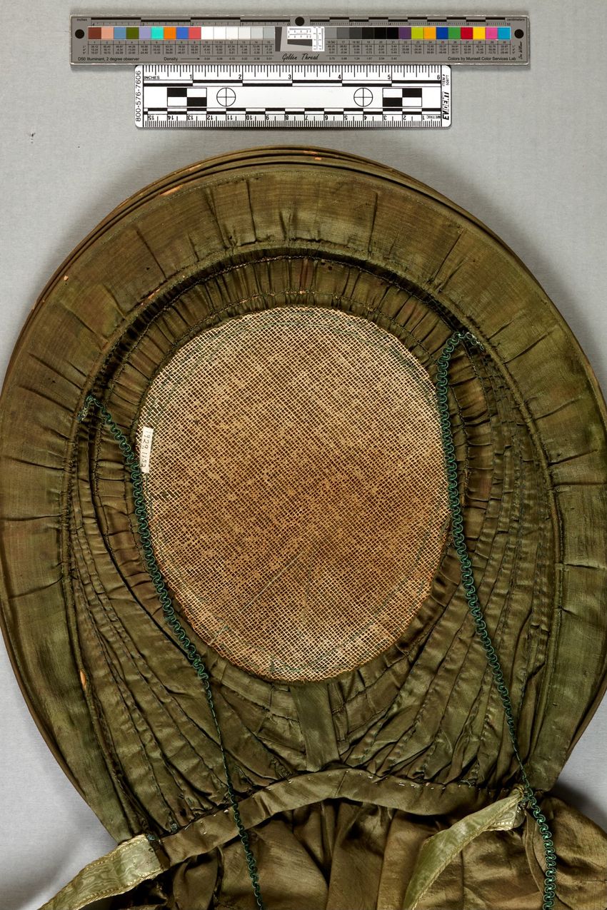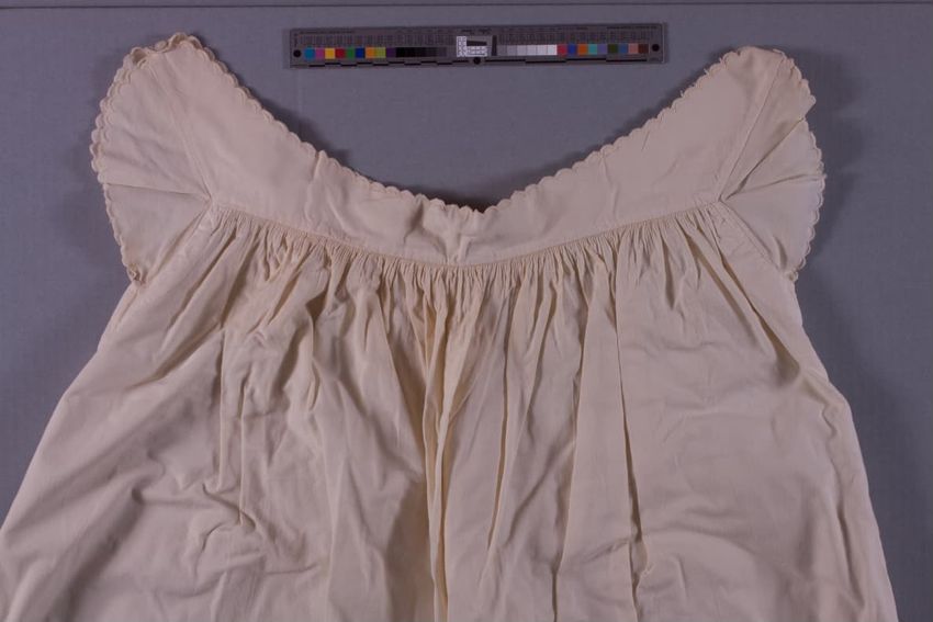 White cotton printed w/ pink circles w/ geometric pattern; open neck & long bell-shaped sleeves trimmed w/ ruffle printed w/ matching pink border of geometric meander.  Boned & shirred; bodice lined w/ white cotton w/ hook & eye closure; straight waist.  Sleeves have 2 bands of piping w/ gathering a...