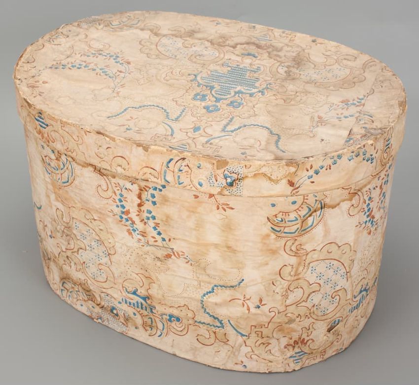 Cream cotton; squared neckline; embroidered with green leaves outlined in yellow at front and back of neck and cuffs of short sleeves. Hem embroidered with red rose buds, brown branches, and worm ground; bottom border of two-toned leaves also outlined in yellow thread. High waist; gathered at bust...