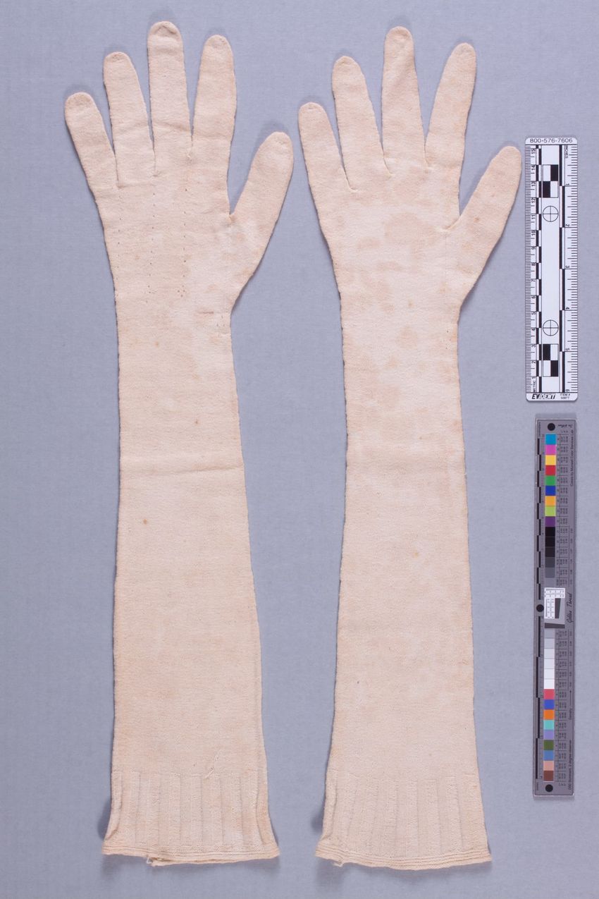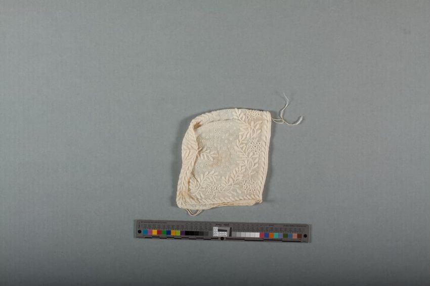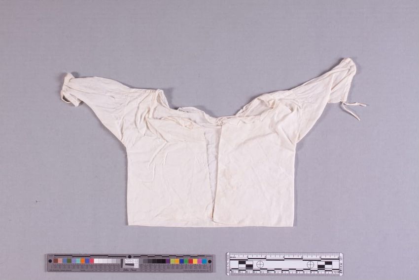 Cream cotton; squared neckline; embroidered with green leaves outlined in yellow at front and back of neck and cuffs of short sleeves. Hem embroidered with red rose buds, brown branches, and worm ground; bottom border of two-toned leaves also outlined in yellow thread. High waist; gathered at bust...