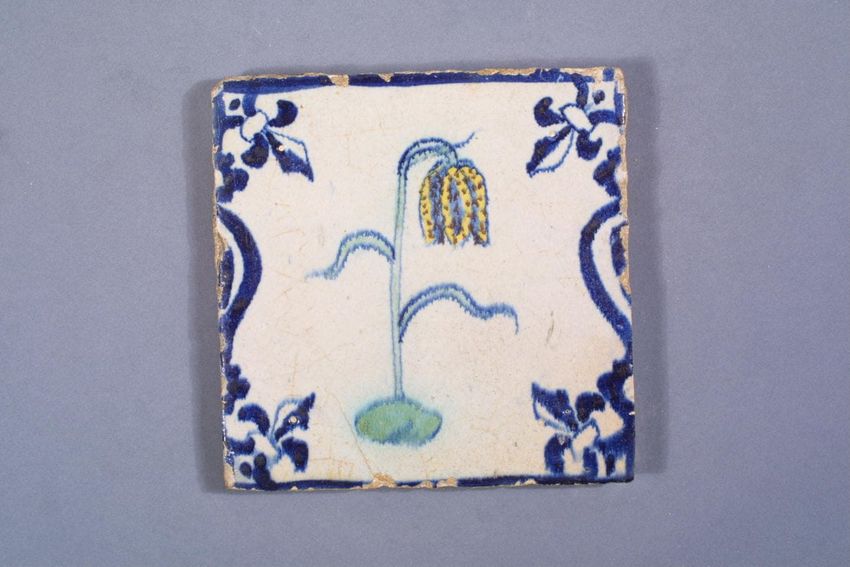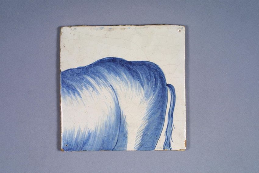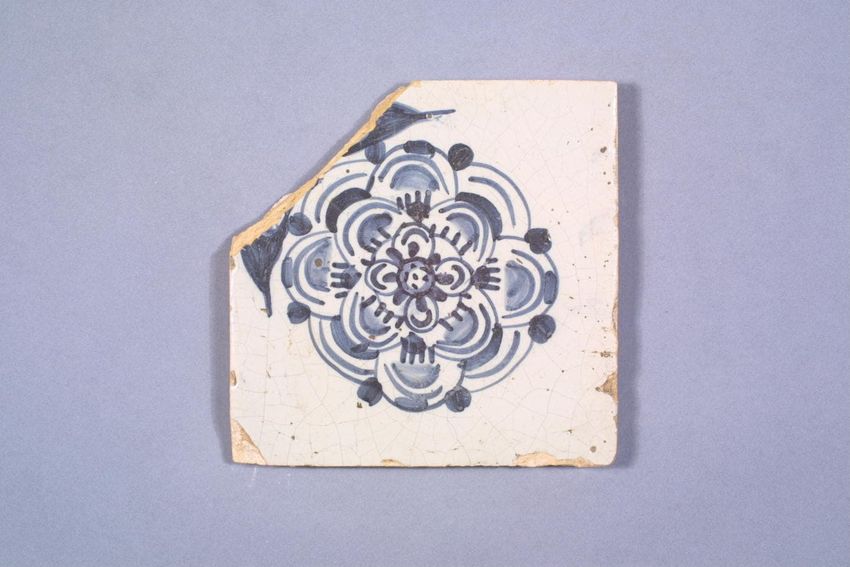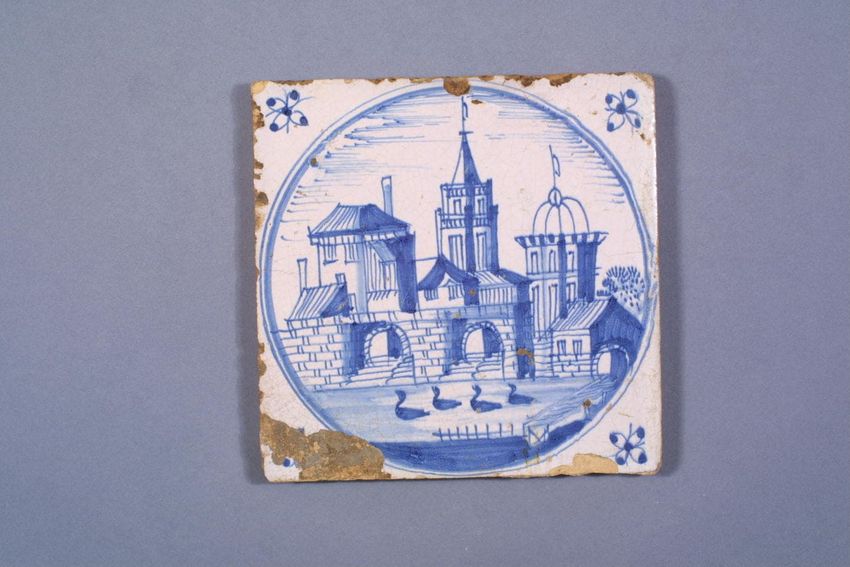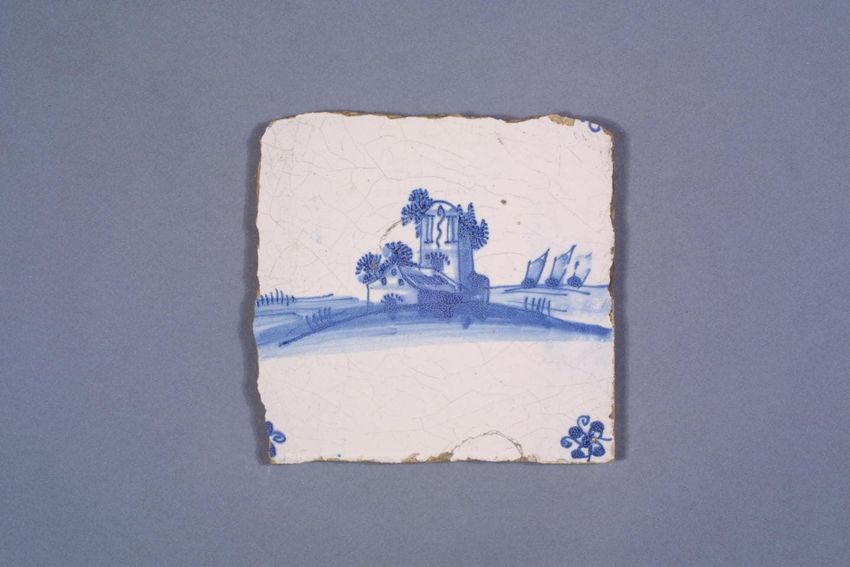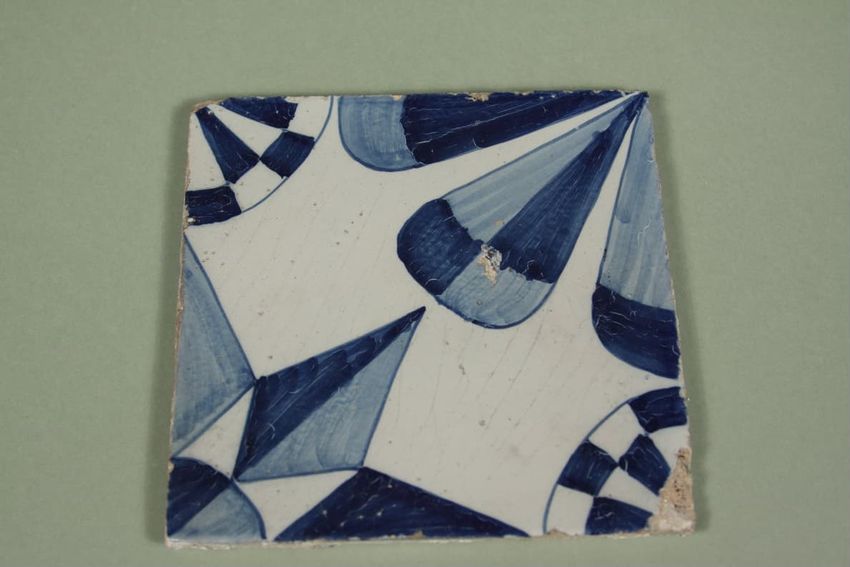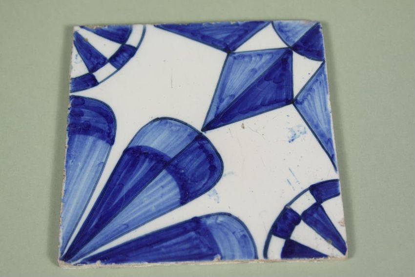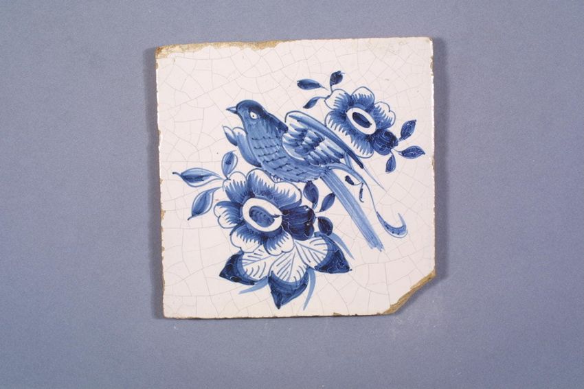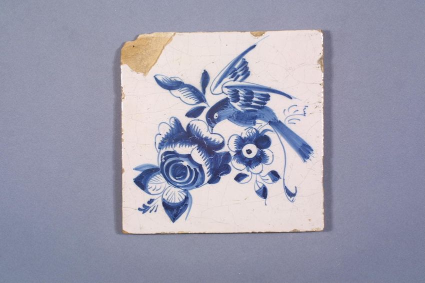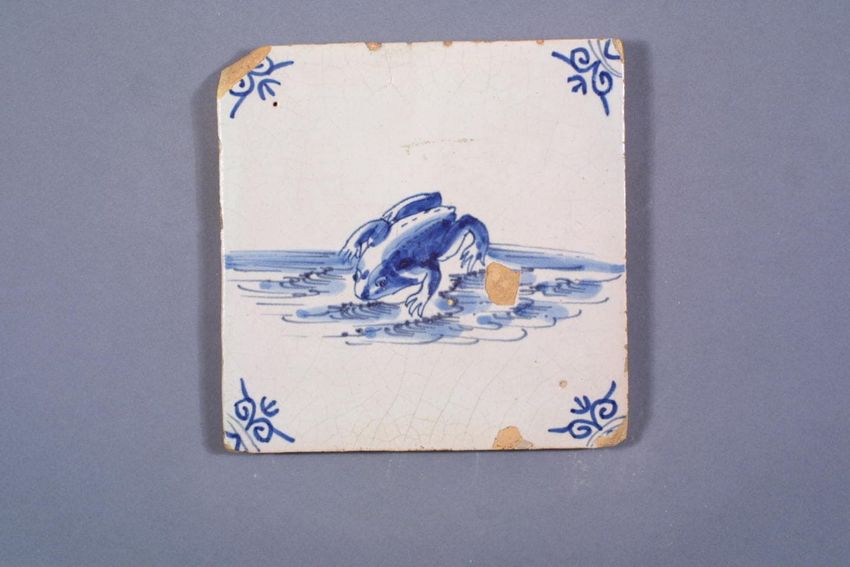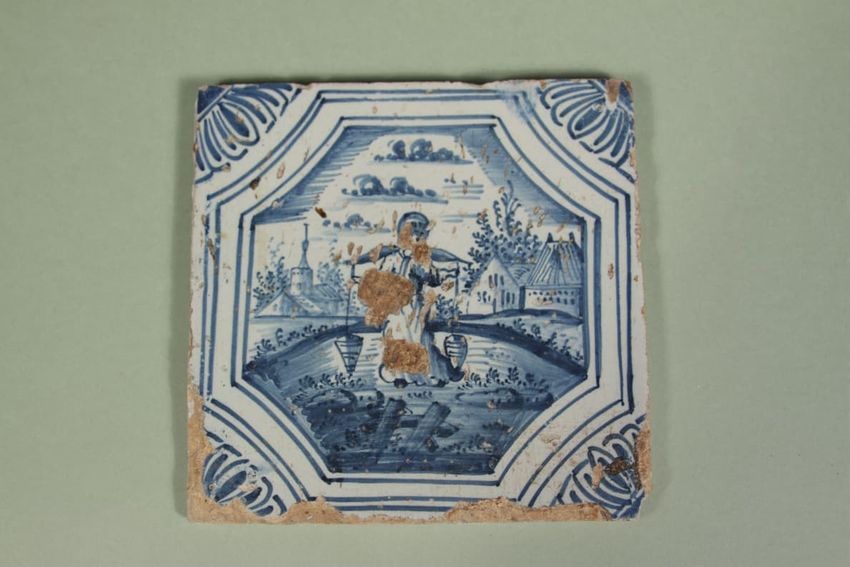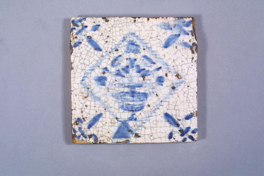 Sqauare, decorative earthenware tile, grayish-white background with painted blue floral designs in the corners and a blue cherib walking to the left, holding a spear, pot-bellied, shadow stretching behind him.