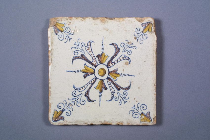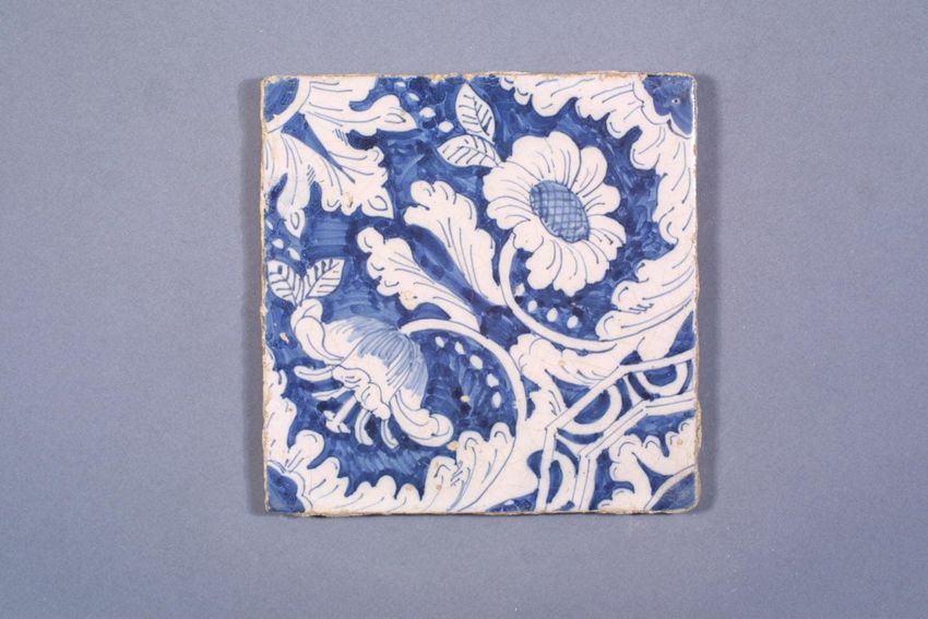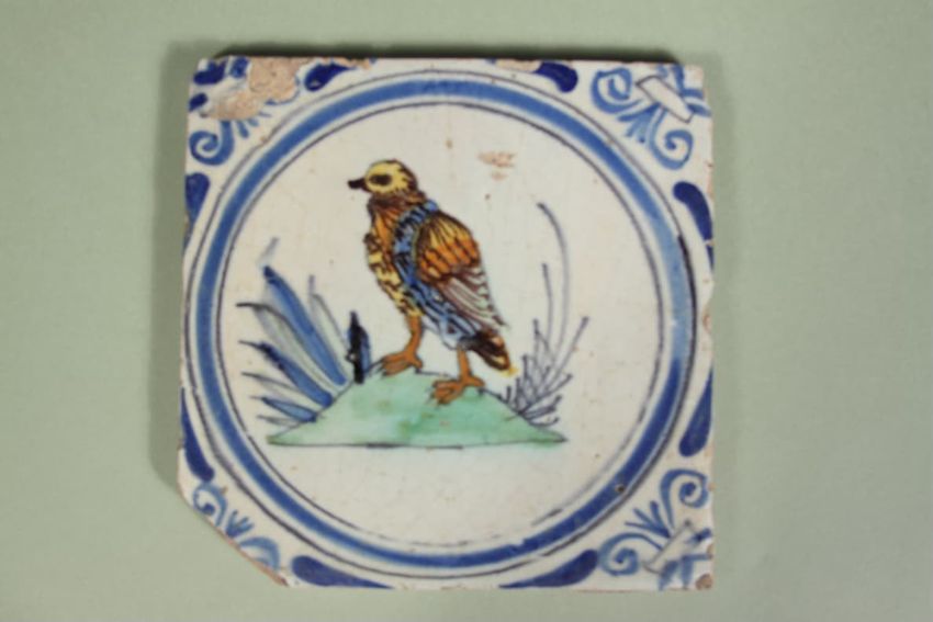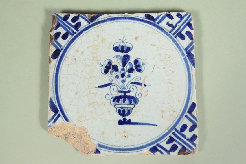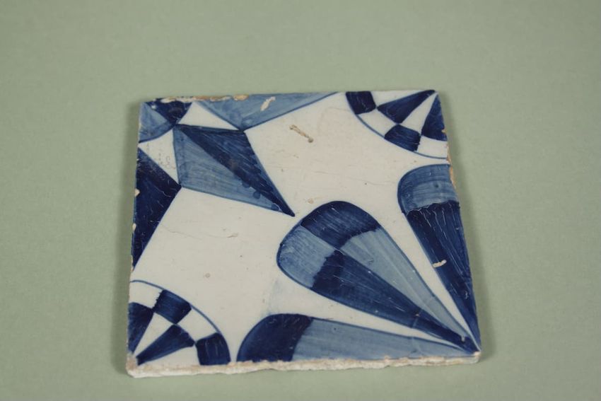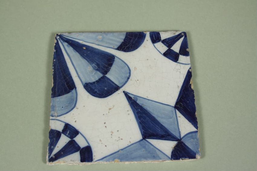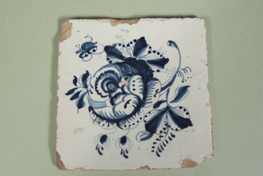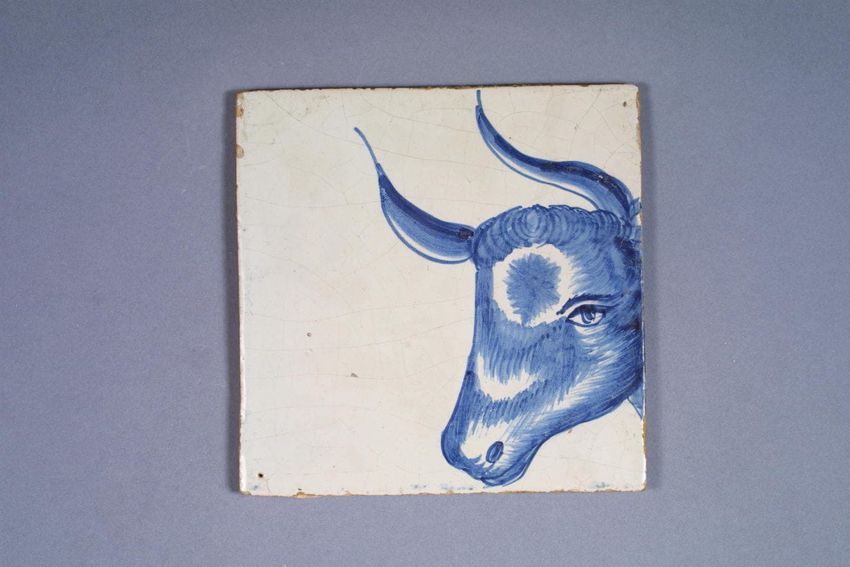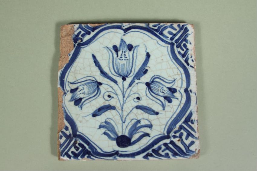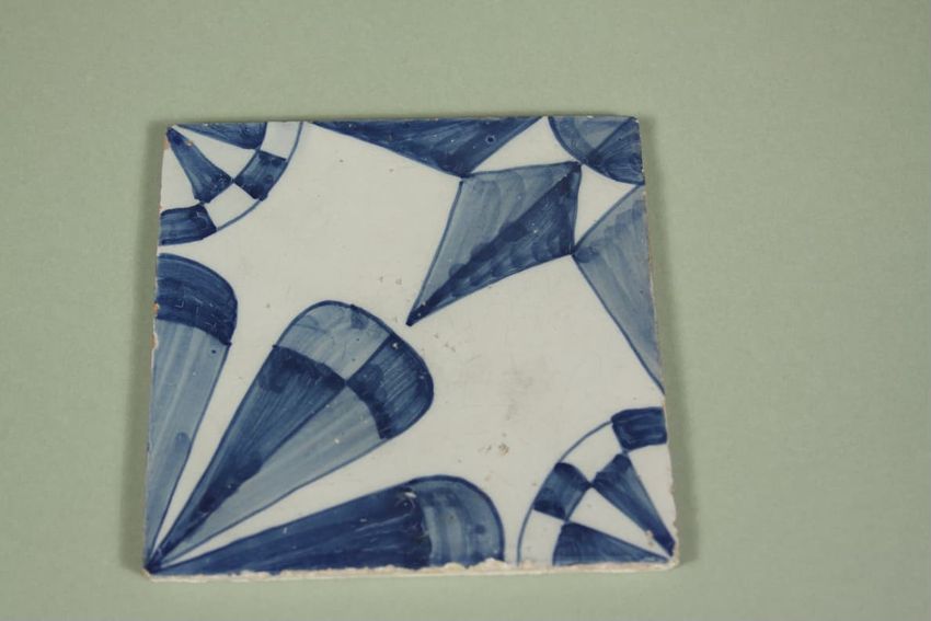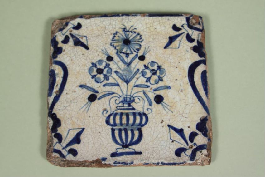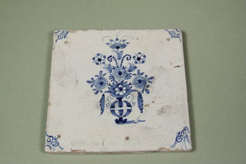Sqauare, decorative earthenware tile, grayish-white background with painted blue floral designs in the corners and a blue cherib walking to the left, holding a spear, pot-bellied, shadow stretching behind him.