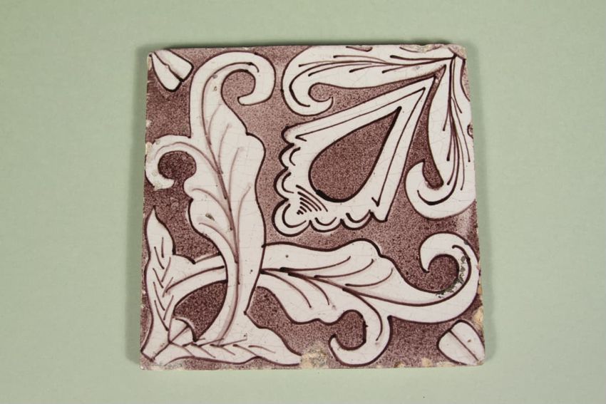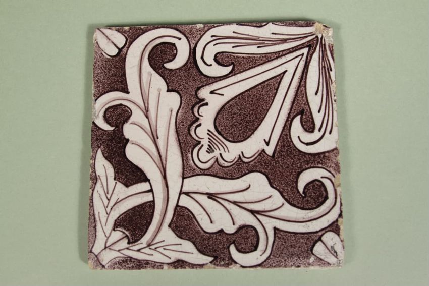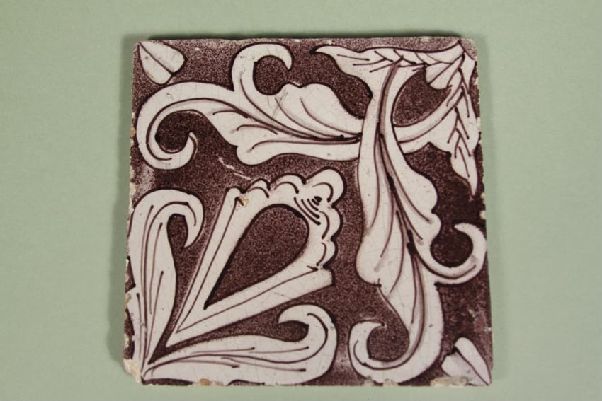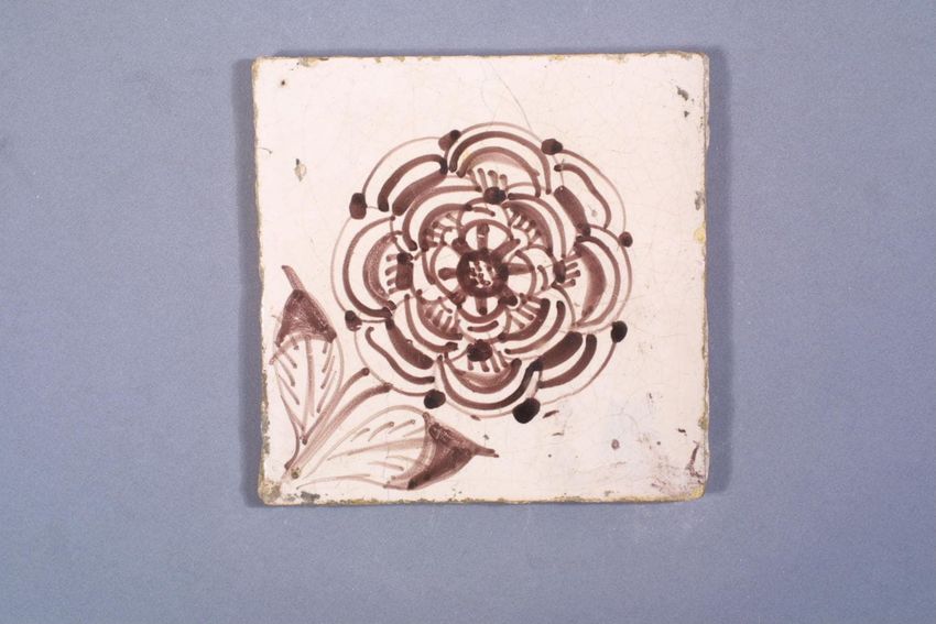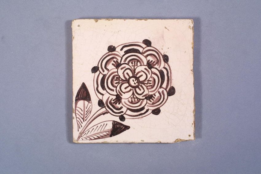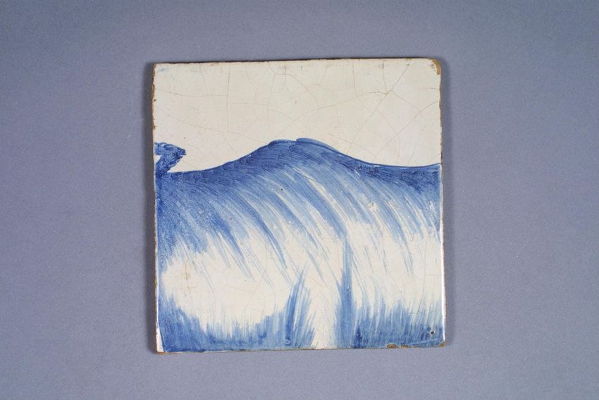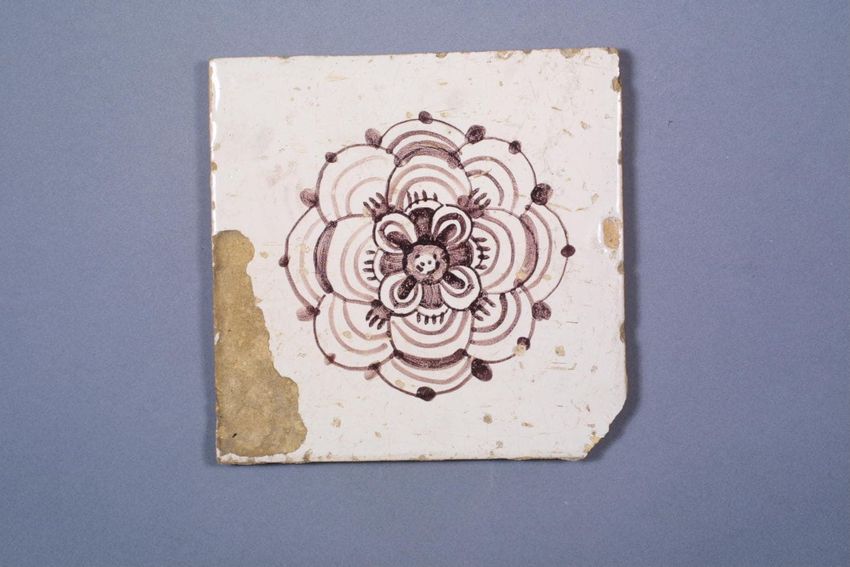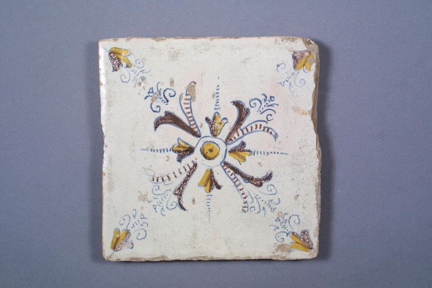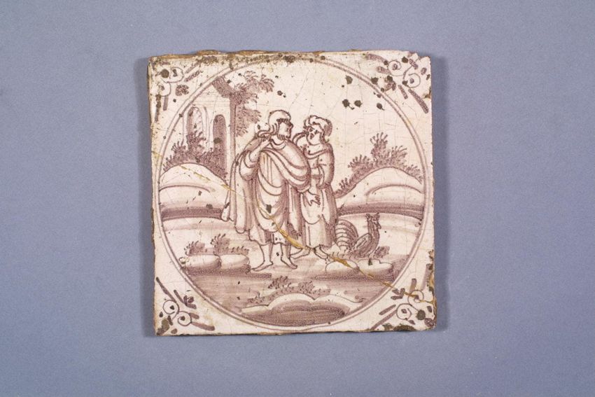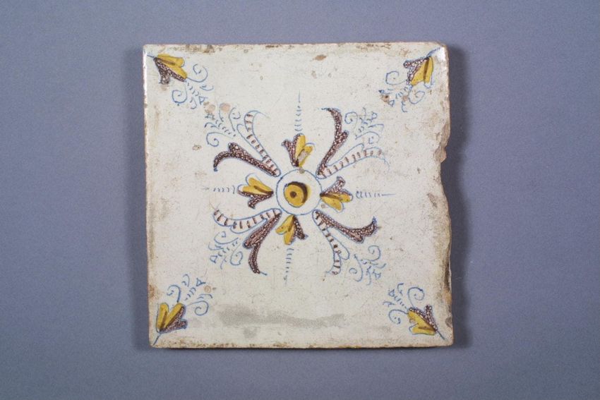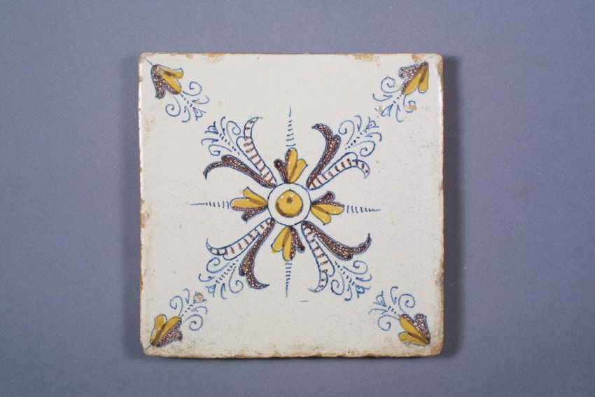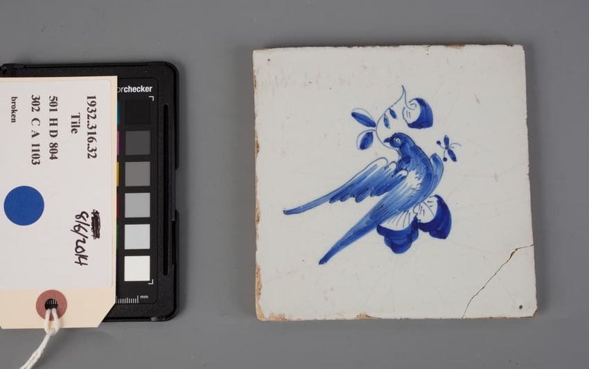 Sqauare, decorative earthenware tile, grayish-white background with painted blue floral designs in the corners and a blue cherib walking to the left, holding a spear, pot-bellied, shadow stretching behind him.