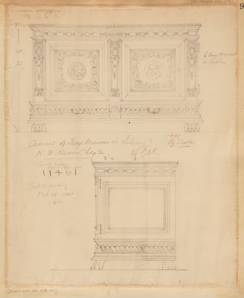 Untitled design drawing rendered in pencil on trace. Front, side, and partial top views are shown. Classical Revival chest or cabinet has rectangular case; overhanging top with molded edge; three pairs of Doric three-quarter columns framing two drawers above two doors; two drawers in solid base with...