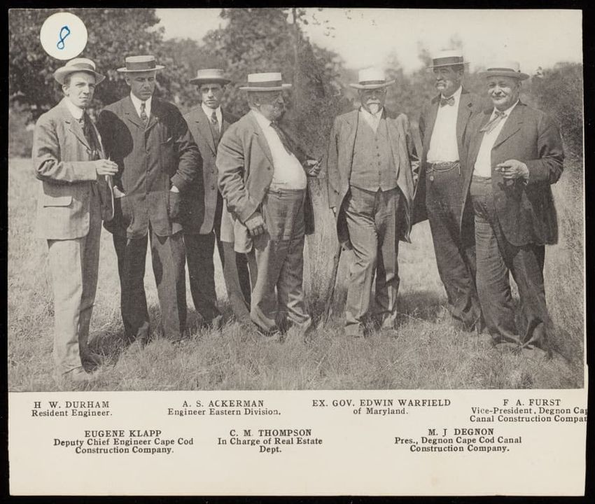 A black and white view of the leaders of the Cape Cod Canal project standing on the site of the digging.
