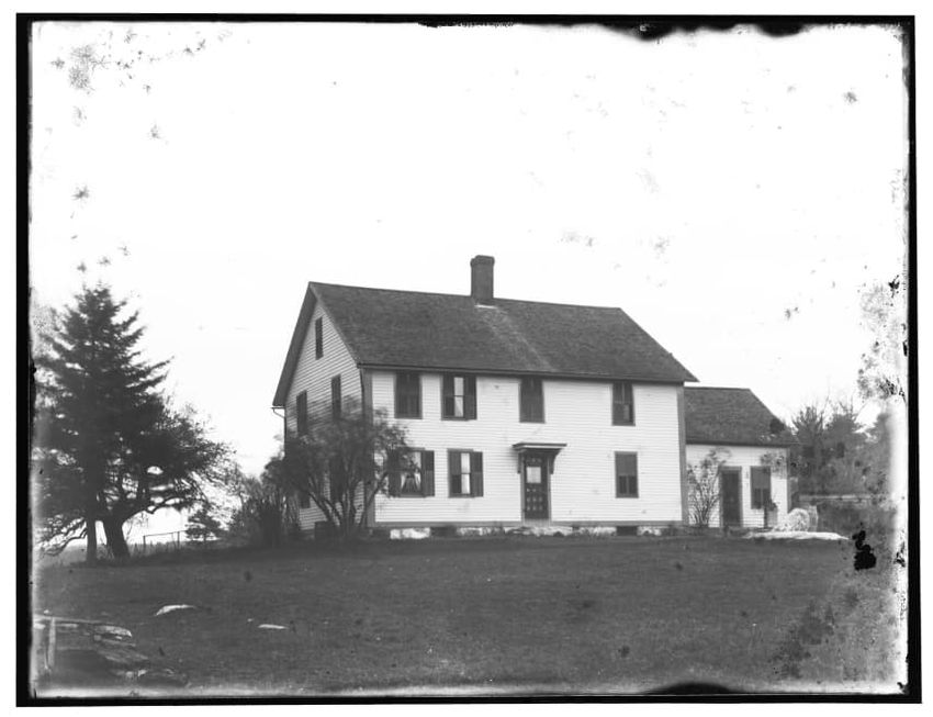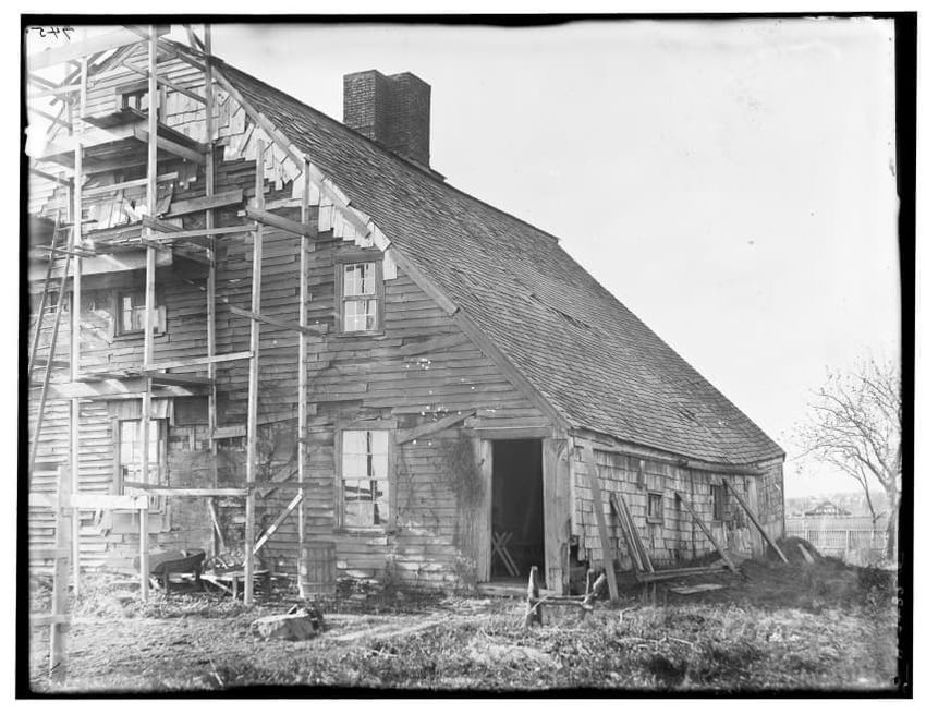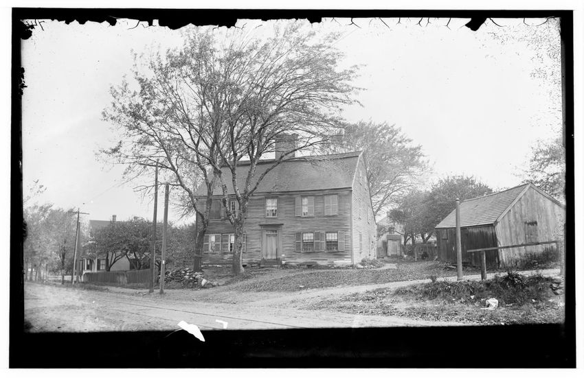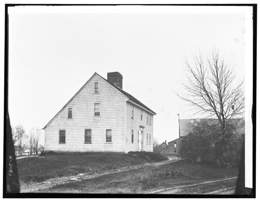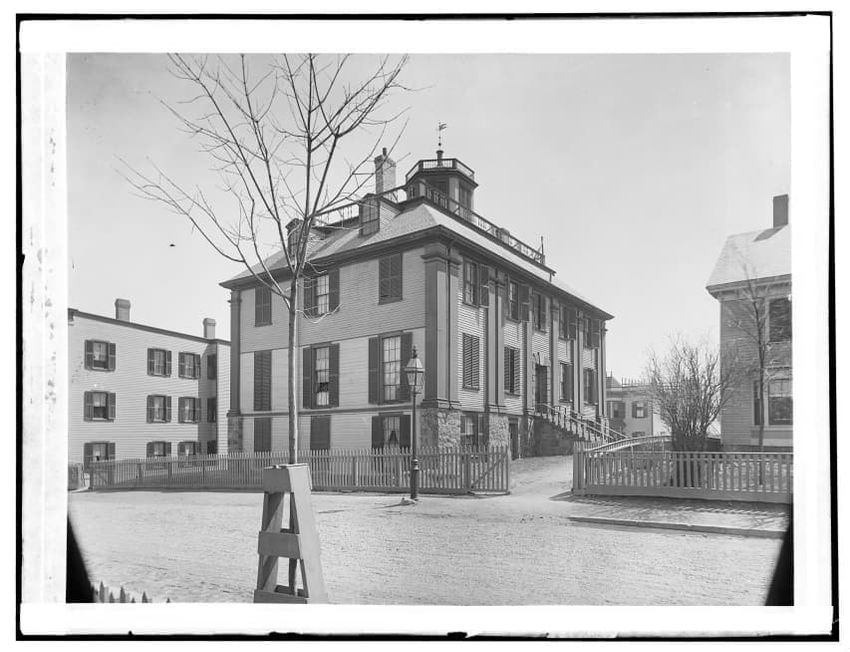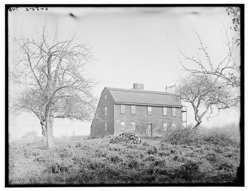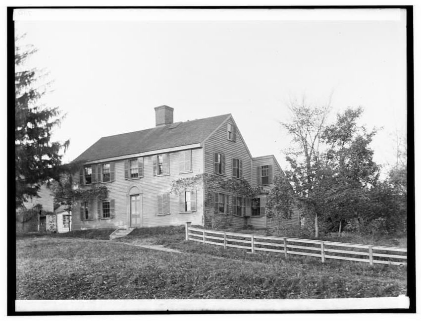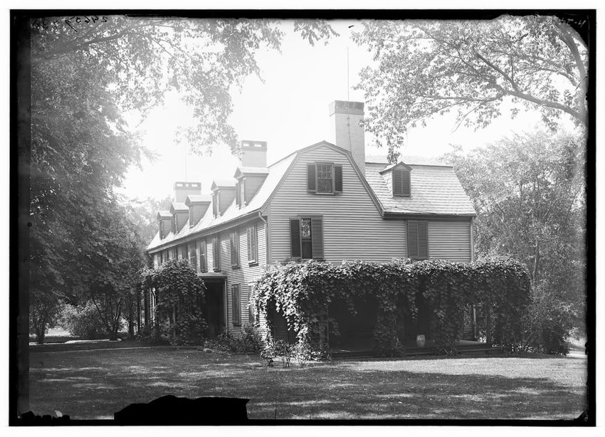 The image depicts the Quincy House in Neponset, Boston, Massachusetts. It is a large, multi-story building with a prominent staircase leading to the entrance. The house is adorned with several dormer windows on the roof and a covered porch extends around part of the structure. In the foreground, the...
