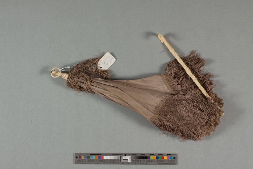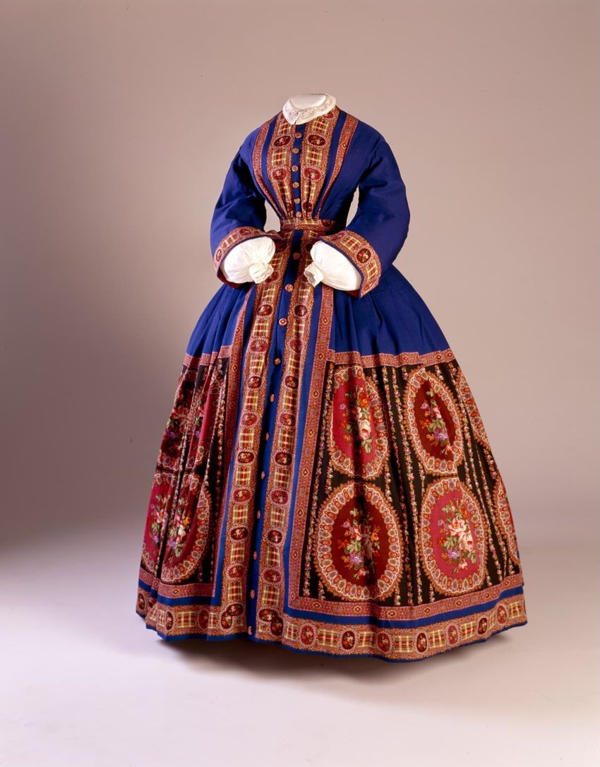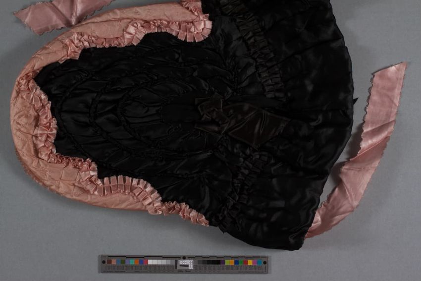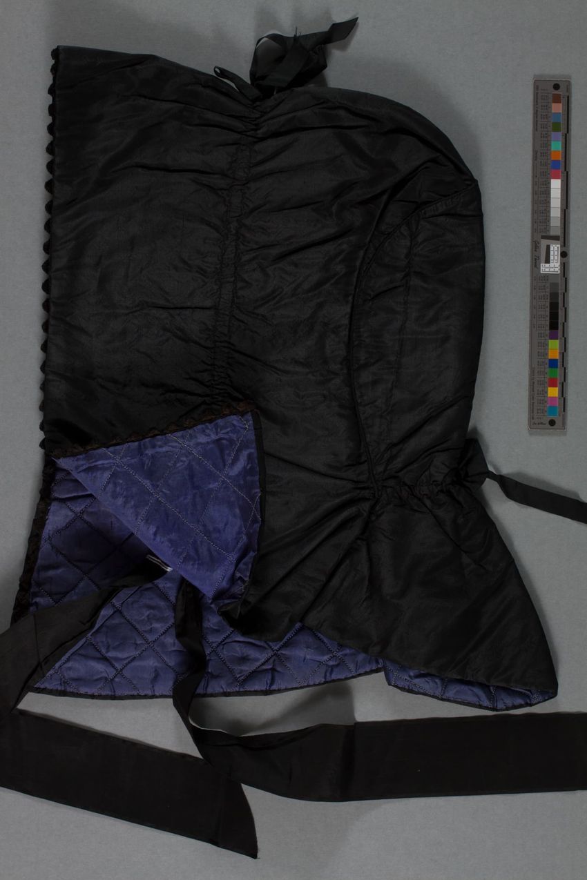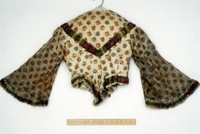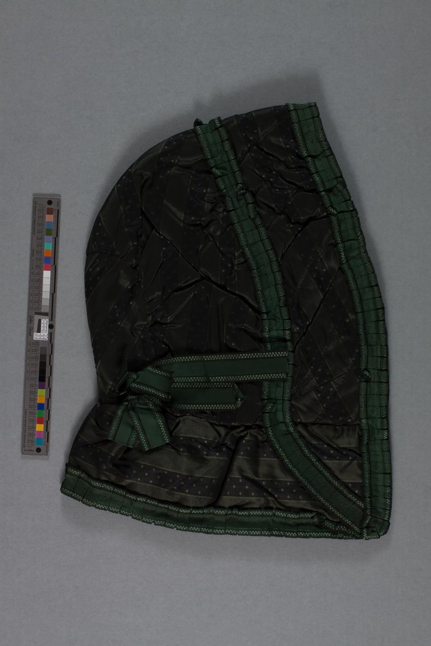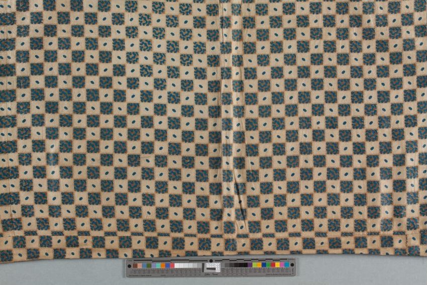 Panels of pieced, glazed plain weave cotton with roller print block print combination polychromatic repeating large scale floral motifs with sawtooth arc borders; heavy use of green, very busy with little white ground; edges bound in a striped honeycomb tape. Single panel, straight with honeycomb...