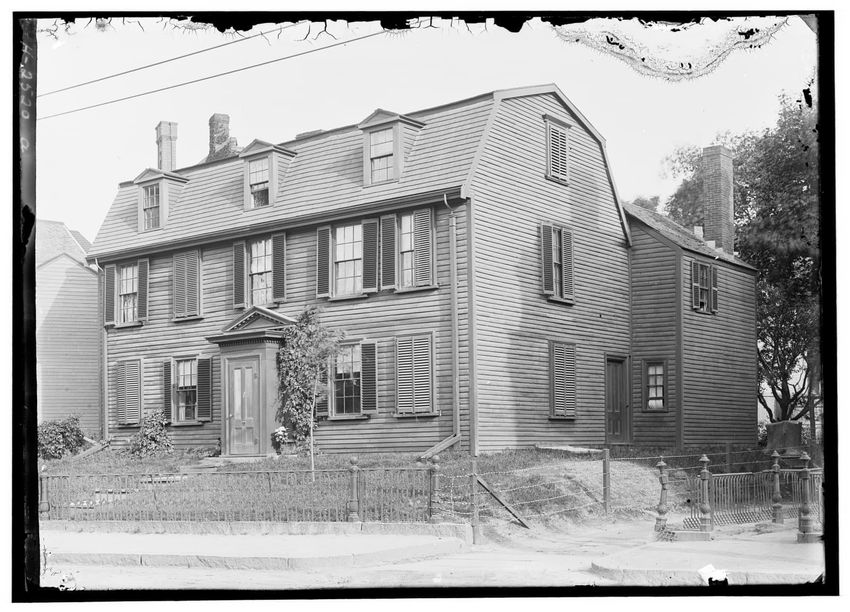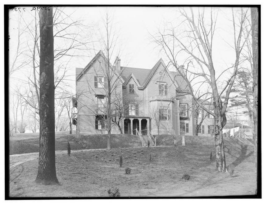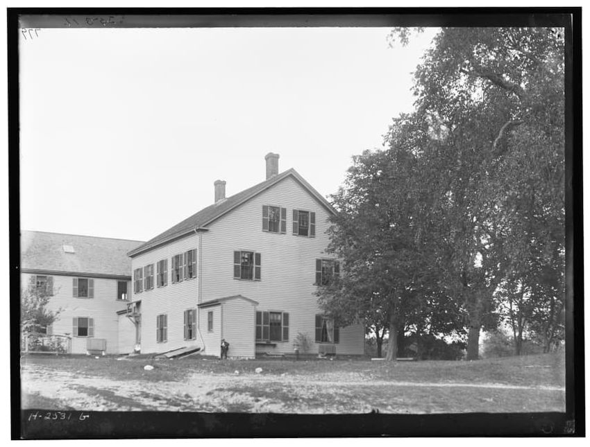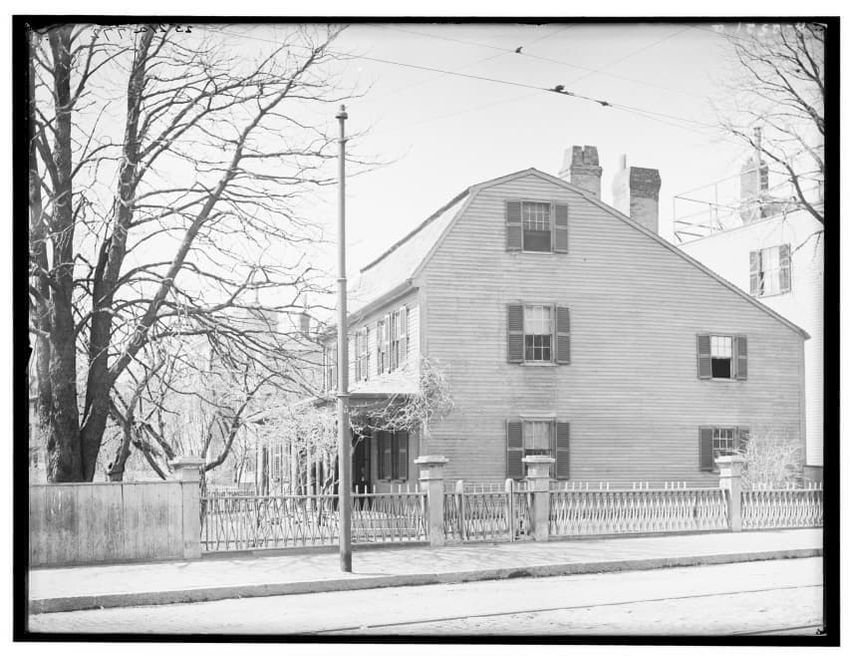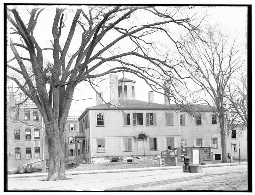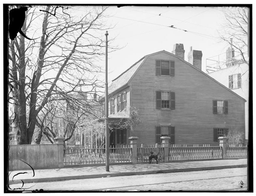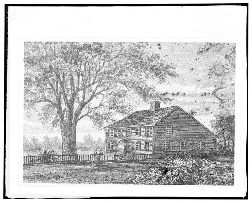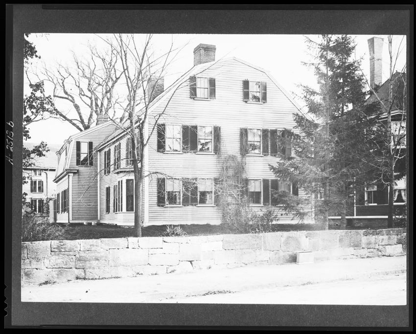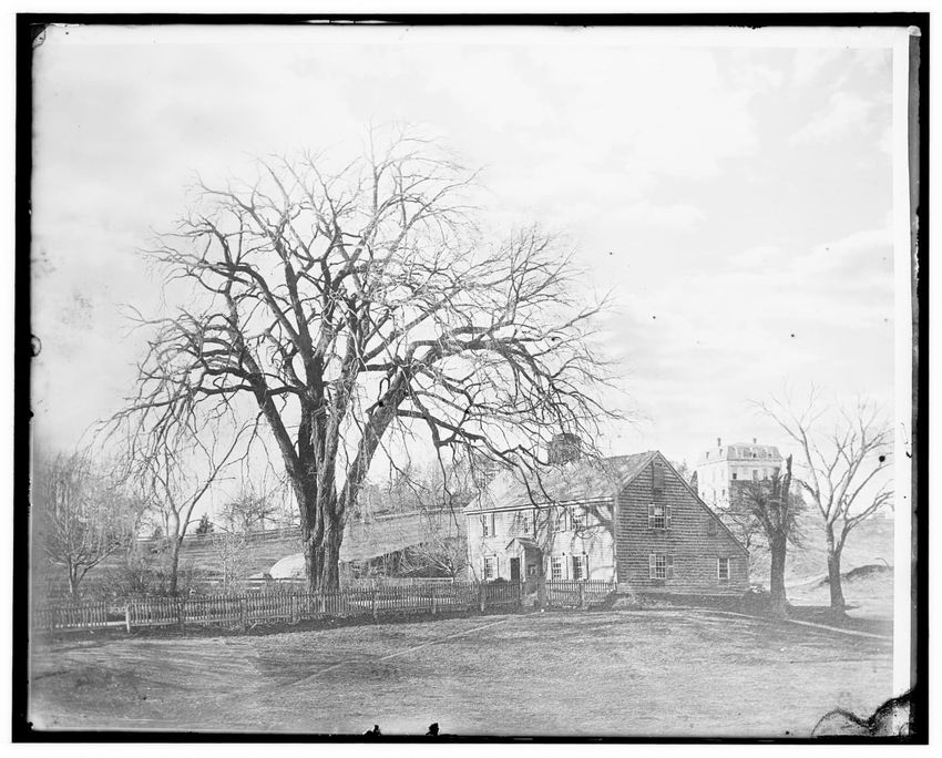 The image depicts Curtis House in Roxbury, Boston, Massachusetts. It shows a large, multi-story wooden building with several windows and a pitched roof, surrounded by a wooden fence. A prominent, leafless tree stands prominently in the foreground. In the background, another substantial building is v...