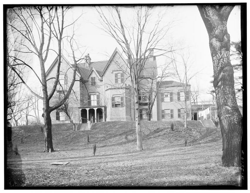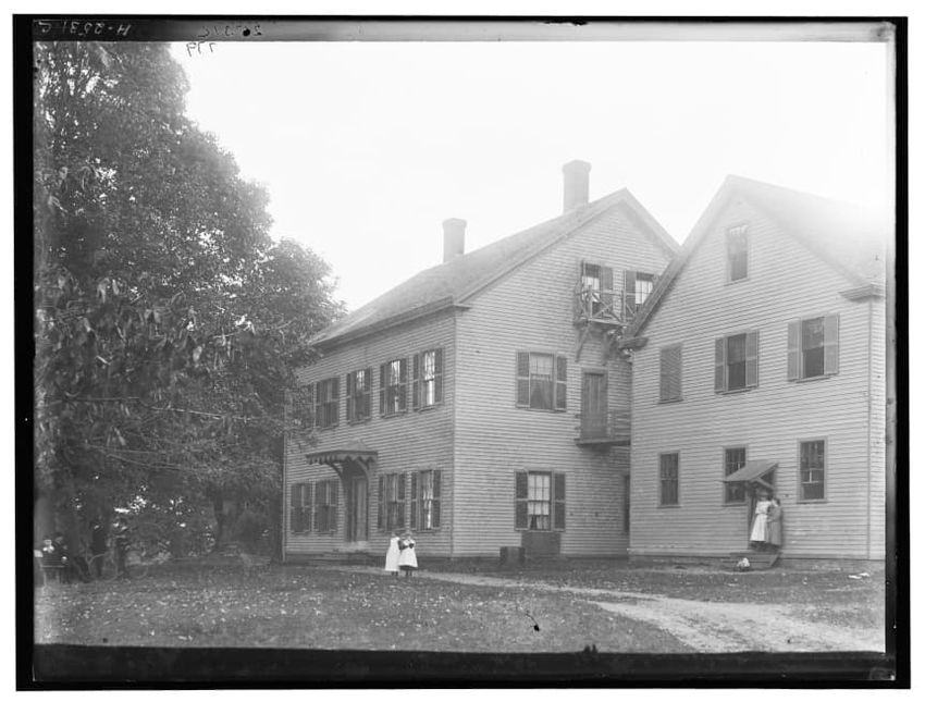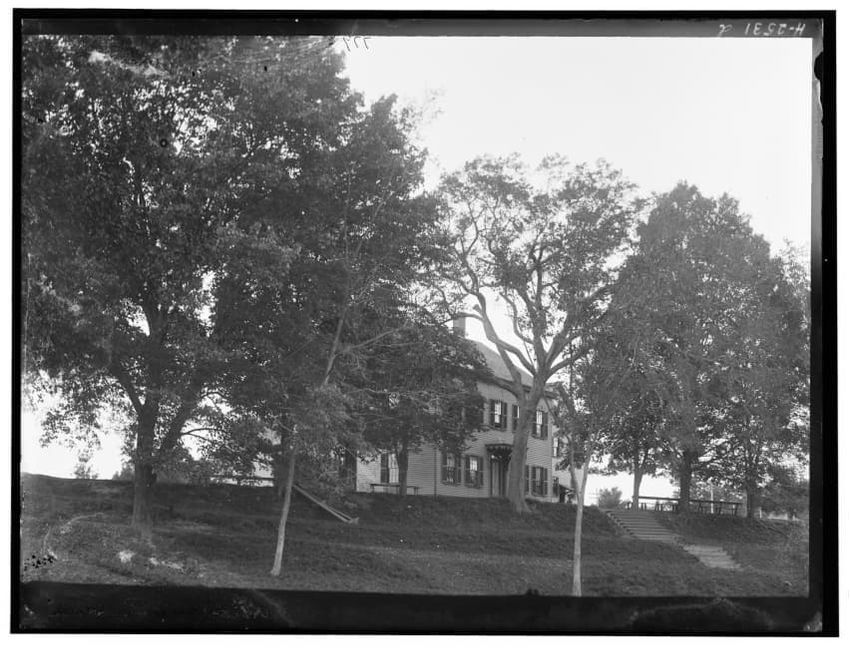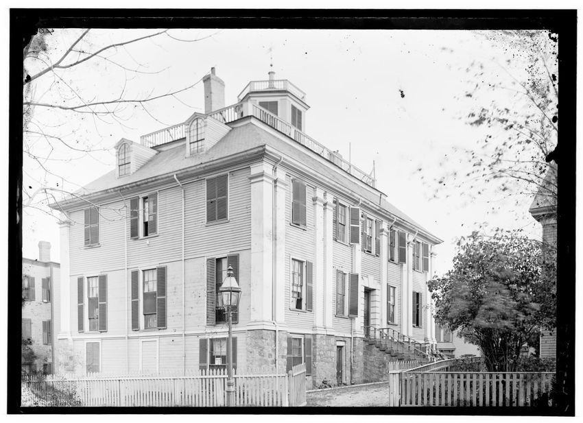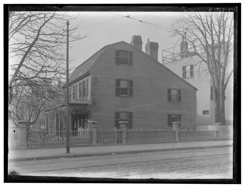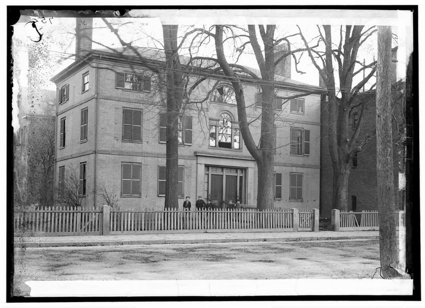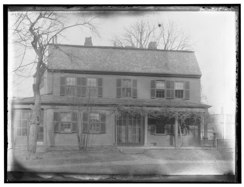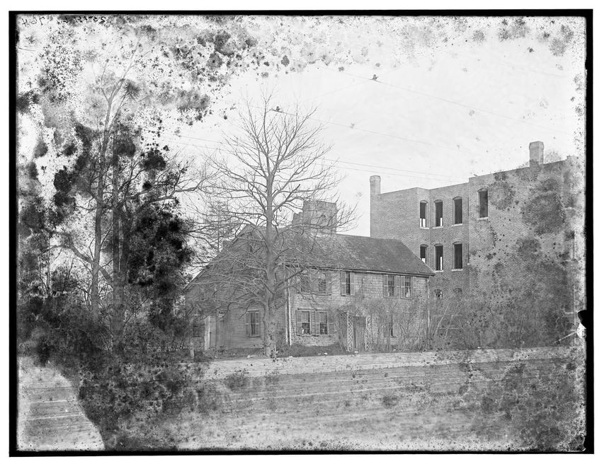 The image depicts Curtis House in Roxbury, Boston, Massachusetts. It shows a large, multi-story wooden building with several windows and a pitched roof, surrounded by a wooden fence. A prominent, leafless tree stands prominently in the foreground. In the background, another substantial building is v...