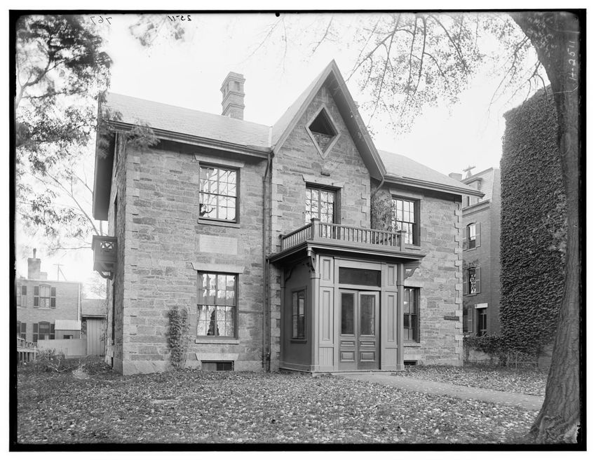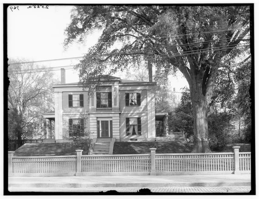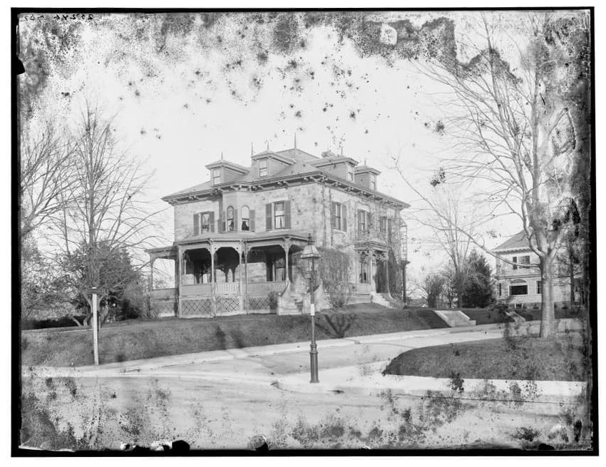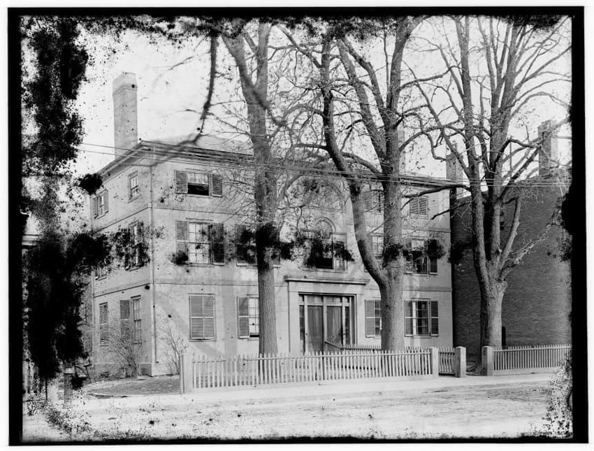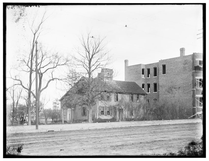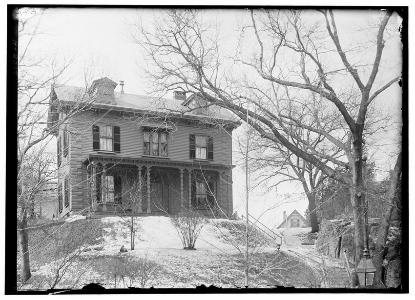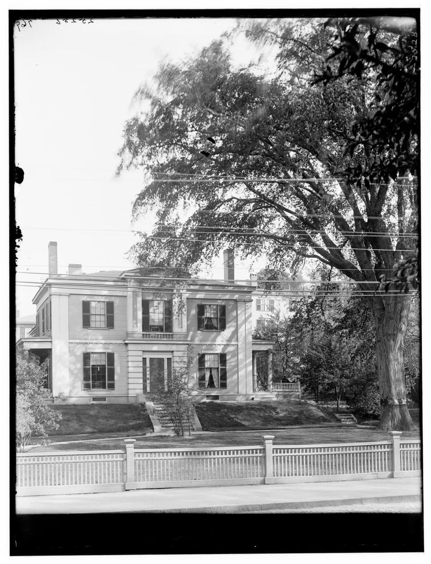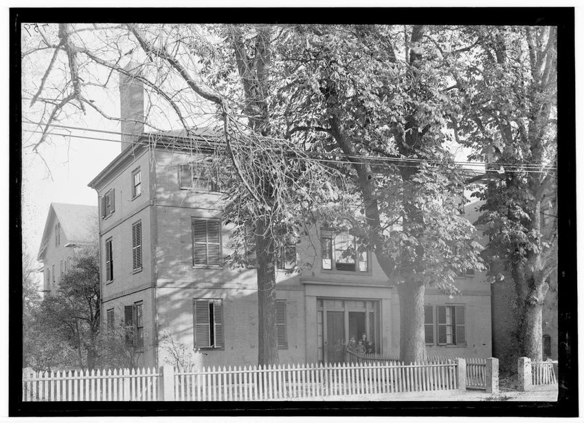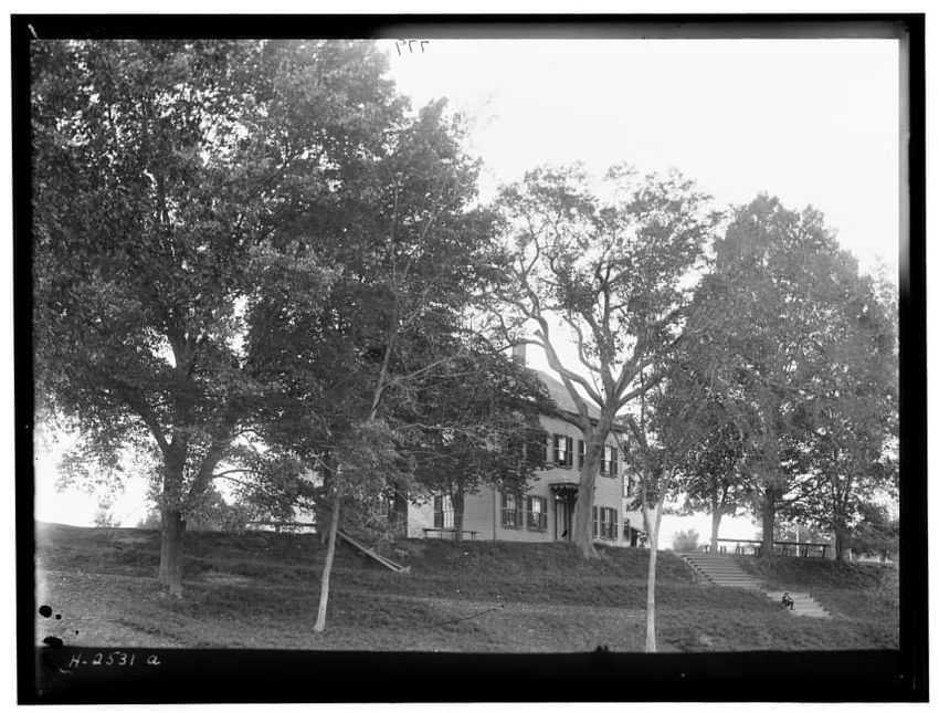 The image depicts Curtis House in Roxbury, Boston, Massachusetts. It shows a large, multi-story wooden building with several windows and a pitched roof, surrounded by a wooden fence. A prominent, leafless tree stands prominently in the foreground. In the background, another substantial building is v...