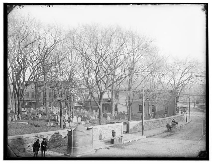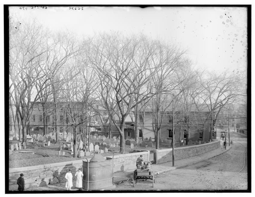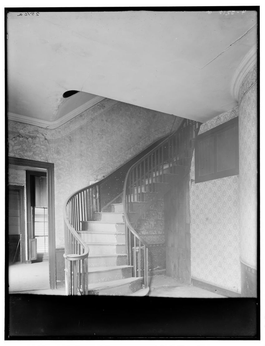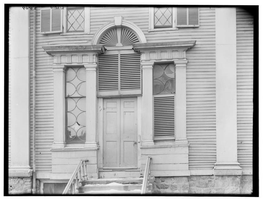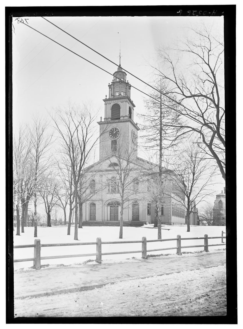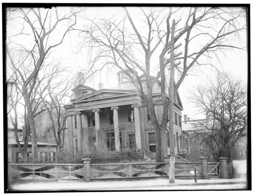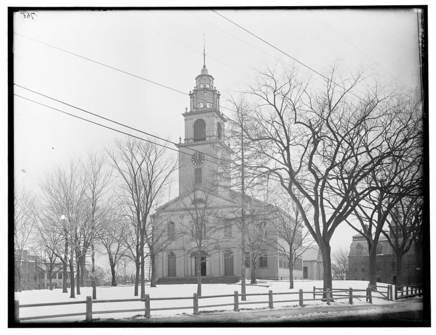 The image depicts Curtis House in Roxbury, Boston, Massachusetts. It shows a large, multi-story wooden building with several windows and a pitched roof, surrounded by a wooden fence. A prominent, leafless tree stands prominently in the foreground. In the background, another substantial building is v...