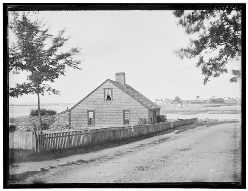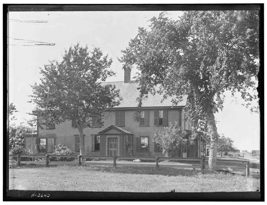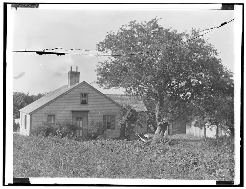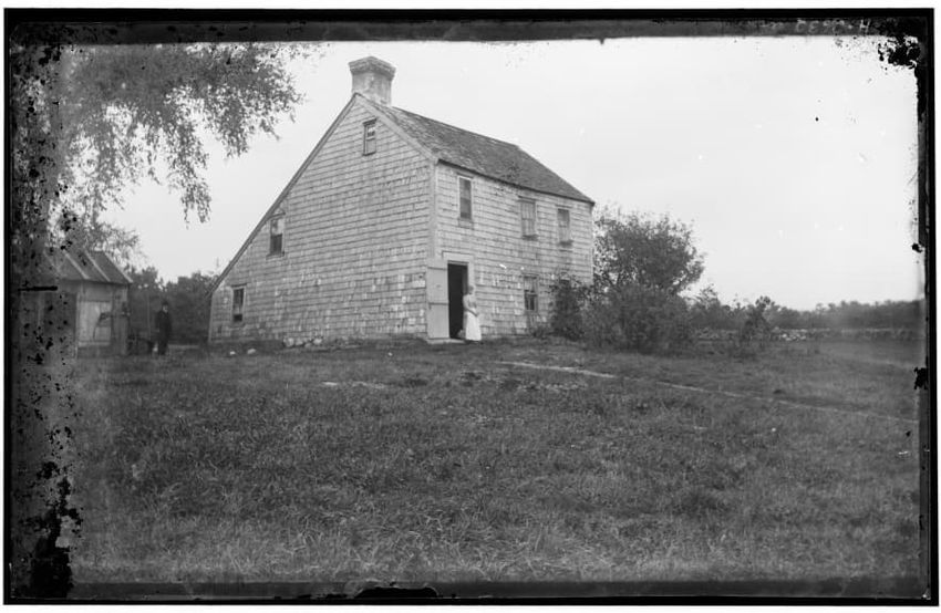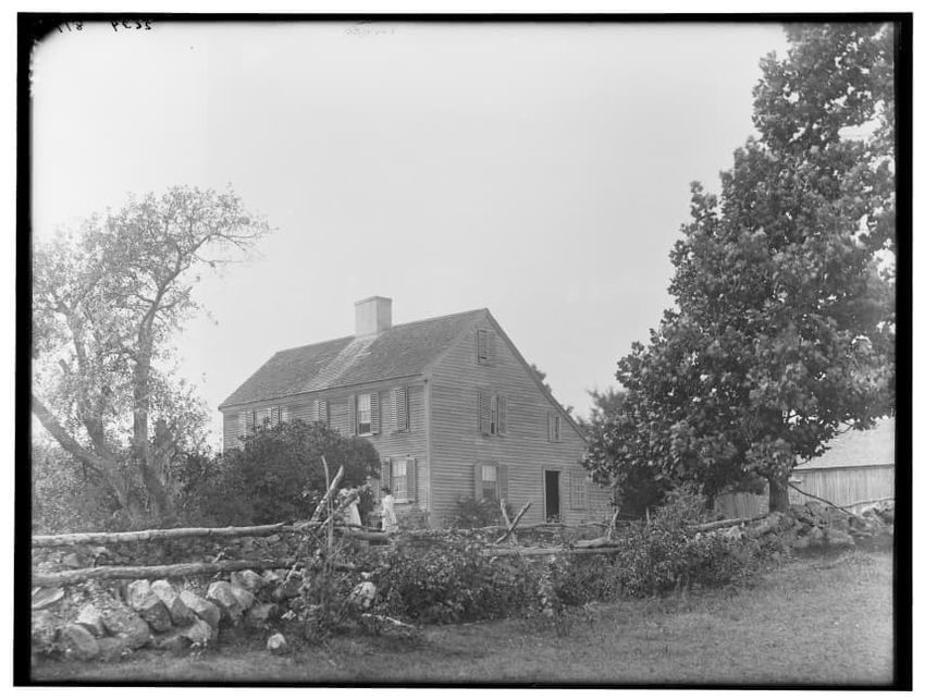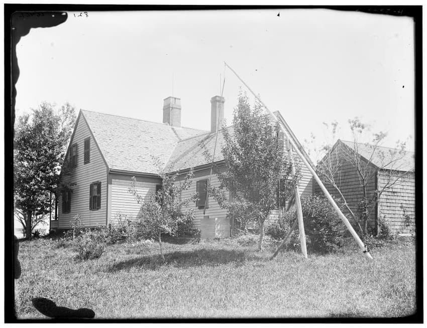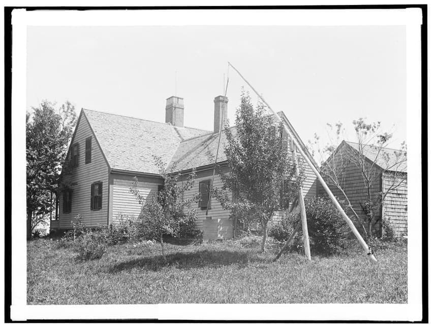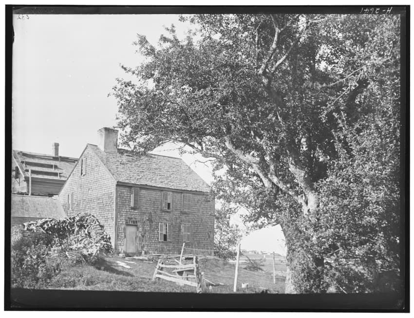 The image depicts Barker House in Pembroke, Massachusetts. The structure is a wooden, shingled building with multiple windows, located next to a large tree. In the foreground, there is a substantial pile of chopped wood, barrels, and crates scattered around the area.