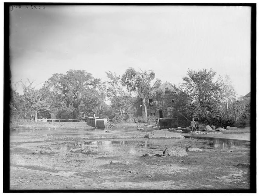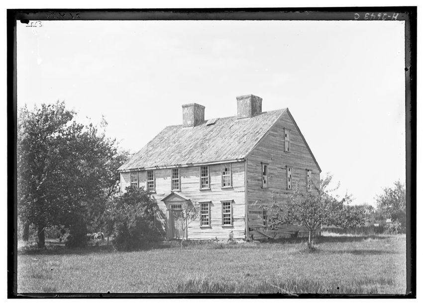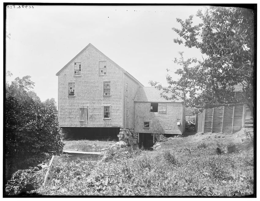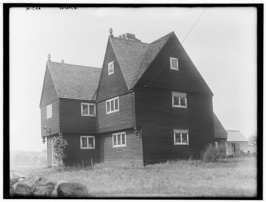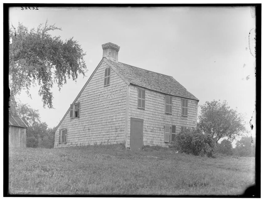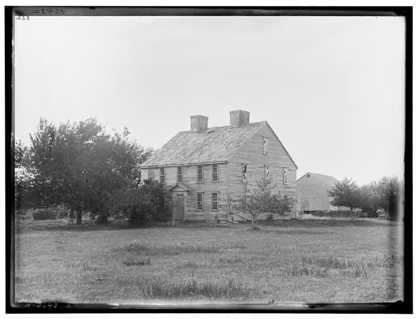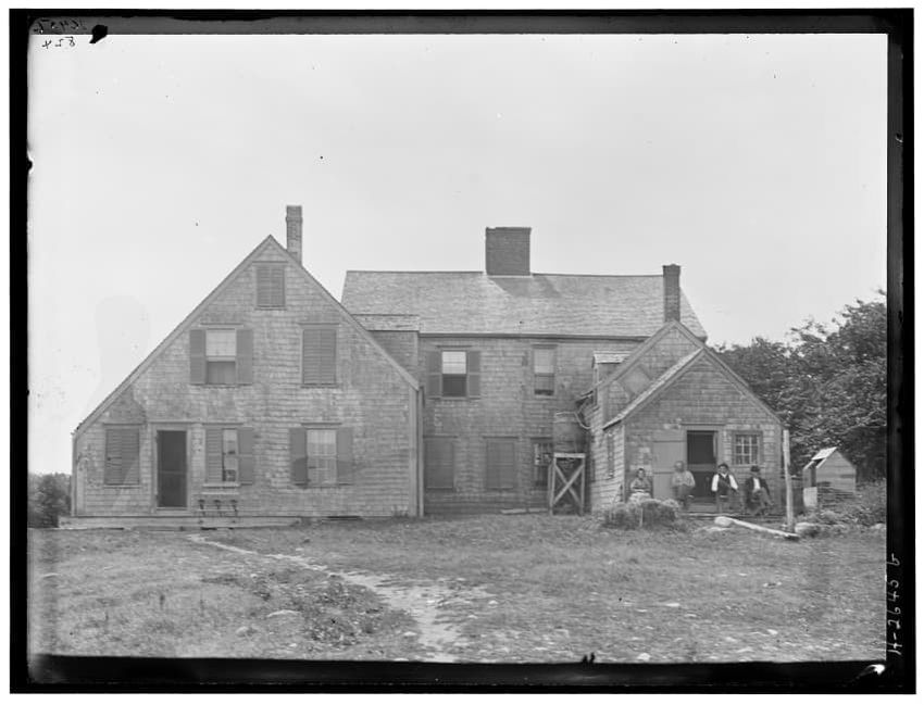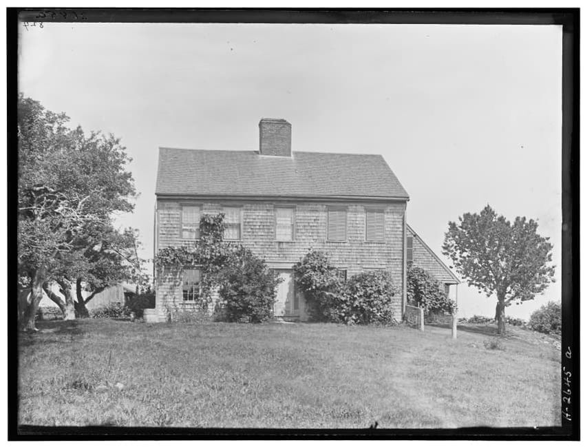 The image depicts Barker House in Pembroke, Massachusetts. The structure is a wooden, shingled building with multiple windows, located next to a large tree. In the foreground, there is a substantial pile of chopped wood, barrels, and crates scattered around the area.