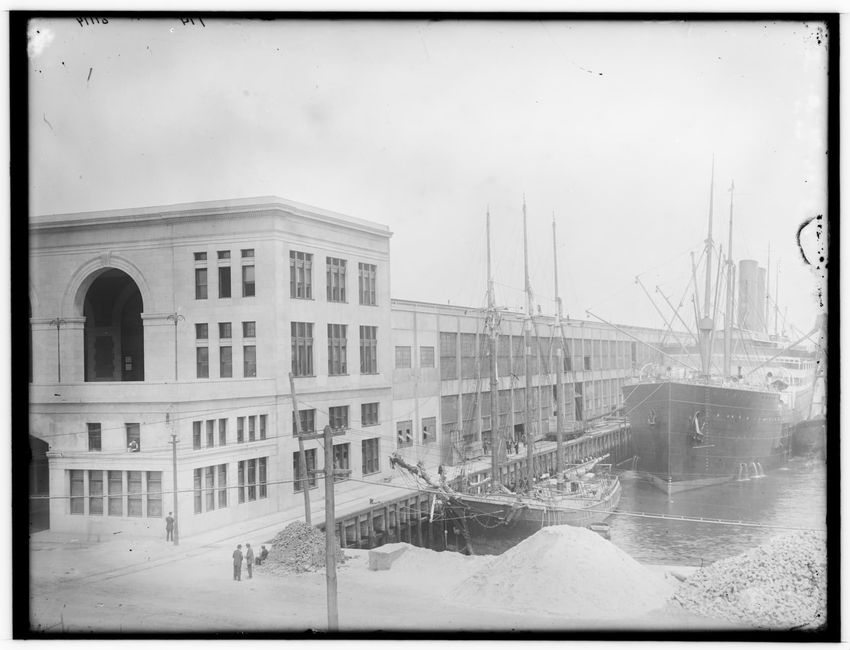 The image depicts Commercial Wharf in Boston, Massachusetts. It features a large, multi-story brick building with multiple rows of windows, situated along the water's edge. Several ships are docked alongside the wharf, including a large steamship and smaller sailing vessels. There are piles of mater...