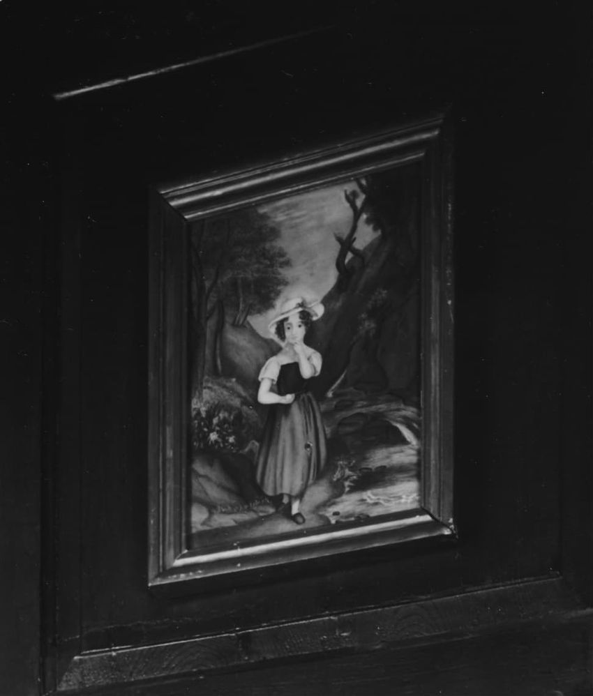 Portrait of a young girl walking in the woods; blue bodice, white sleeves, straw hat.