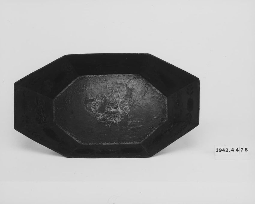 Black, red, and green rectangular trinket box with a slightly hipped lid; fruit and floral spray; gilt decoration.