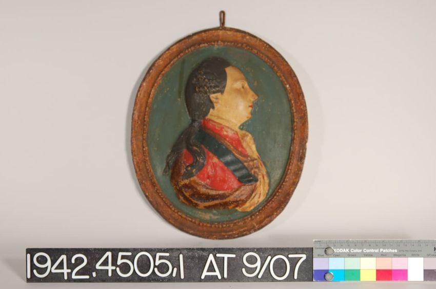 Bust-length profile portrait of George III, King of Great Britain, in a red coat and blue sash on a green ground.