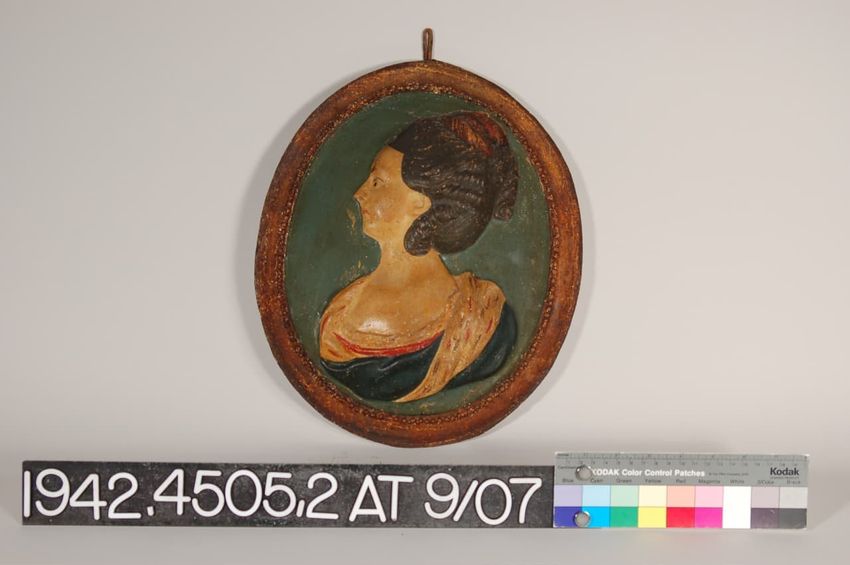 Bust-length, profile portrait of Queen Charlotte, with black hair, black dress, and gold sash, on green ground.