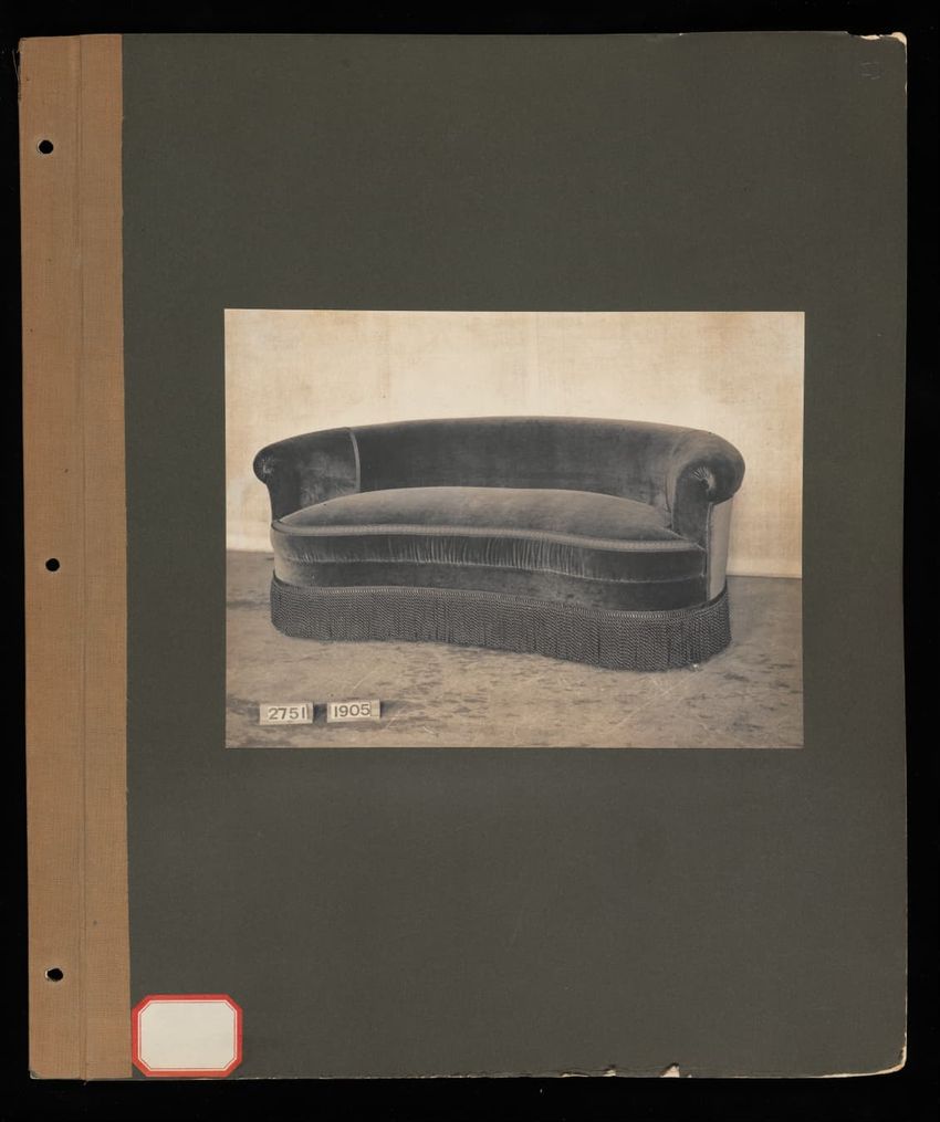 Photo album titled: "Hall Seats: Stuffed Sofas, Georgian Sofas, Miscellaneous Stuffed Sofas 47." Title is hand printed in black on front cover; title, subtitle, and volume number are hand printed in black on spine. Album has a beige fabric covering and 124 dark gray pages, most of which are now loo...