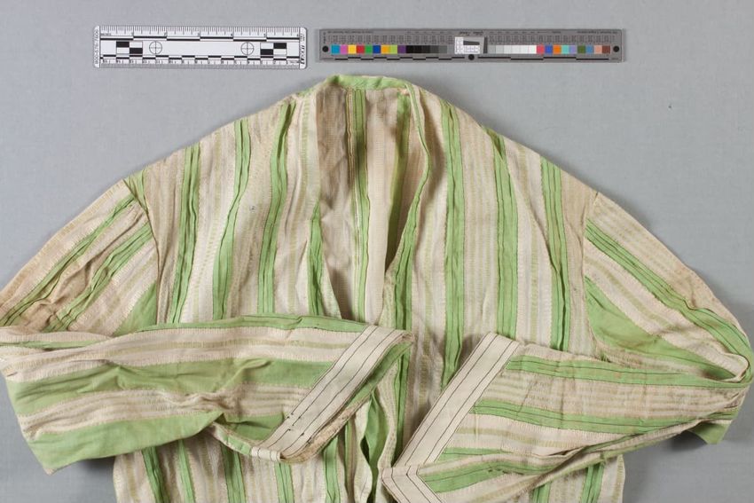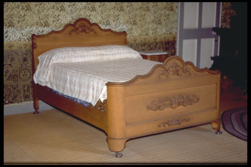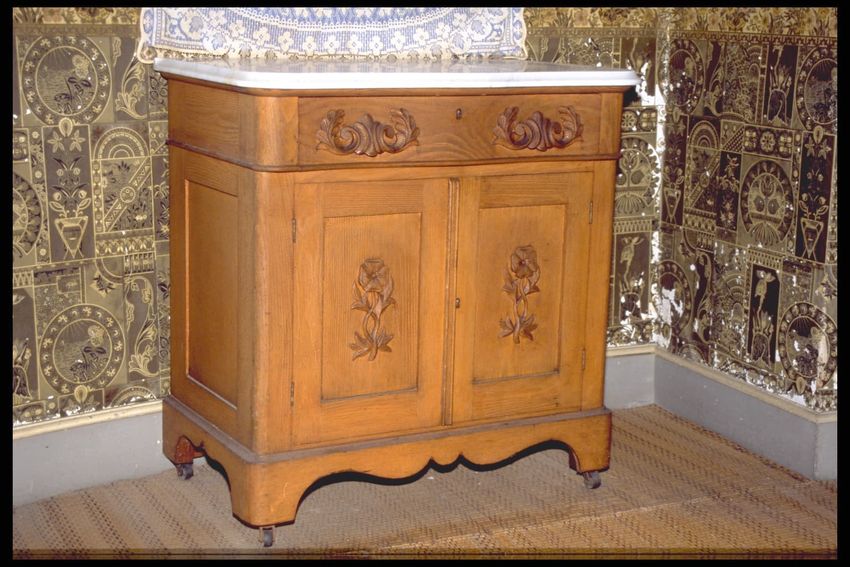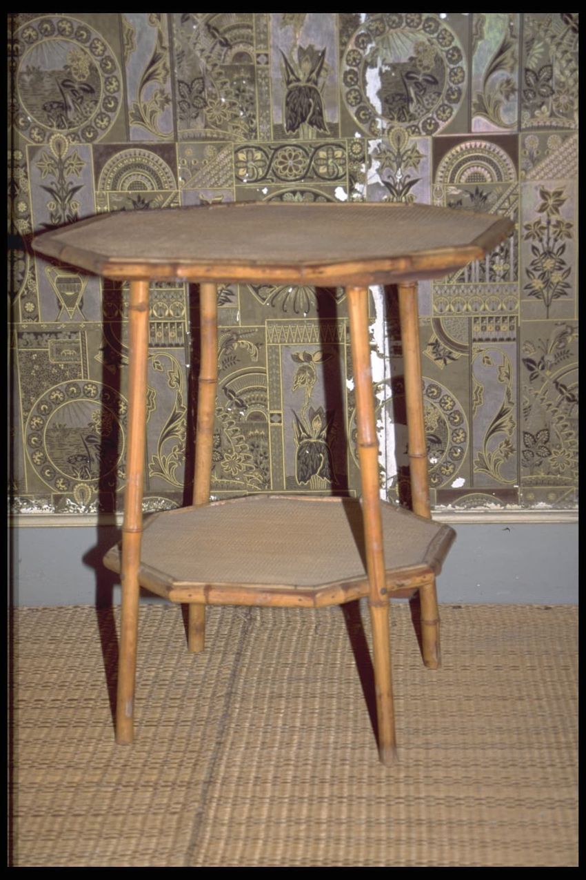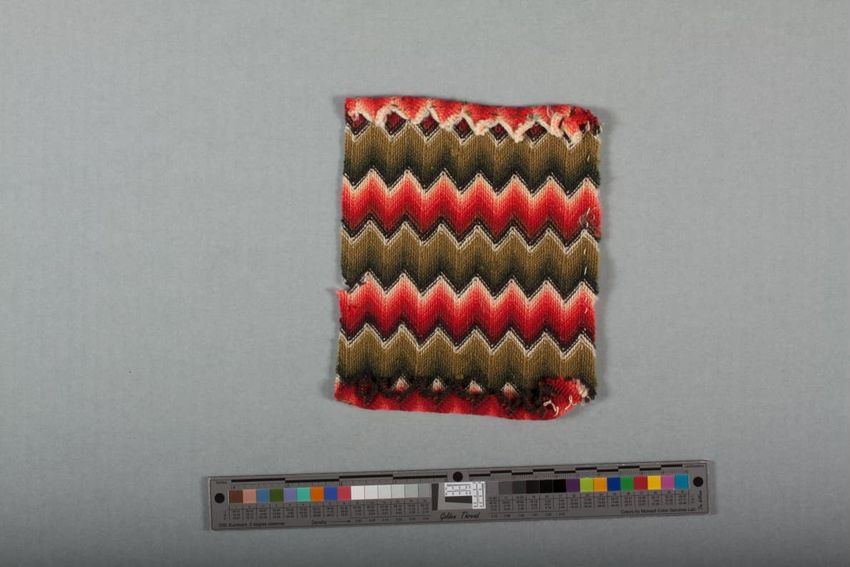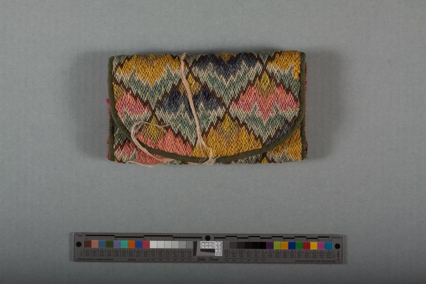 Flamestitch - large scale diamond pattern in yellow, red, purple, green, rust, outlined with wide border of black; edged with green twill tape; opens side by side with four pockets, lined with green (wool) camlet.