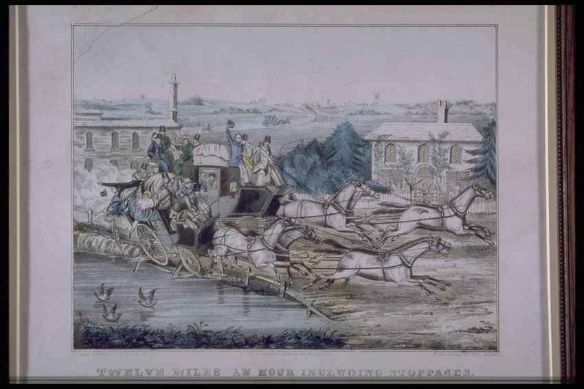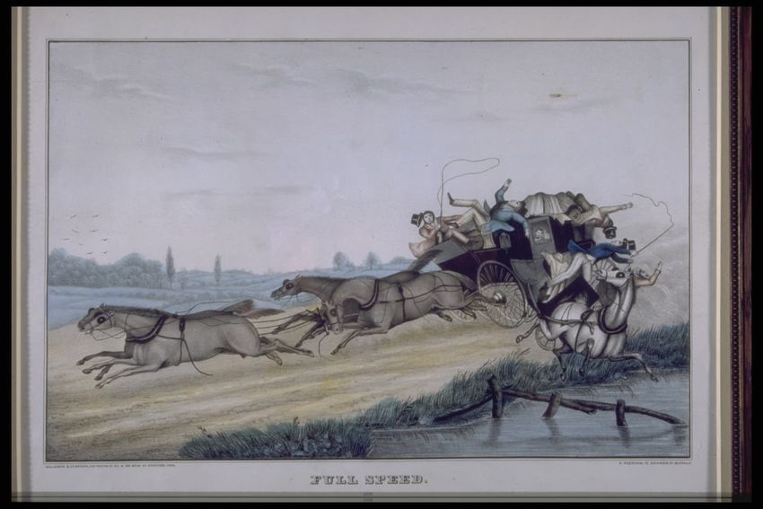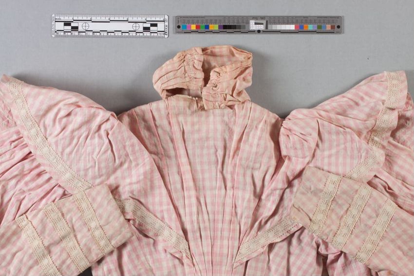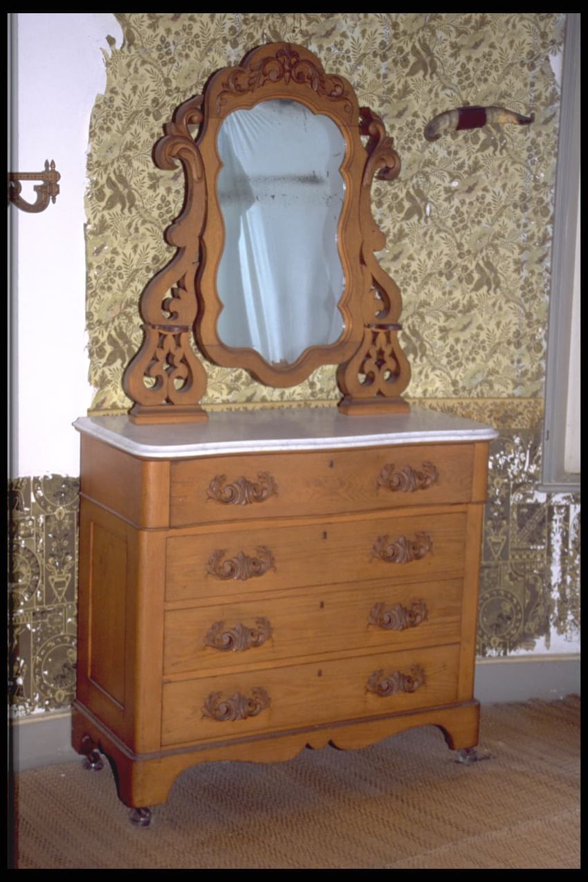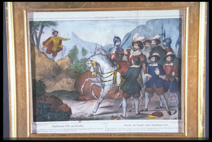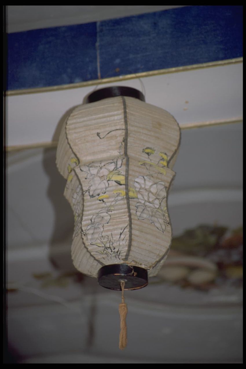 Flamestitch - large scale diamond pattern in yellow, red, purple, green, rust, outlined with wide border of black; edged with green twill tape; opens side by side with four pockets, lined with green (wool) camlet.