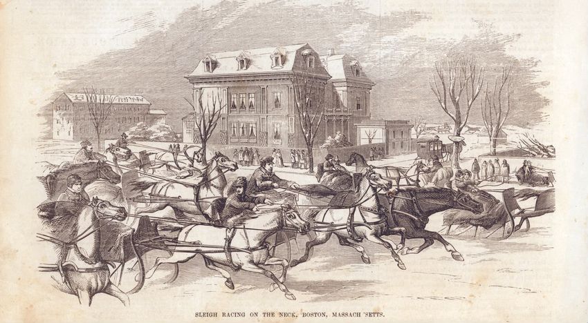 "The expressive picture which we present below was taken by our artist, a few days since, during the height of the sleighing sport on the Neck, nearly opposite the famous Decon Mansion, which is seen in the background. The Neck has, for a few years past, been turned into a perfect race-course durin...