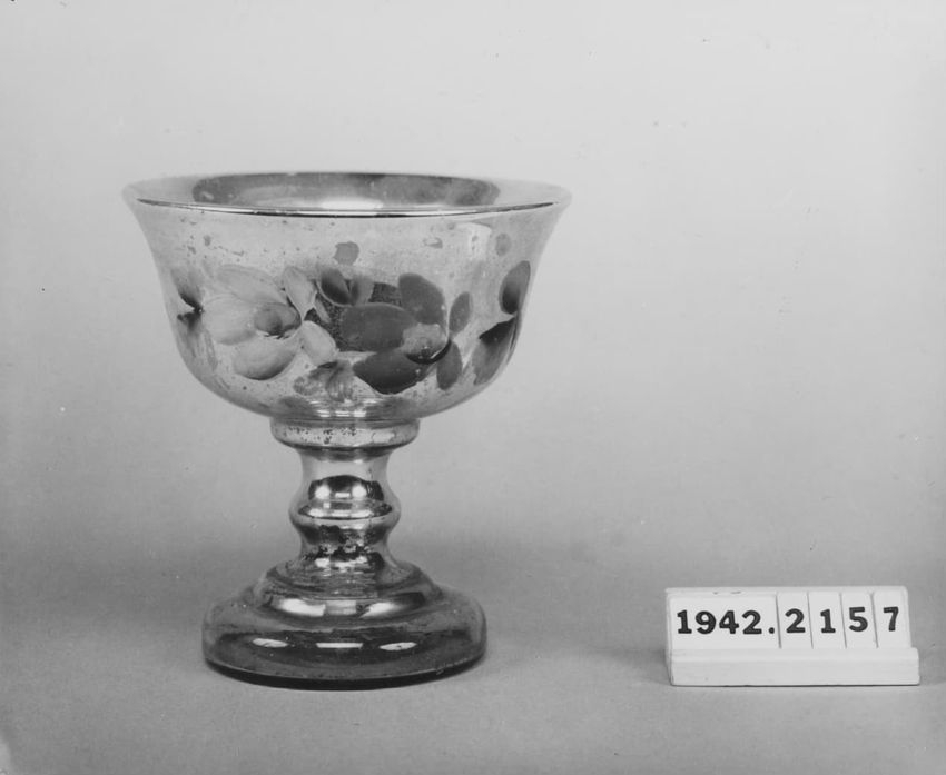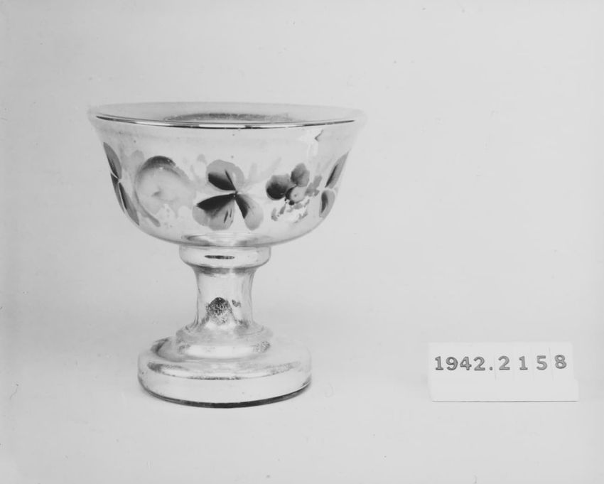 Silver, orange, and green compote with a circular domed foot, reel stem, and an enameled floral and mercury decoration. One of a set of four.