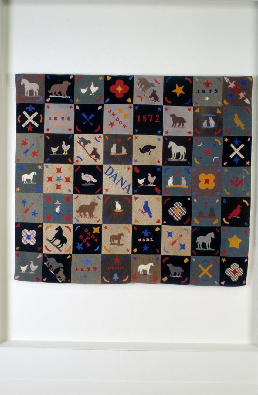 Eight rows of eight pieced wool blocks each with an appliqued wool design. Three blocks dated 1854. Motifs include pinwheels, stars, animals, sprigs, etc.