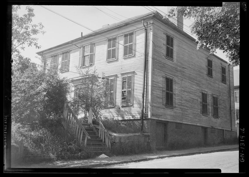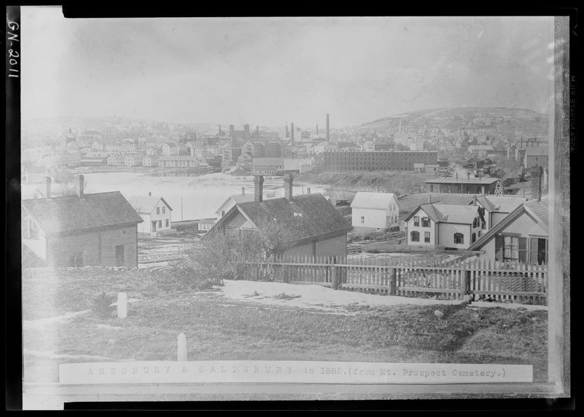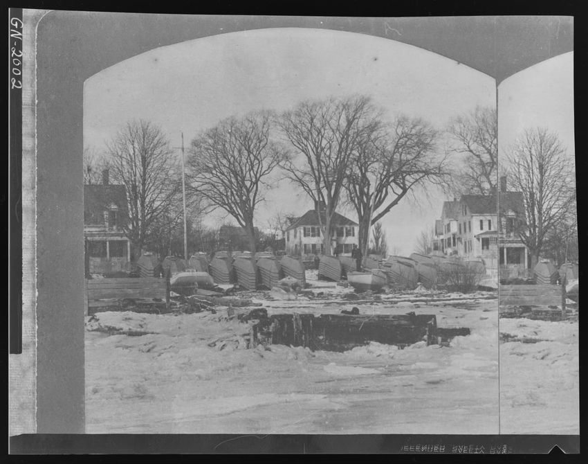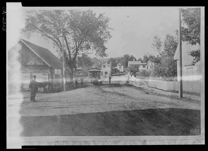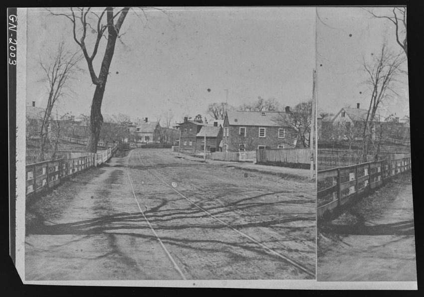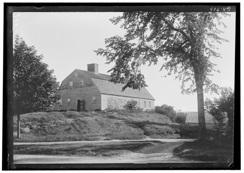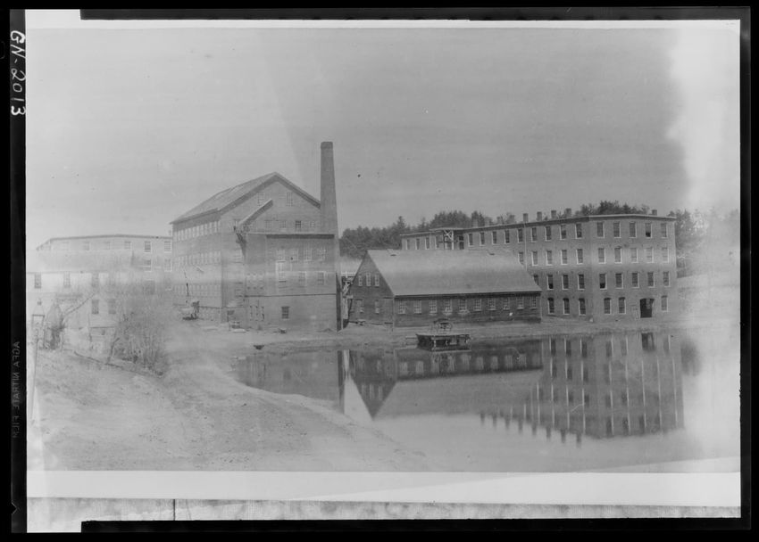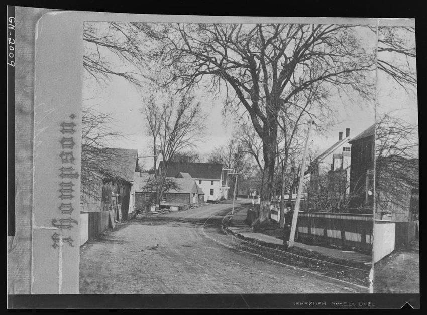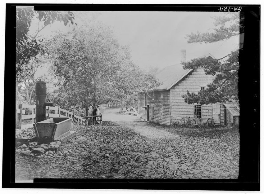 The image shows Curzon Mill in Newburyport, Massachusetts. The scene includes a wooden building on the right, with a shingled exterior and multiple windows. A dirt path runs alongside the building, surrounded by trees. On the left, a wooden fence and a large wooden trough near a vertical cylinder ar...