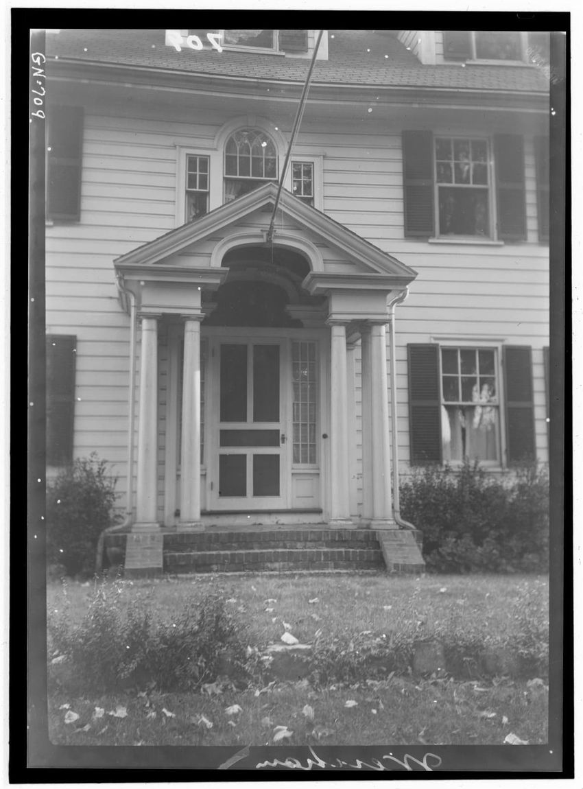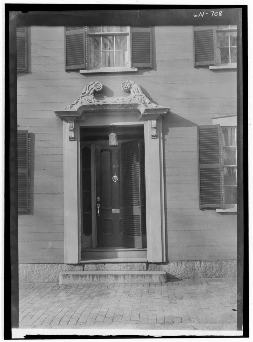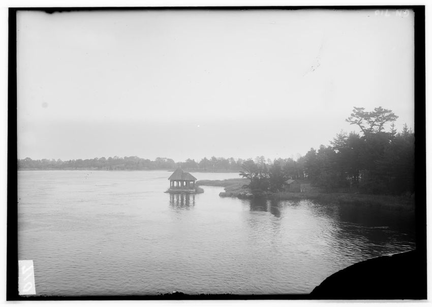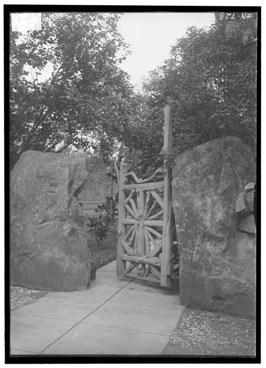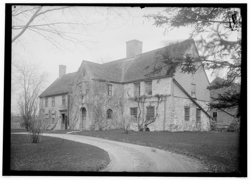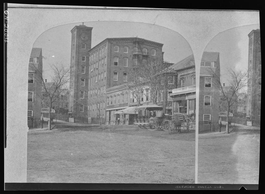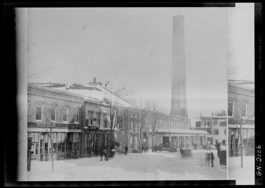 The image shows Curzon Mill in Newburyport, Massachusetts. The scene includes a wooden building on the right, with a shingled exterior and multiple windows. A dirt path runs alongside the building, surrounded by trees. On the left, a wooden fence and a large wooden trough near a vertical cylinder ar...