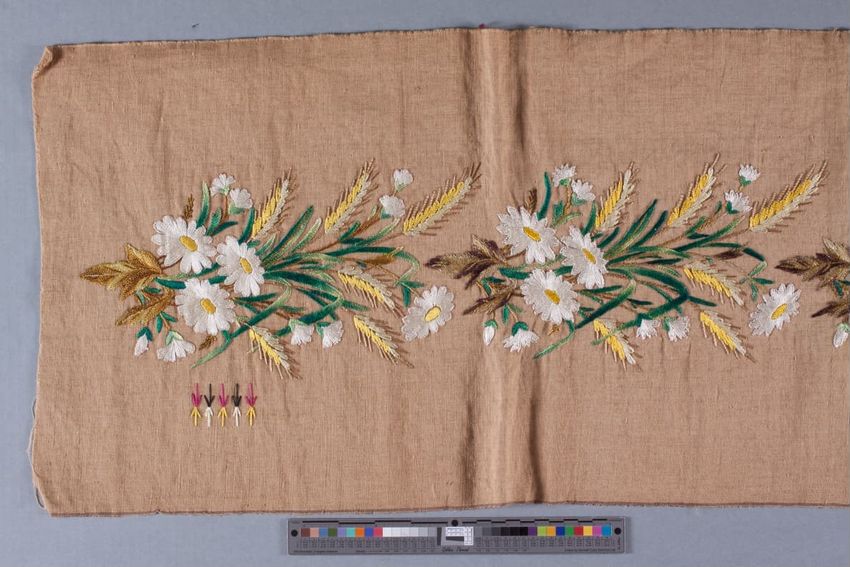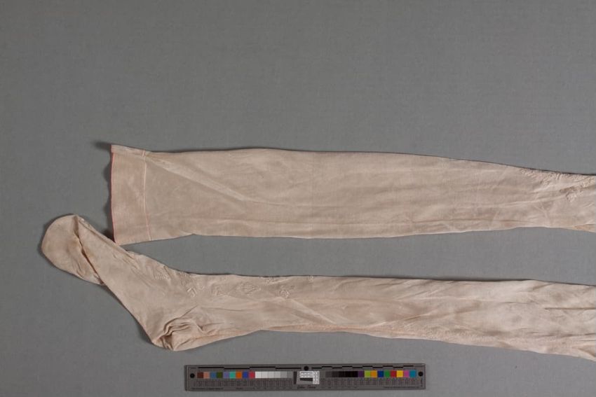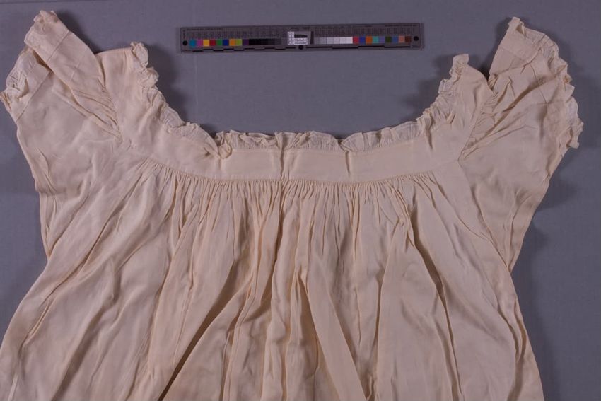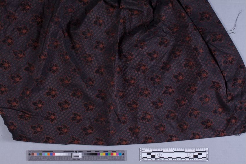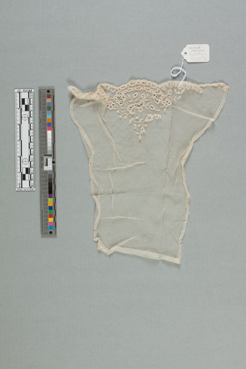 Light blue iridescent taffeta; bateau neckline edged w/ lace.  Cap sleeves w/ piped arm's eye.  Pointed front & back; boned & lined w/ linen.  Hand-sewn eyes at center back for laced closure.  Skirt has cotton waistband w/ hook & eye closure; box pleats at front.  Cartridge pleats & crinoline at bac...
