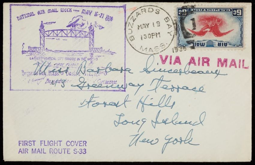 Fiirst Flight Cover Air Mail Route S-33, Buzzards Bay to Boston, Mass., May 19, 1938. Stamped, postmarked, envelope, National Air Mail Week, May 15 - 21, 1938 with cachet, of "largest vertical lift bridge in the world, Buzzard's Bay, Mass".