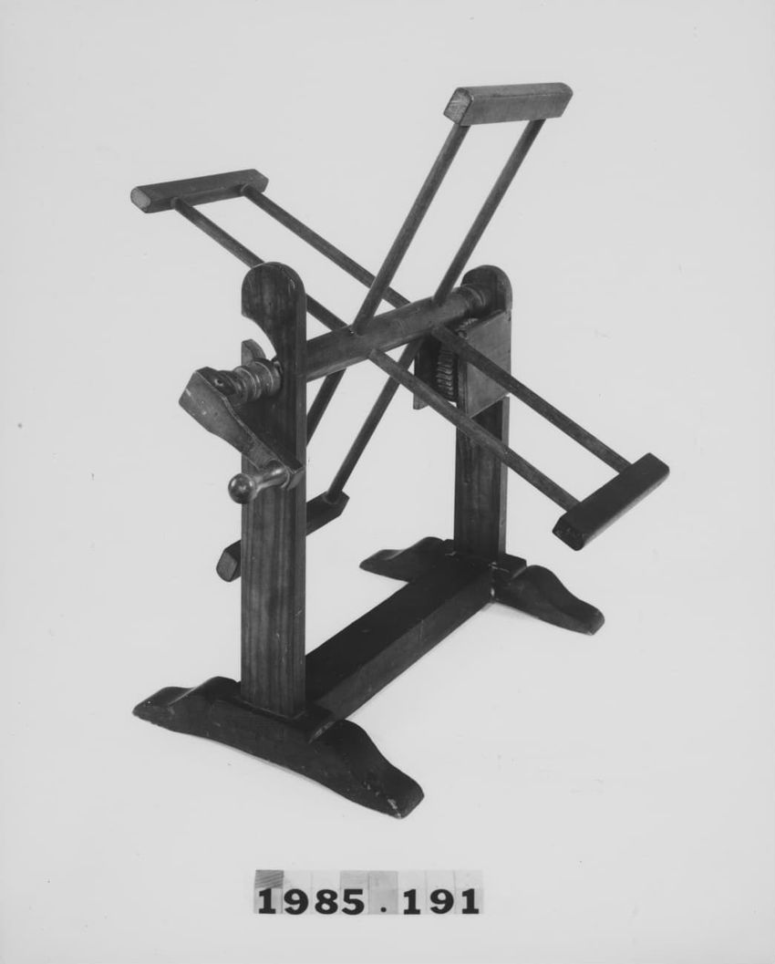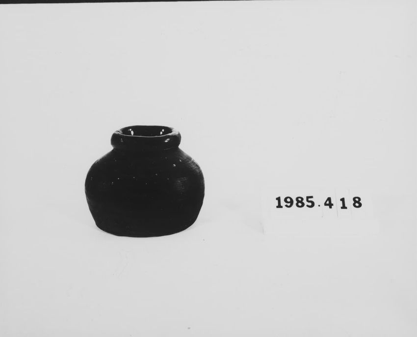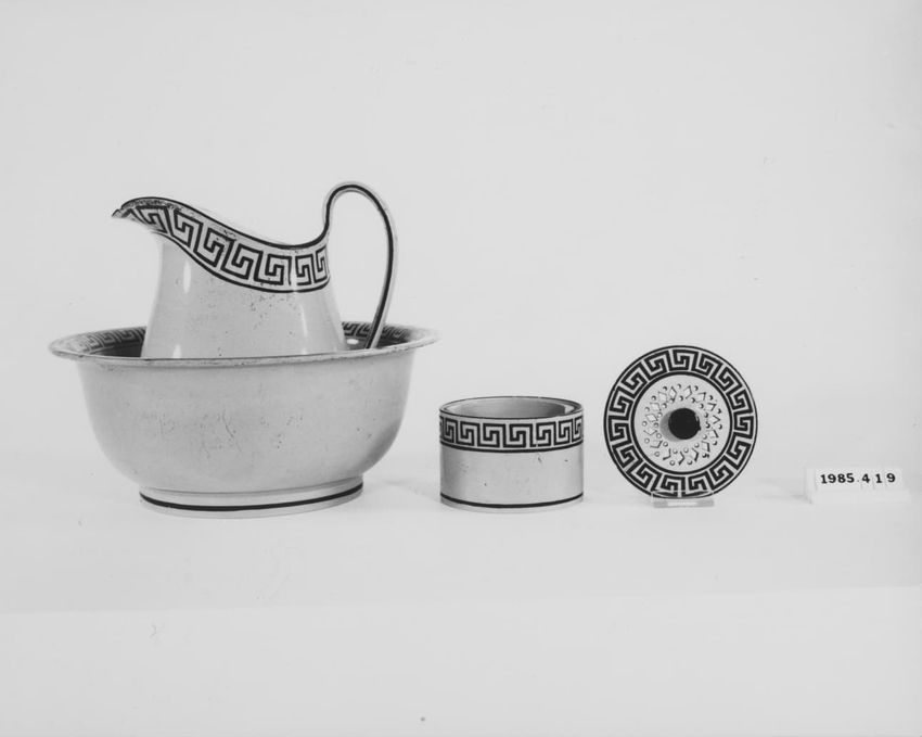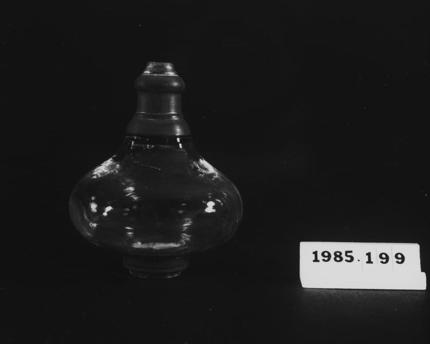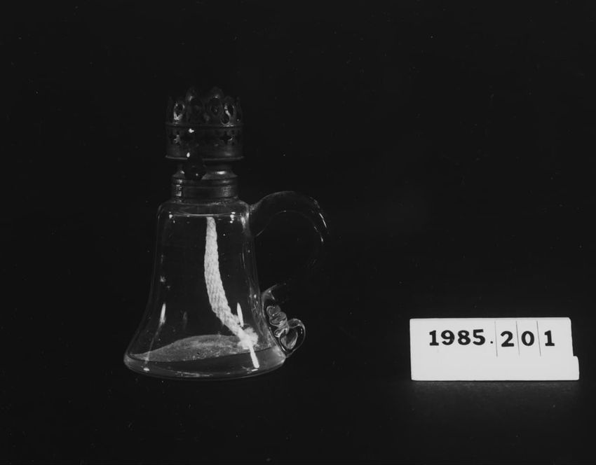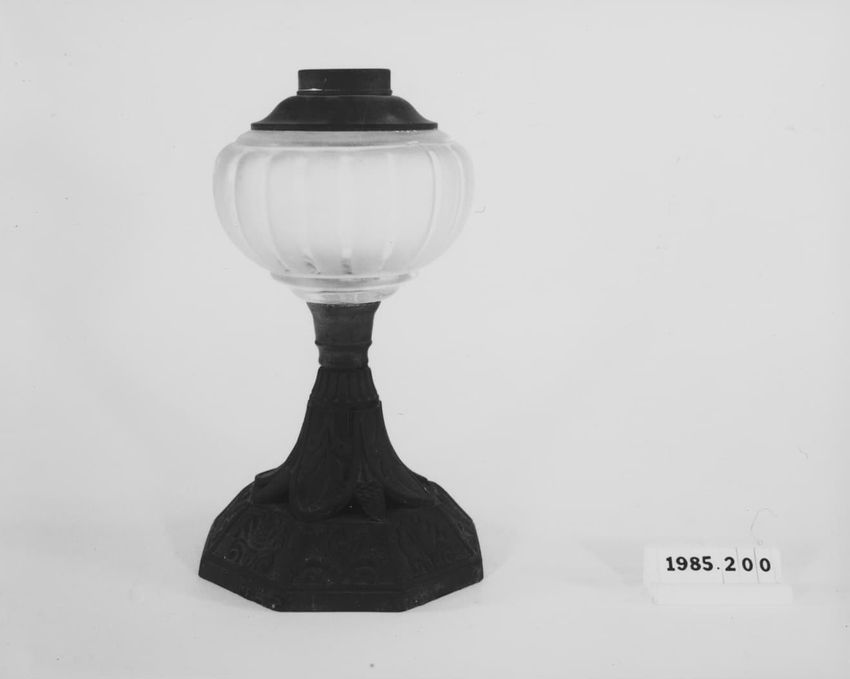 Three-part molded glass font. Frosted colorless ribbed, squat, circular body, surmounted by a cylindrical brass collar w/ domed mount. Threaded to receive burner. Slightly shaped base metal stem set in cast iron base. Base is hexagonal w/ a stylized floral element on each facade, surmounted by a sli...