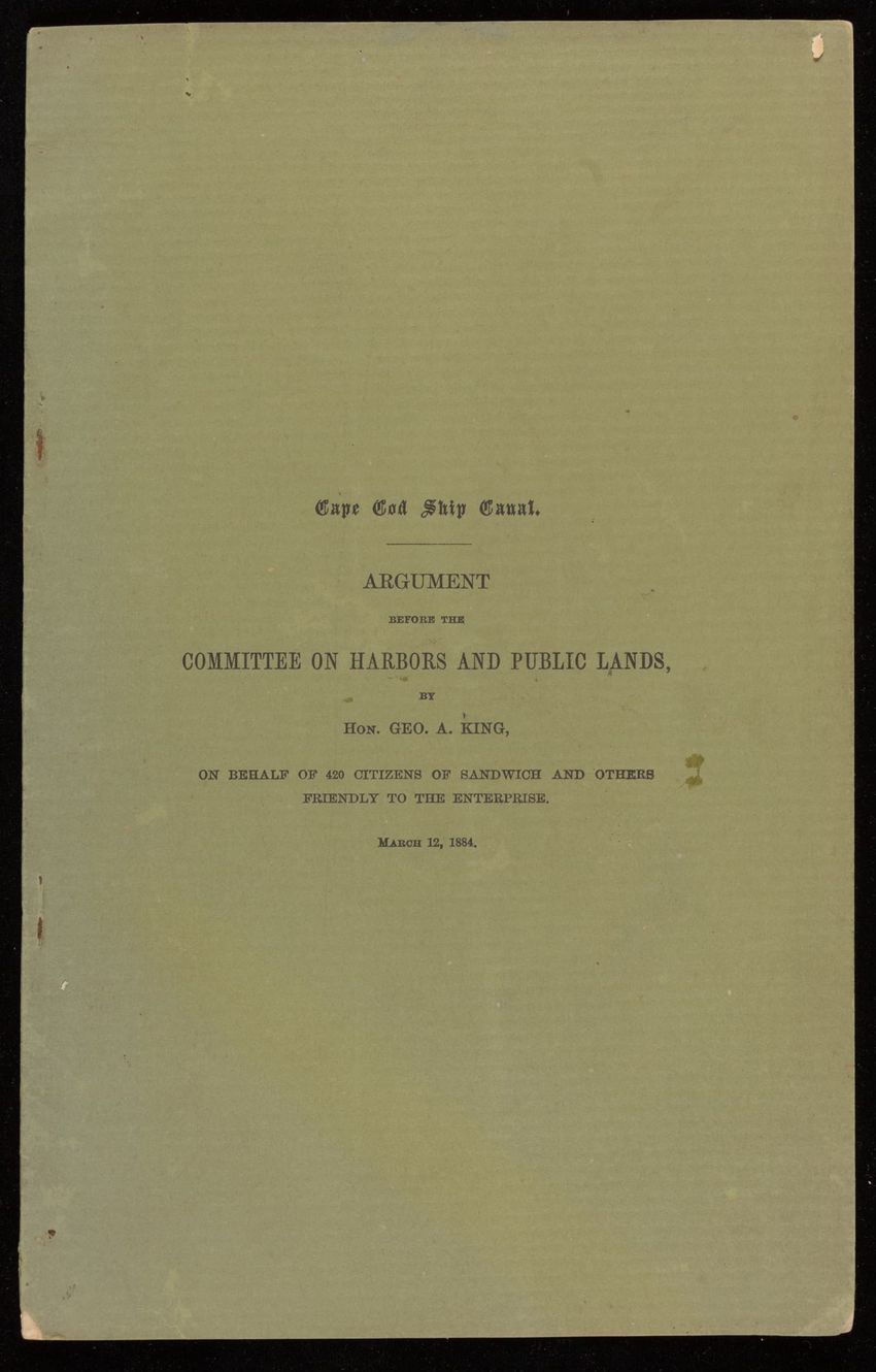 Presented to the Committee on Harbors and Public Lands, this speech was written by Hon. Geo. A. King "on behalf of the 420 citizens of Sandwich and others friendly to the enterprise." King makes his case for the creation of the Cape Cod Canal through financial and practical claims.