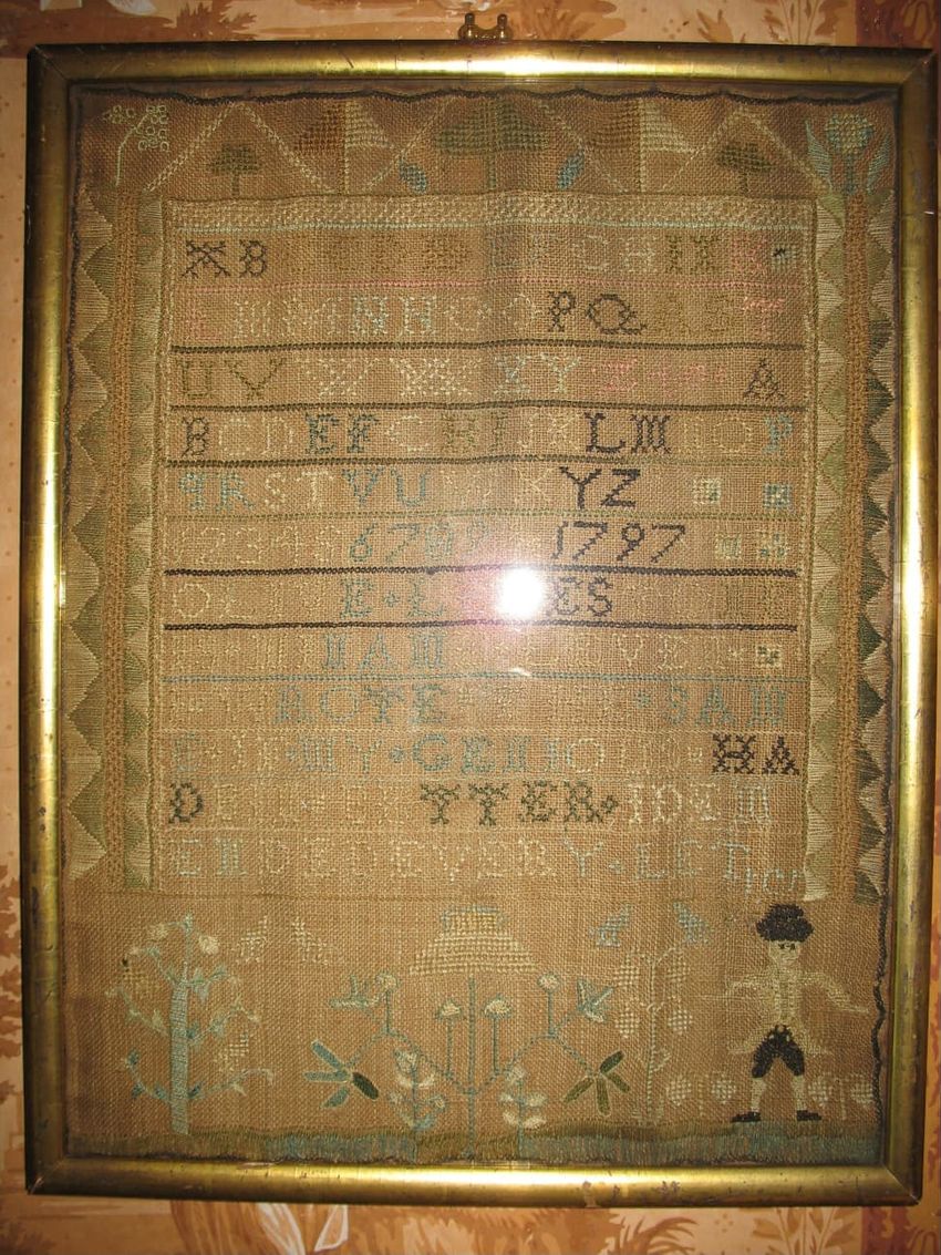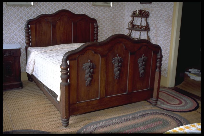 Candlestand. Woods, paint, metal. Plain round top with painted rosewood graining (black glaze over red basecoat); pedestal with tapered cylinder and ring turning terminating in elongated baluster form, ending in a layer ring and shorter vase form. Rosewood-grained pedestal, black glaze over brown...