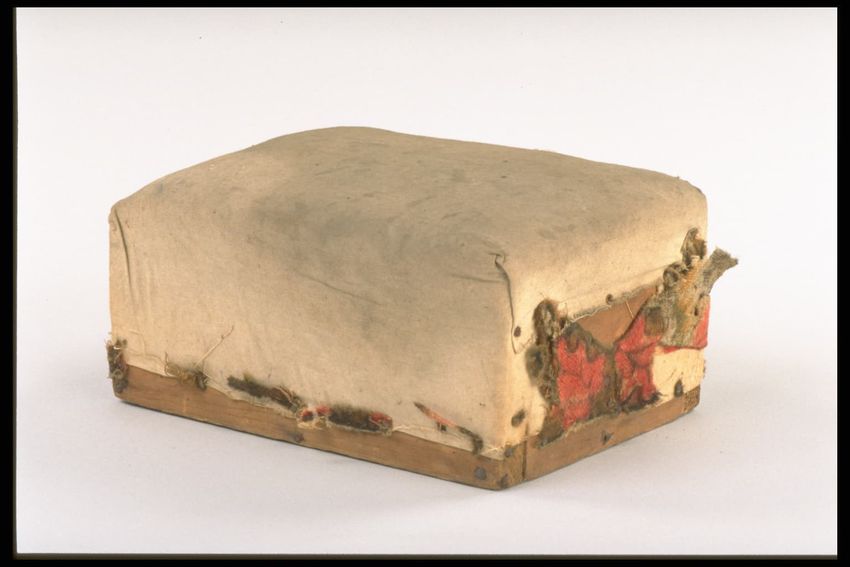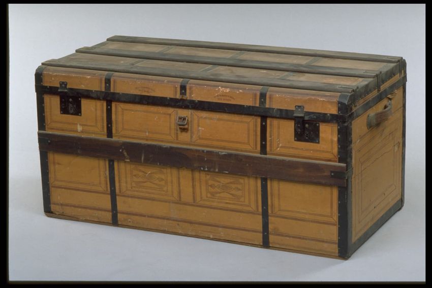 Trunk. Wood, paper with geometric pattern, metal, leather. Rectangular flat top, patterned-paper covered wood trunk with wood ribs and metal strapping; interior lined with green and white paper; heavy leather strap side handles. Contains blankets, paisley shawls, and Indian rug.
