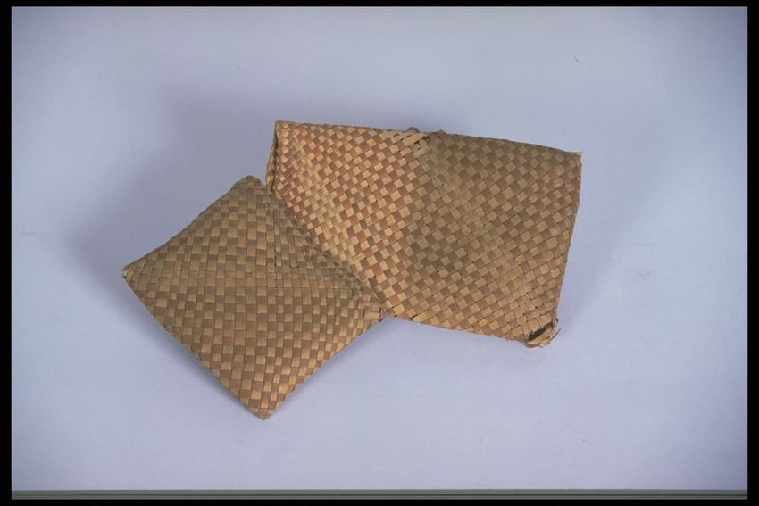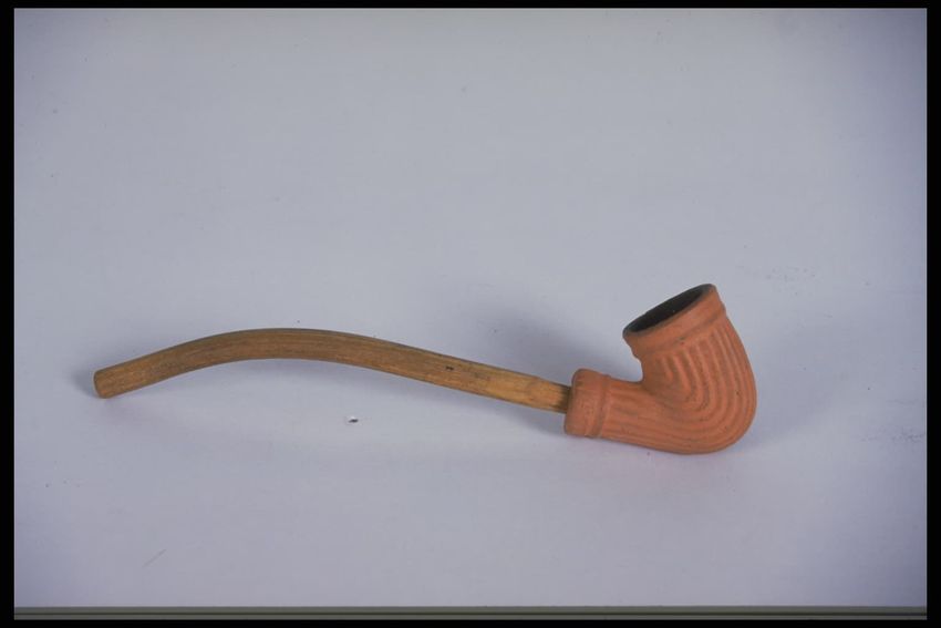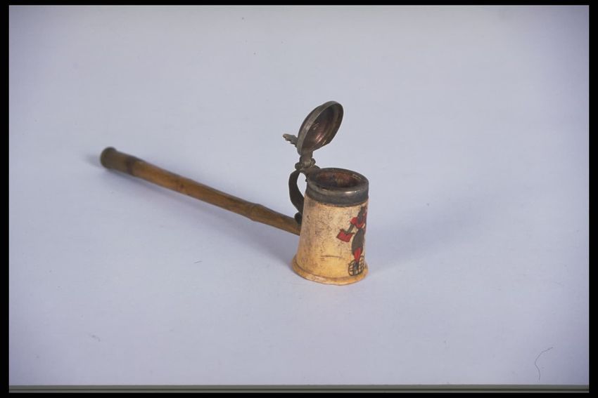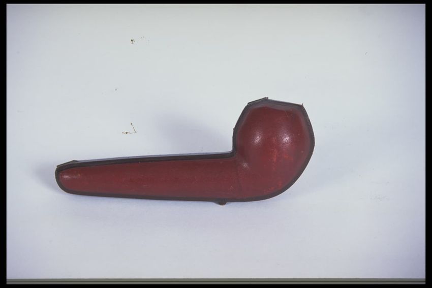 Engraved brass hexagonal ashtray w/ red enamel decoration; 3 scrolled feet; 6 cigarette rests; side scrolled on edge; red, white, blue enameled foliate patterns w/ flower in center circle of tray.