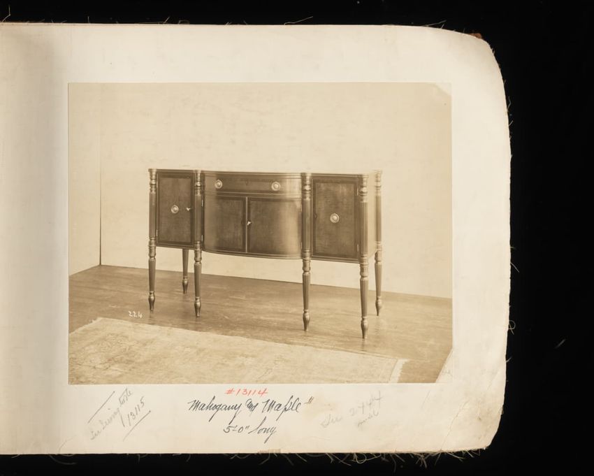 Black-and-white photograph of a desk. Chippendale-style desk has hinged slant-front which opens to reveal an interior writing surface, drawers and pigeonholes; two lopers with round pulls; four drawers with key escutcheons, bail handles and bat-wing plates; molded lower edge; center carved drop orna...