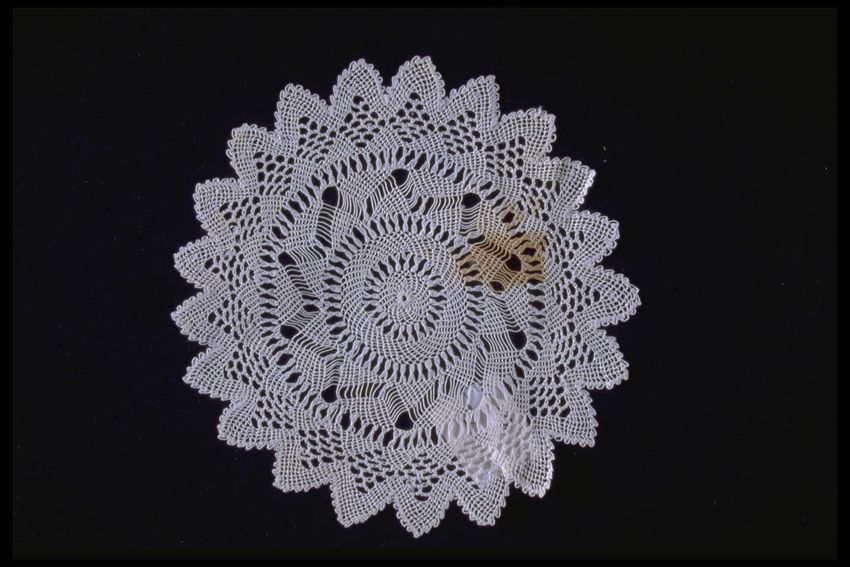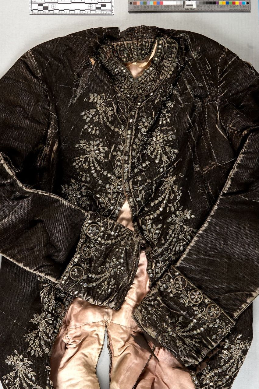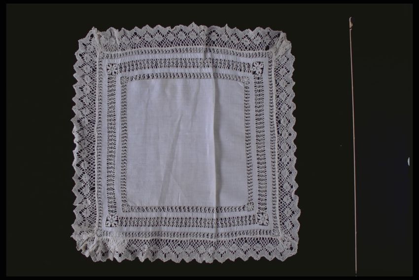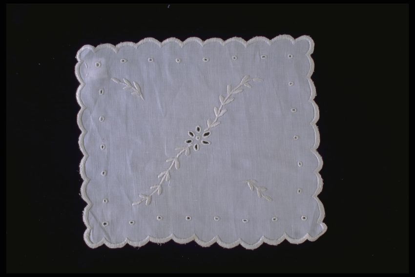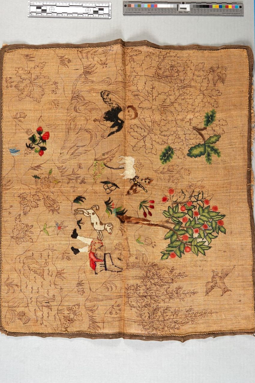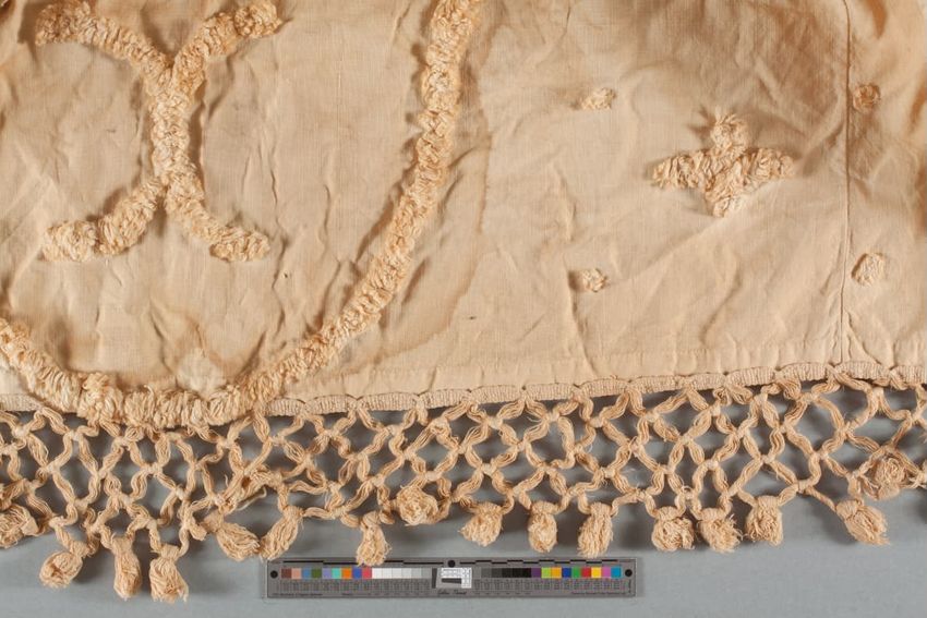 Reproduction polychrome bed hangings with crewel embroidery in a floral design. a,b) side valances with scalloped edges c) foot valance d) headcloth e,f) head curtains g) counterpane h,j) bases