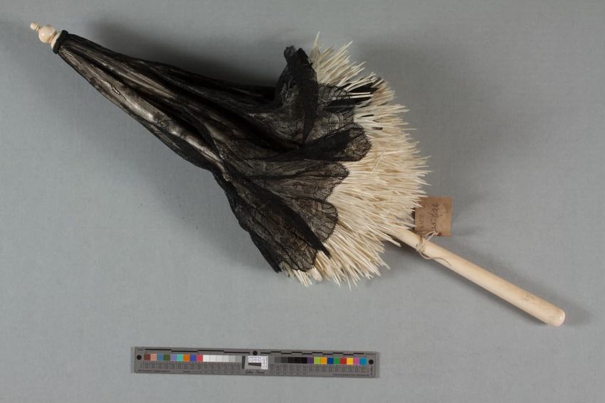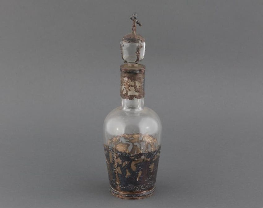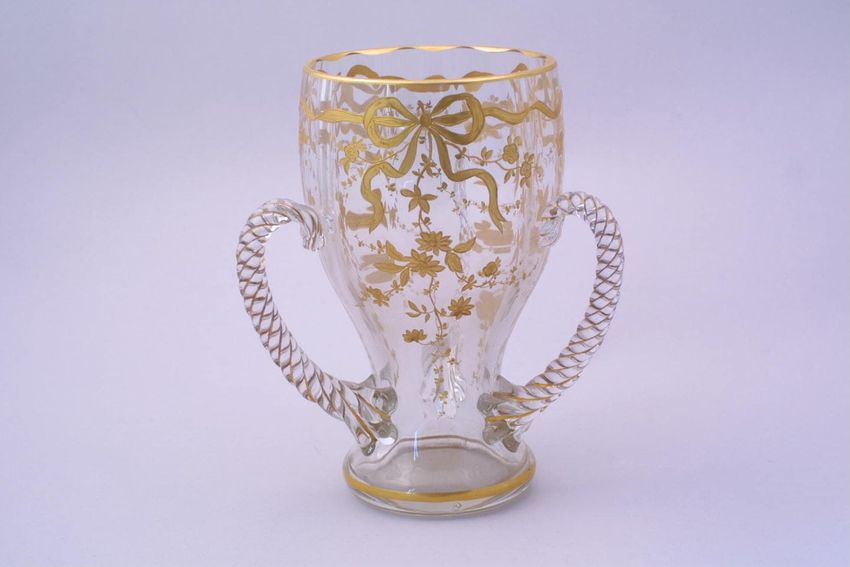 Glass vase with a round base, slender stem, a flower-like body with a pinched petal-like mouth, and petal or leaf luster glass decorations on the sides. Original Tiffany sticker on the bottom. Gold with red and white decoration.